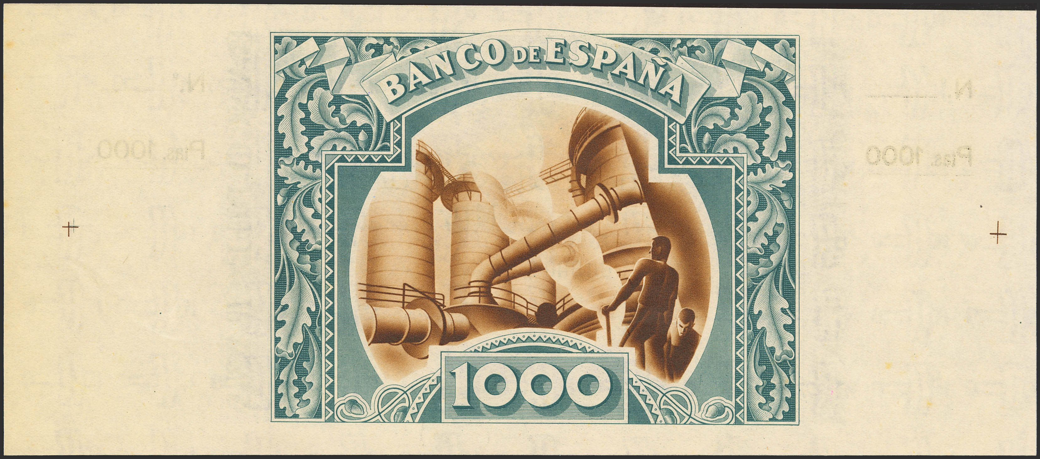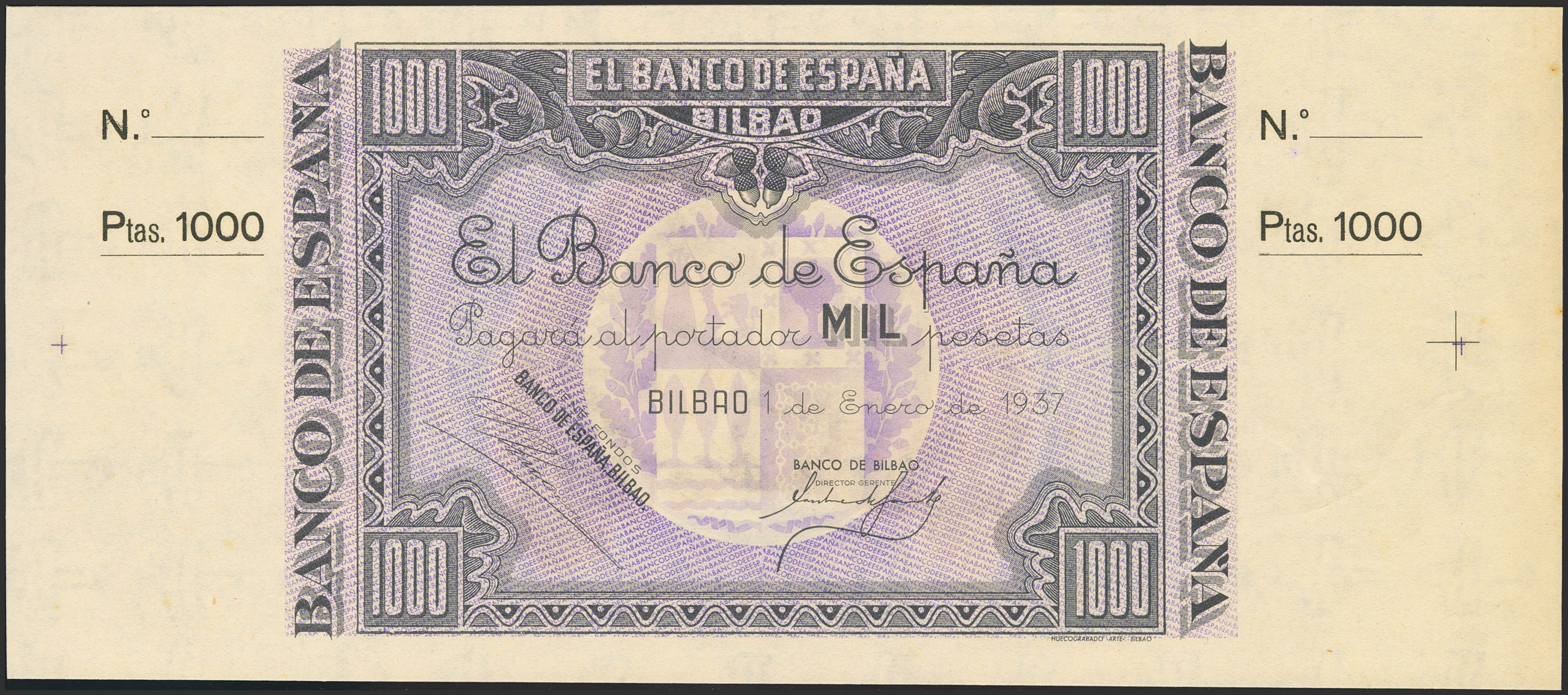 English 1000 Pesetas. January 1, 1937. Bilbao branch, Banco de Bilbao signature. Not issued, without series and without numbering, with both matrices. (Edifil 2023: NE27a). Original marking, typical time points. Uncirculated-.