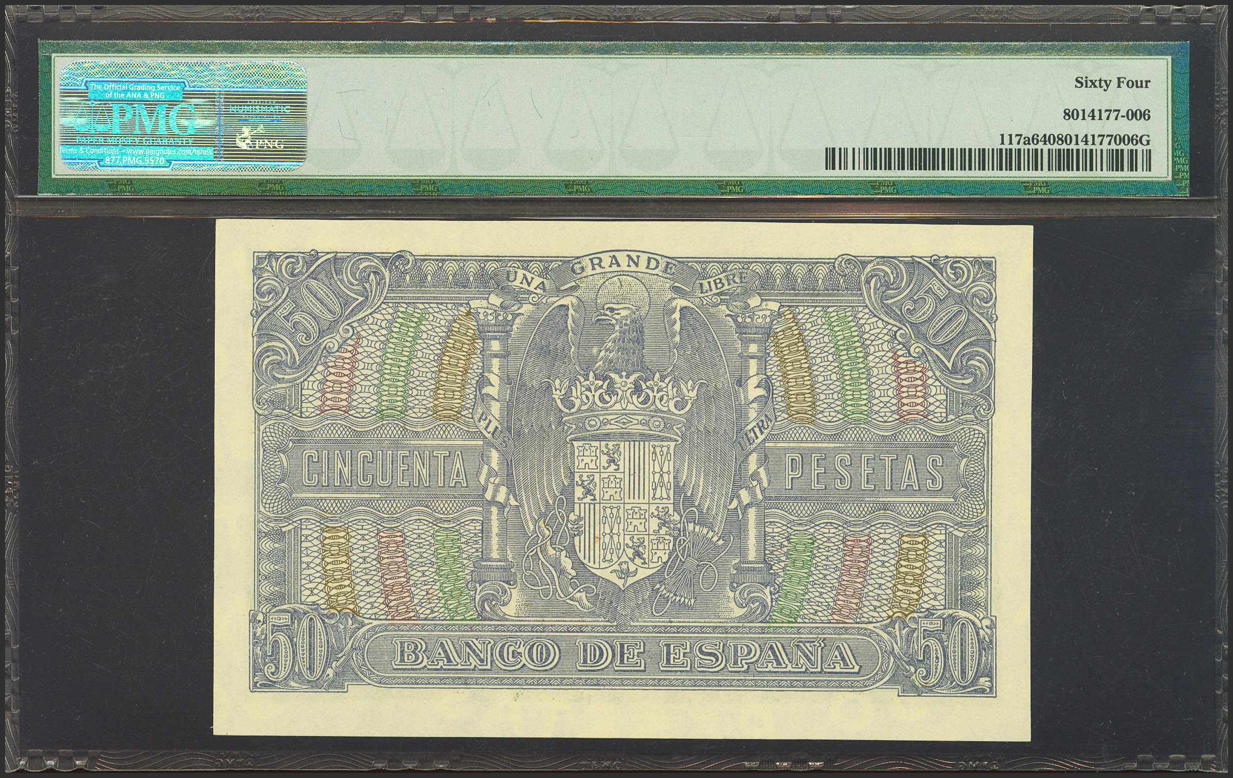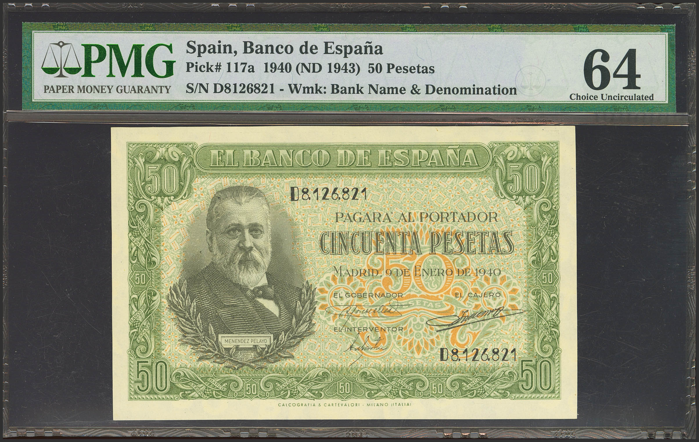 50 Pesetas. January 9, 1940. Series D. (Edifil 2023: 437a, Pick: 117a). Unusual in this quality. Uncirculated. Encapsulated PMG64.