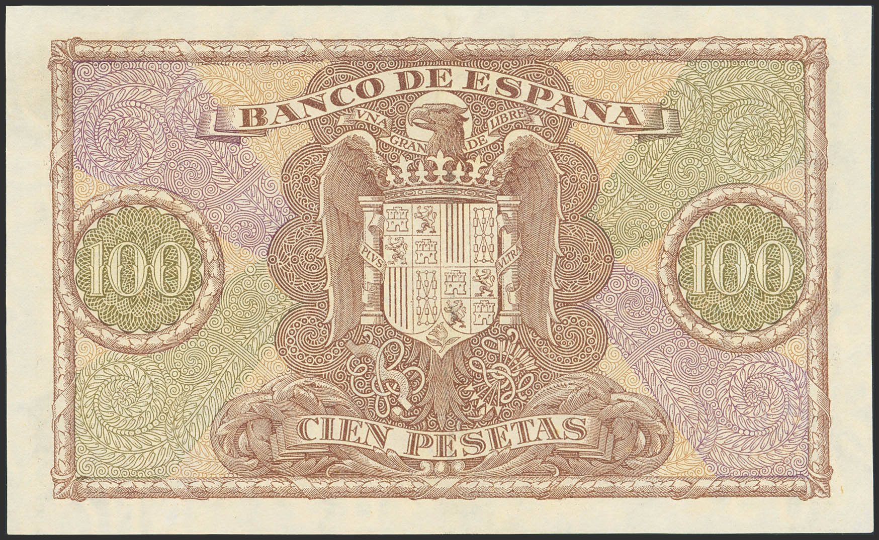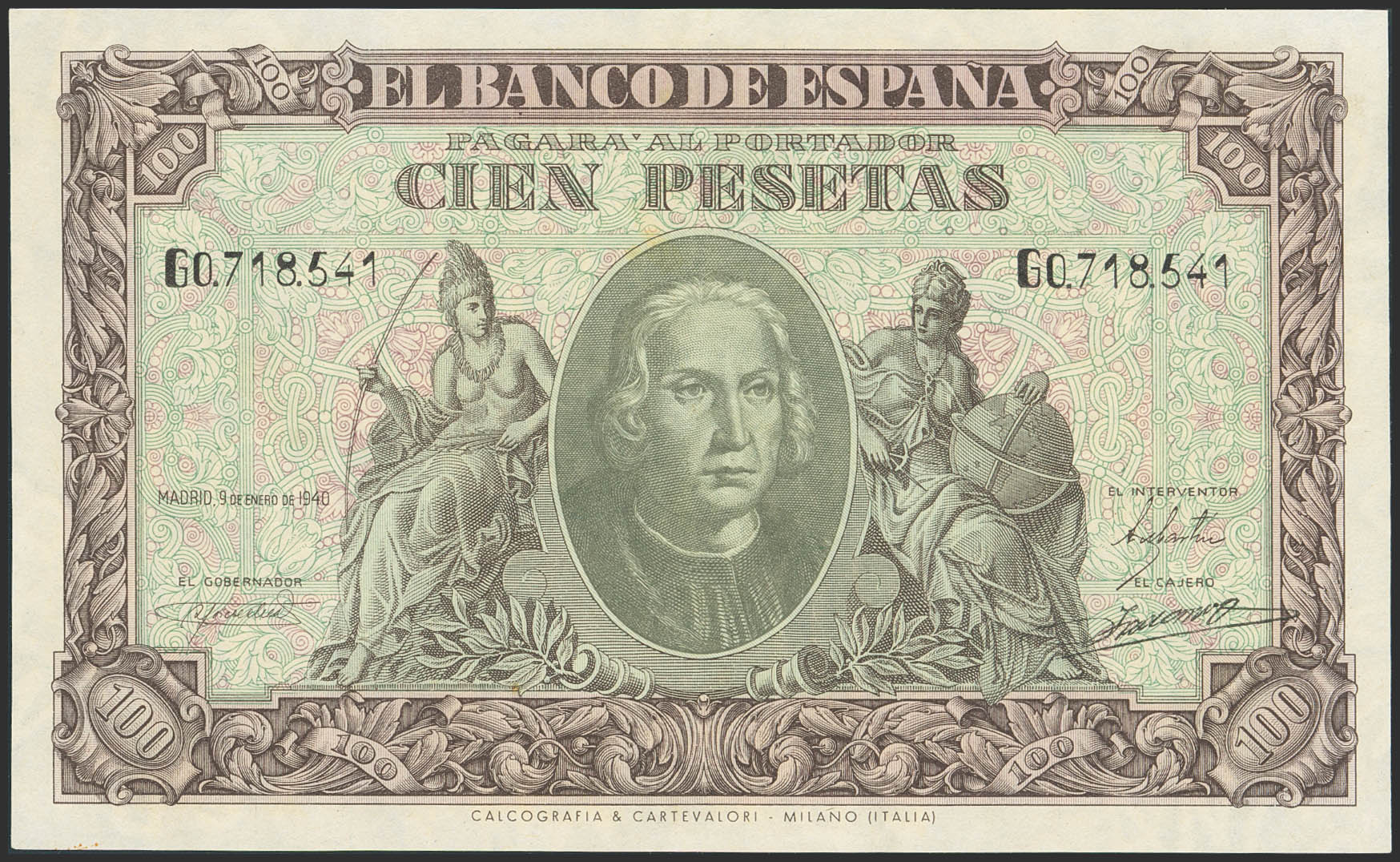 100 Pesetas. January 9, 1940. Series G. (Edifil 2023: 438a). Original marking. Good Extremely Fine+.