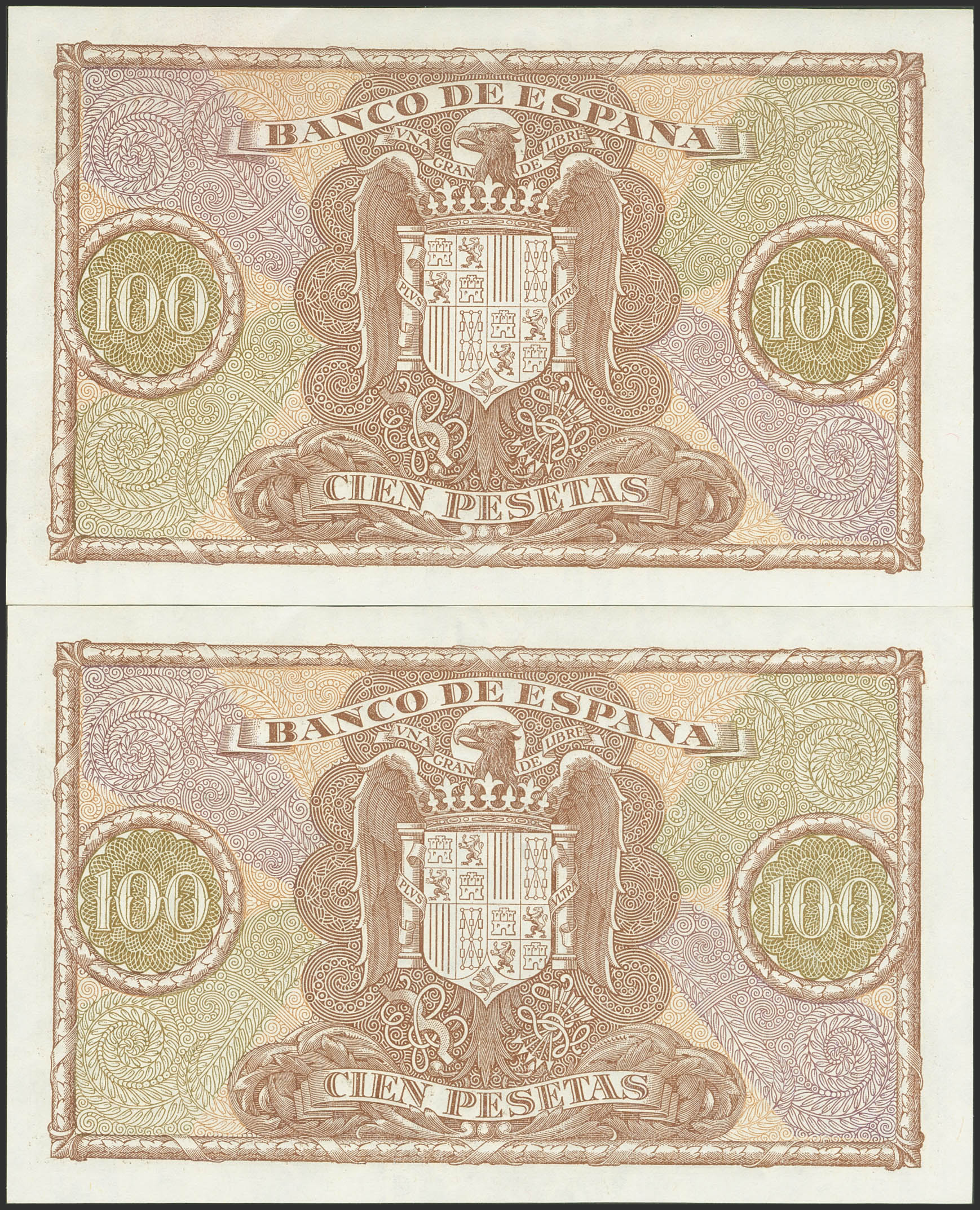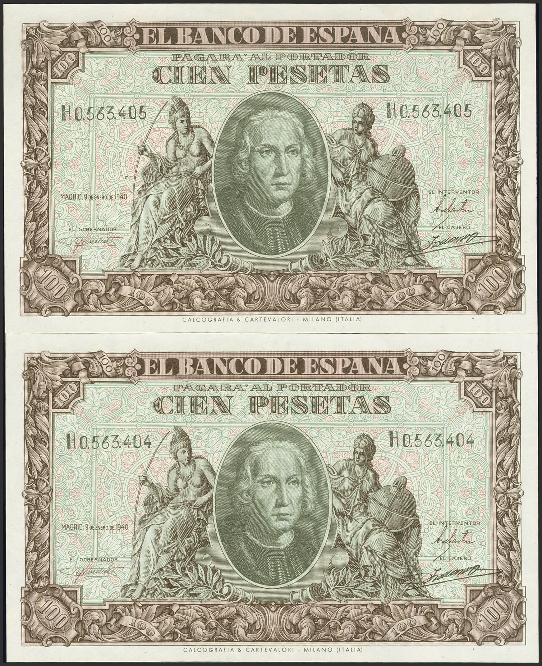 100 Pesetas. January 9, 1940. Correlative pair. Series H. (Edifil 2021: 438a). Unusual and original marking. Uncirculated-.