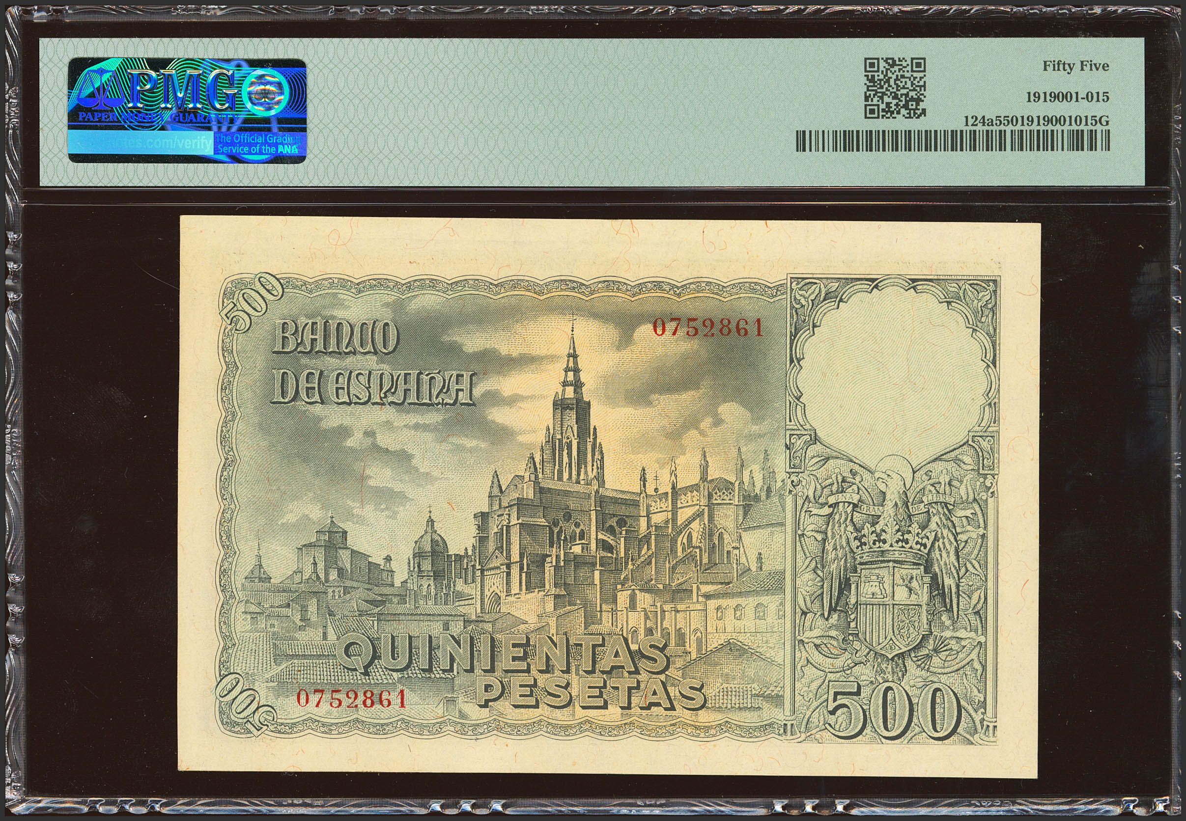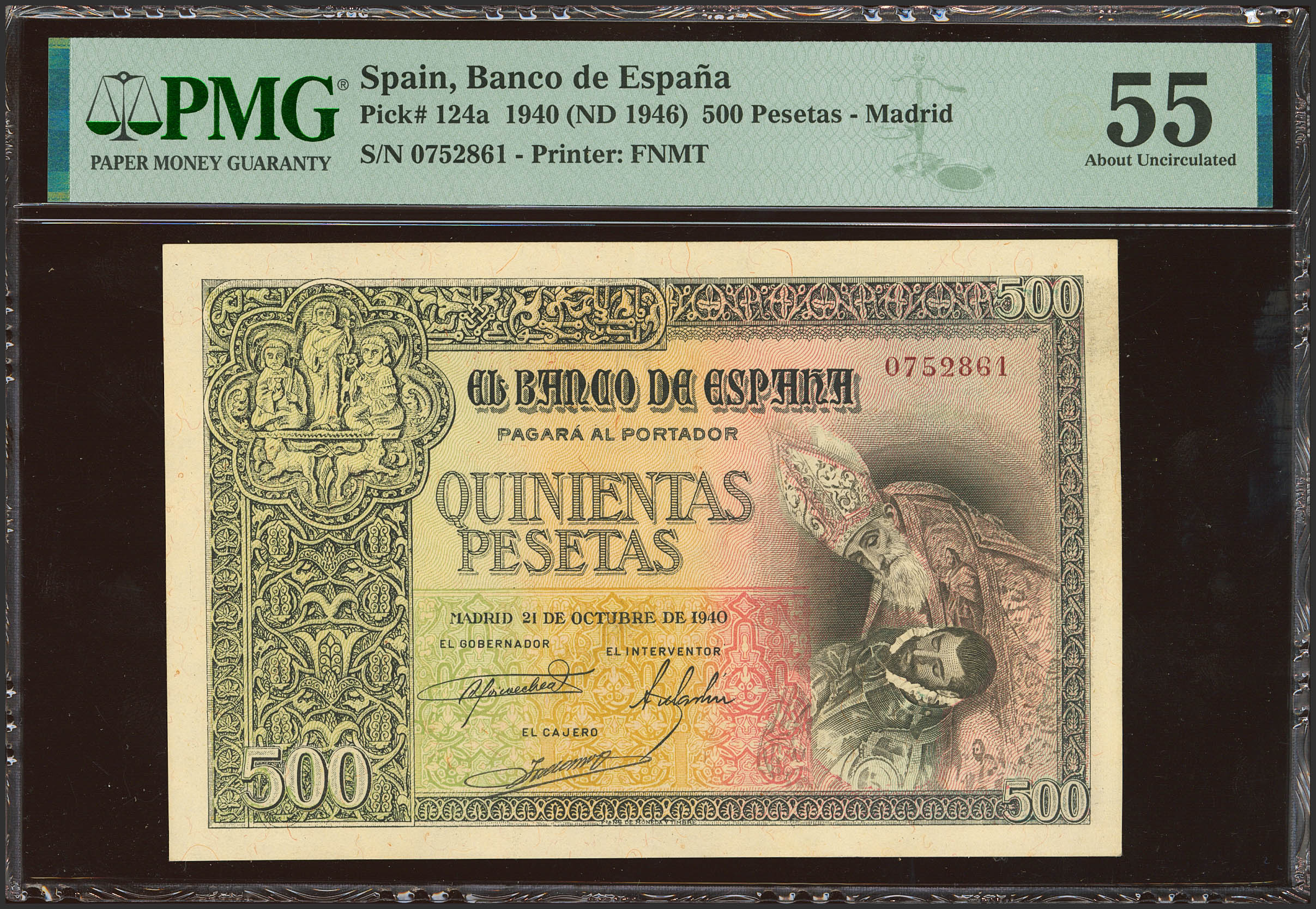 500 Pesetas. October 21, 1940. No series. (Edifil 2021: 444, Pick: 124a). Rare in this exceptional quality. Good Extremely Fine+. Encapsulated PMG55.