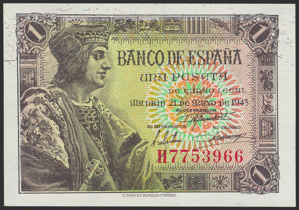 1 Peseta. May 21, 1943. Series H. (Edifil 2021: 447a). Original marking. Uncirculated.