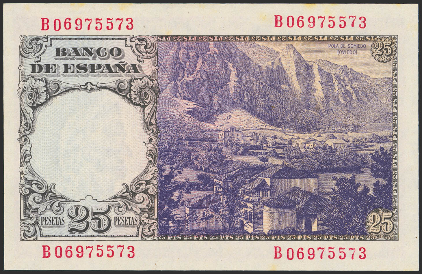 25 Pesetas. February 19, 1946. Series B. (Edifil 2021: 450a). Original marking, age spots. Uncirculated-.