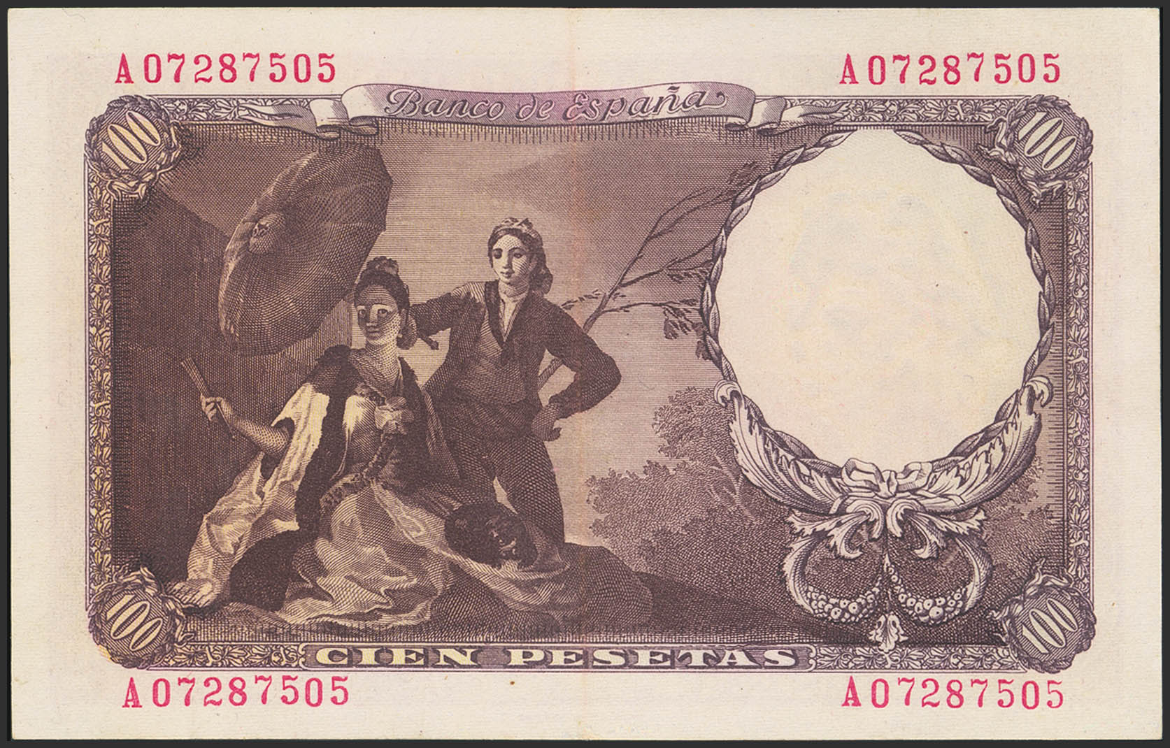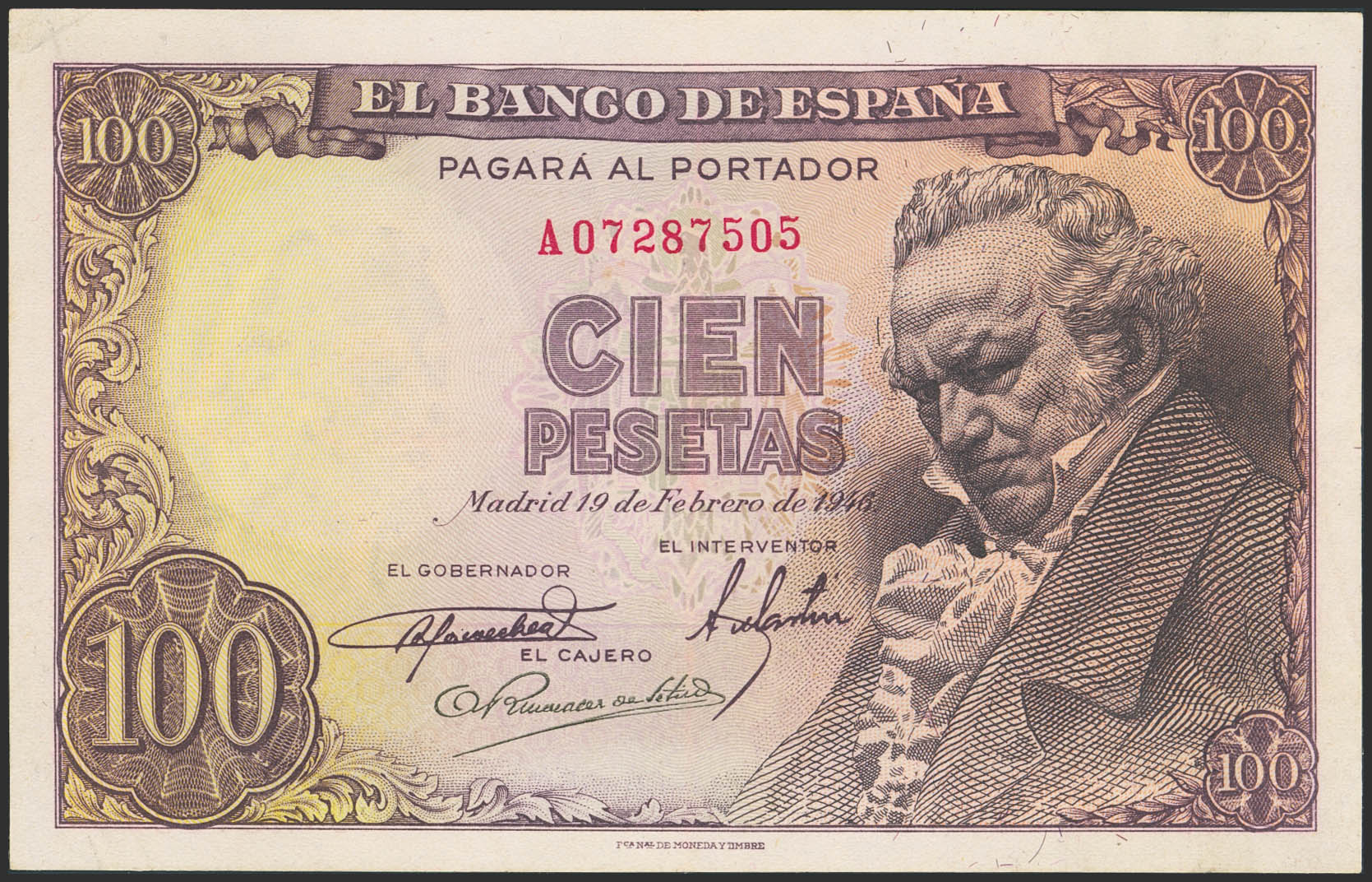 100 Pesetas. February 19, 1946. Series A. (Edifil 2023: 451a). Good Extremely Fine.