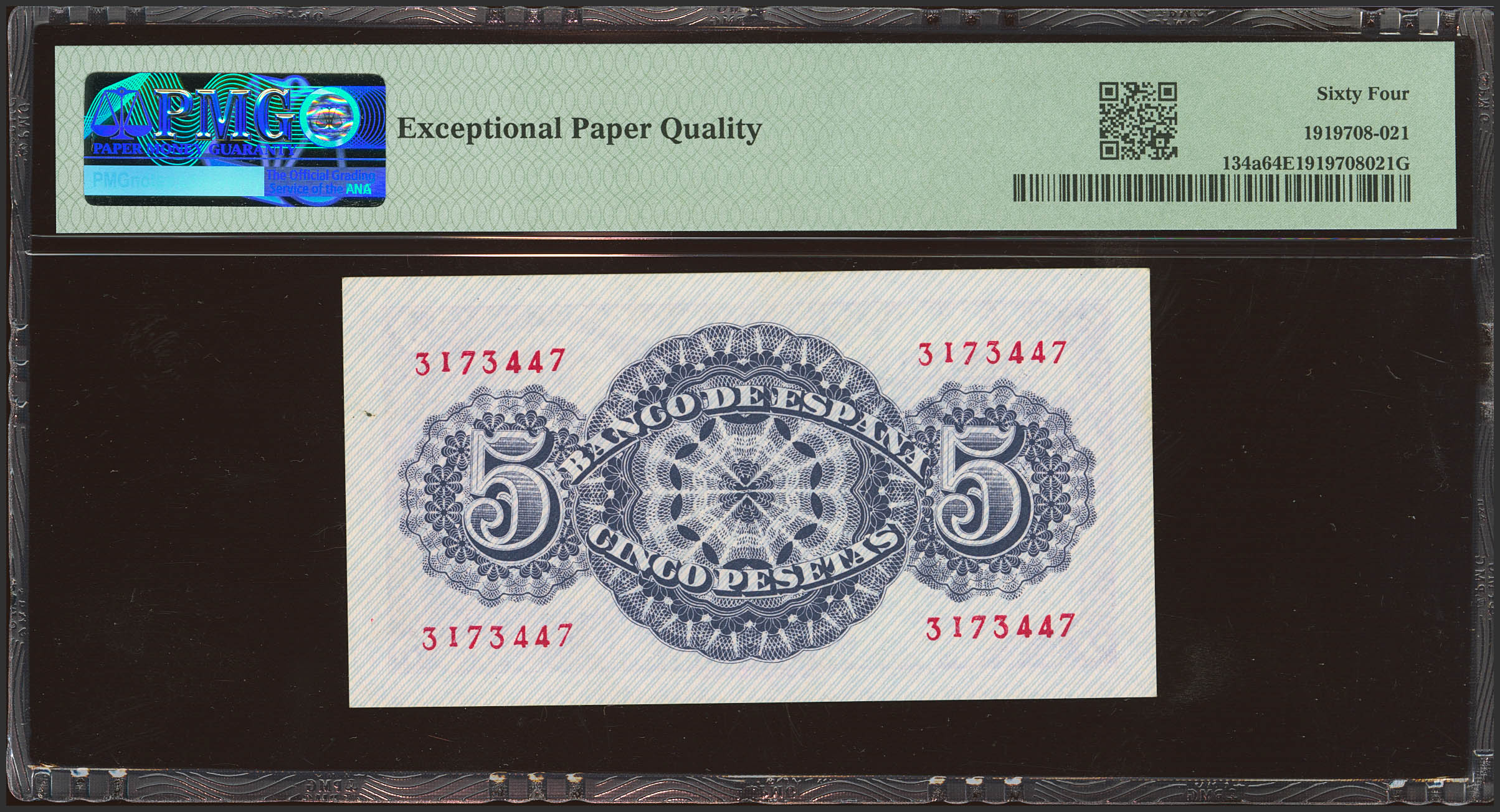 5 Pesetas. April 12, 1947. No series. (Edifil 2023: 454, Pick: 134a). Rare in this quality, original finish. Uncirculated. Encapsulated PMG64EPQ.