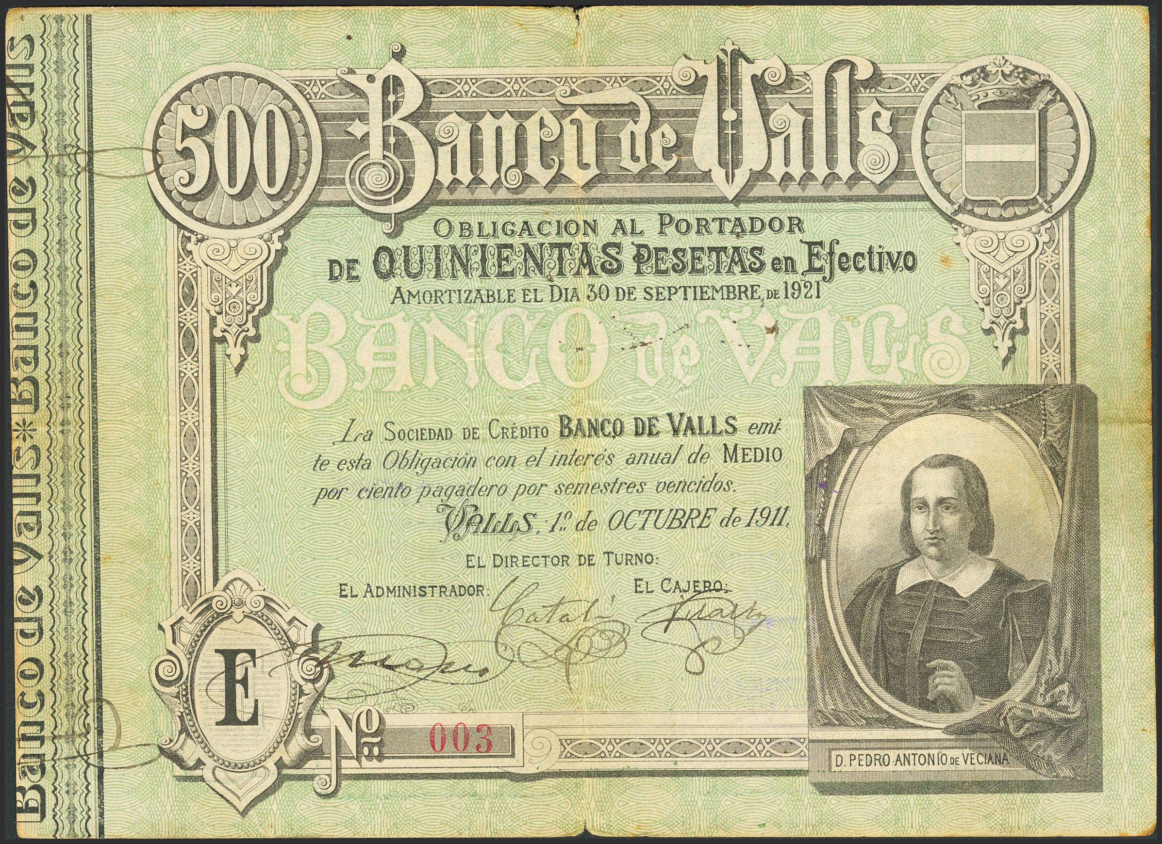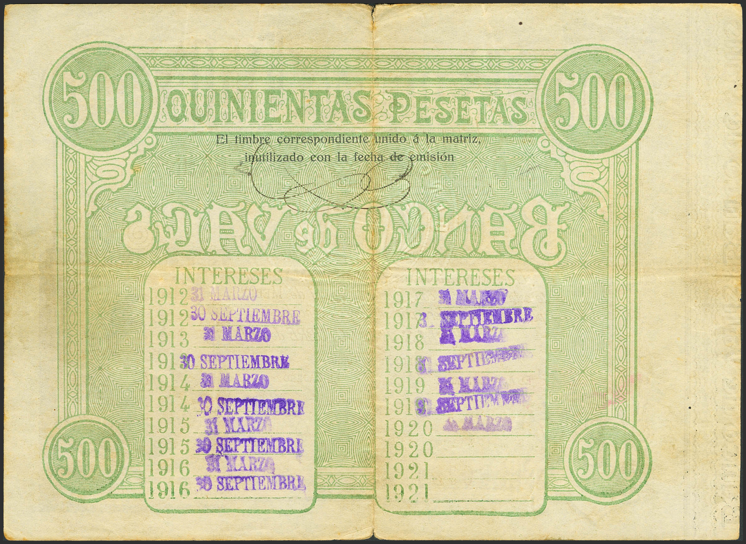 English 500 Pesetas. October 1, 1911. Series E, numbered 003 and original signatures. (Ruiz and Alentorn: 934). Very rare in circulation. VF-.
