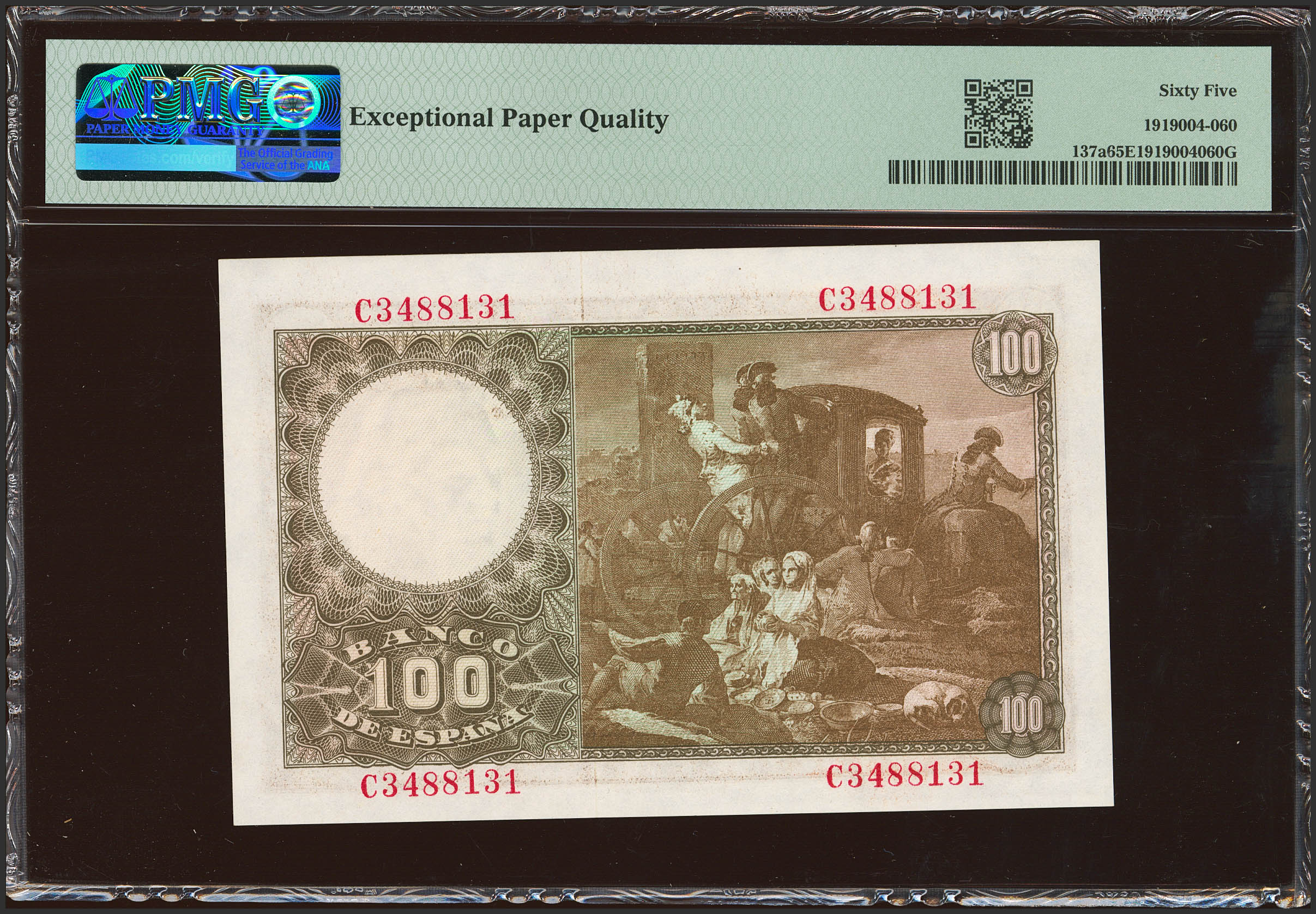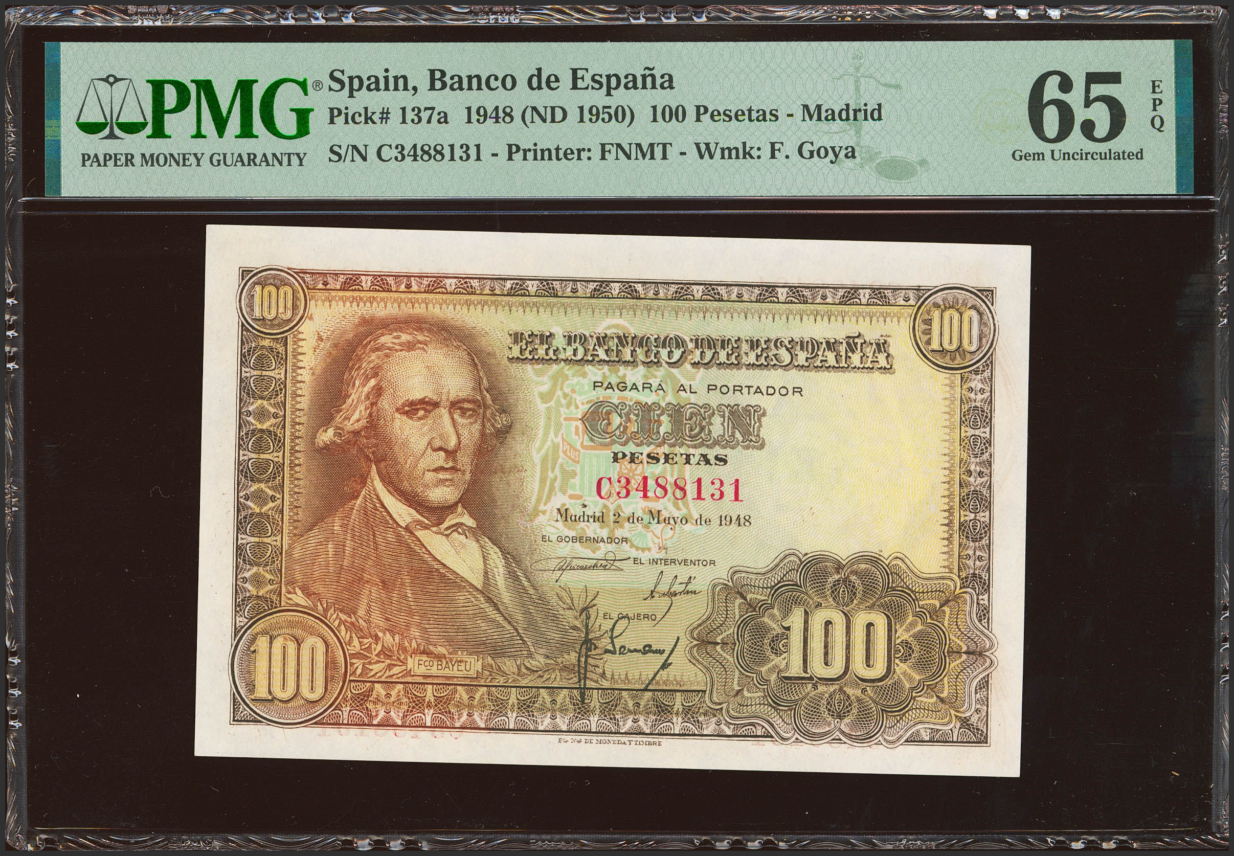 100 Pesetas. May 2, 1948. Series C. (Edifil 2023: 456a, Pick: 137a). Rare in this exceptional quality, original finish. Uncirculated. Encapsulated PMG65EPQ.