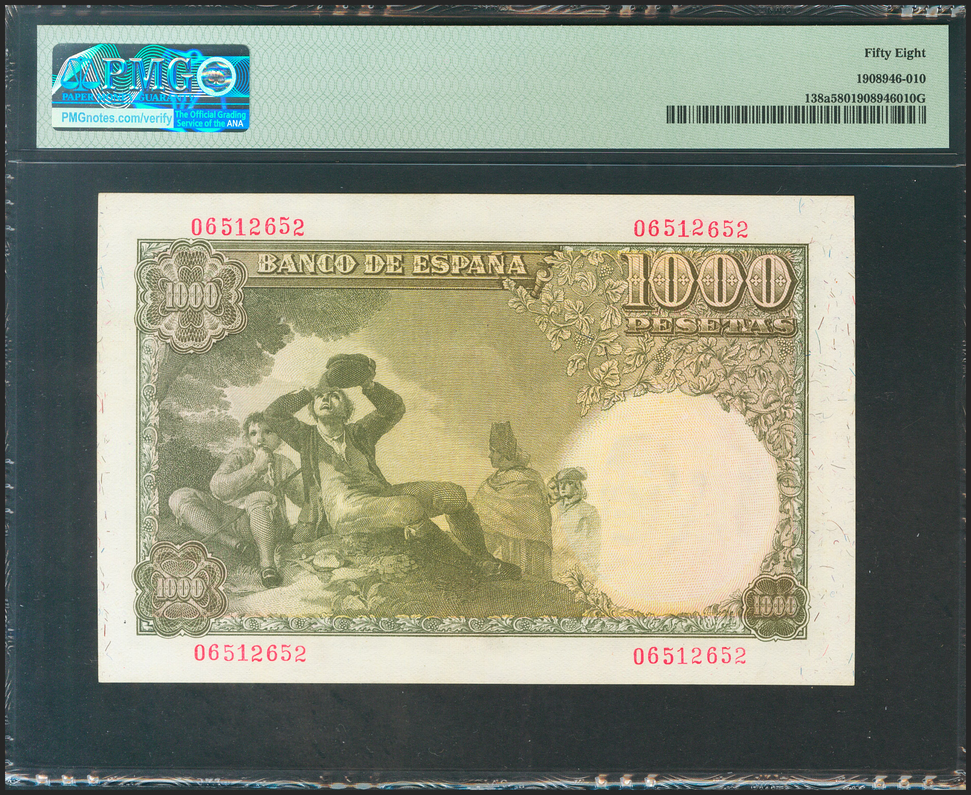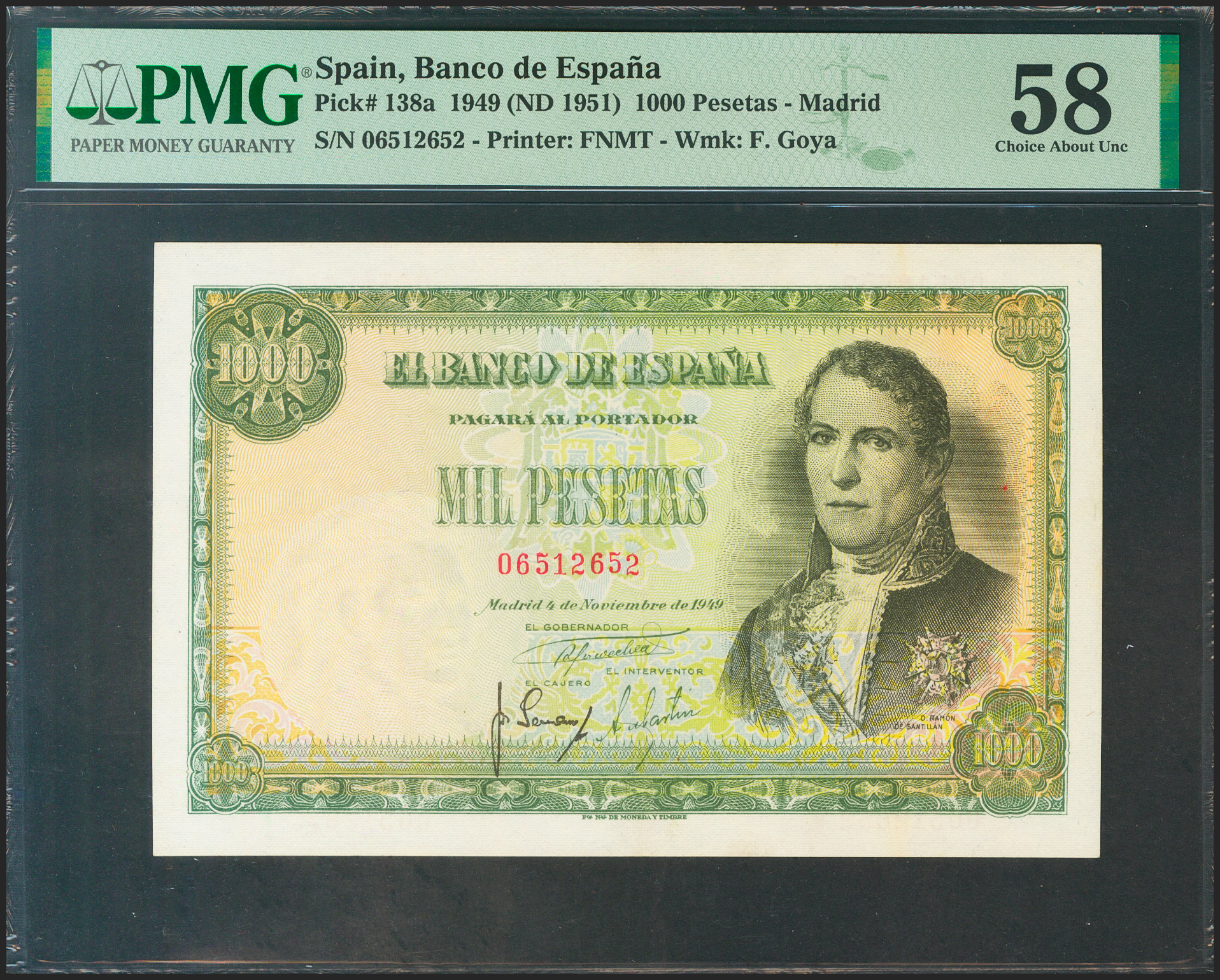1000 Pesetas. November 4, 1949. No series. (Edifil 2021: 458, Pick: 138a). Rare in this quality. Good Extremely Fine+. Encapsulated PMG58.