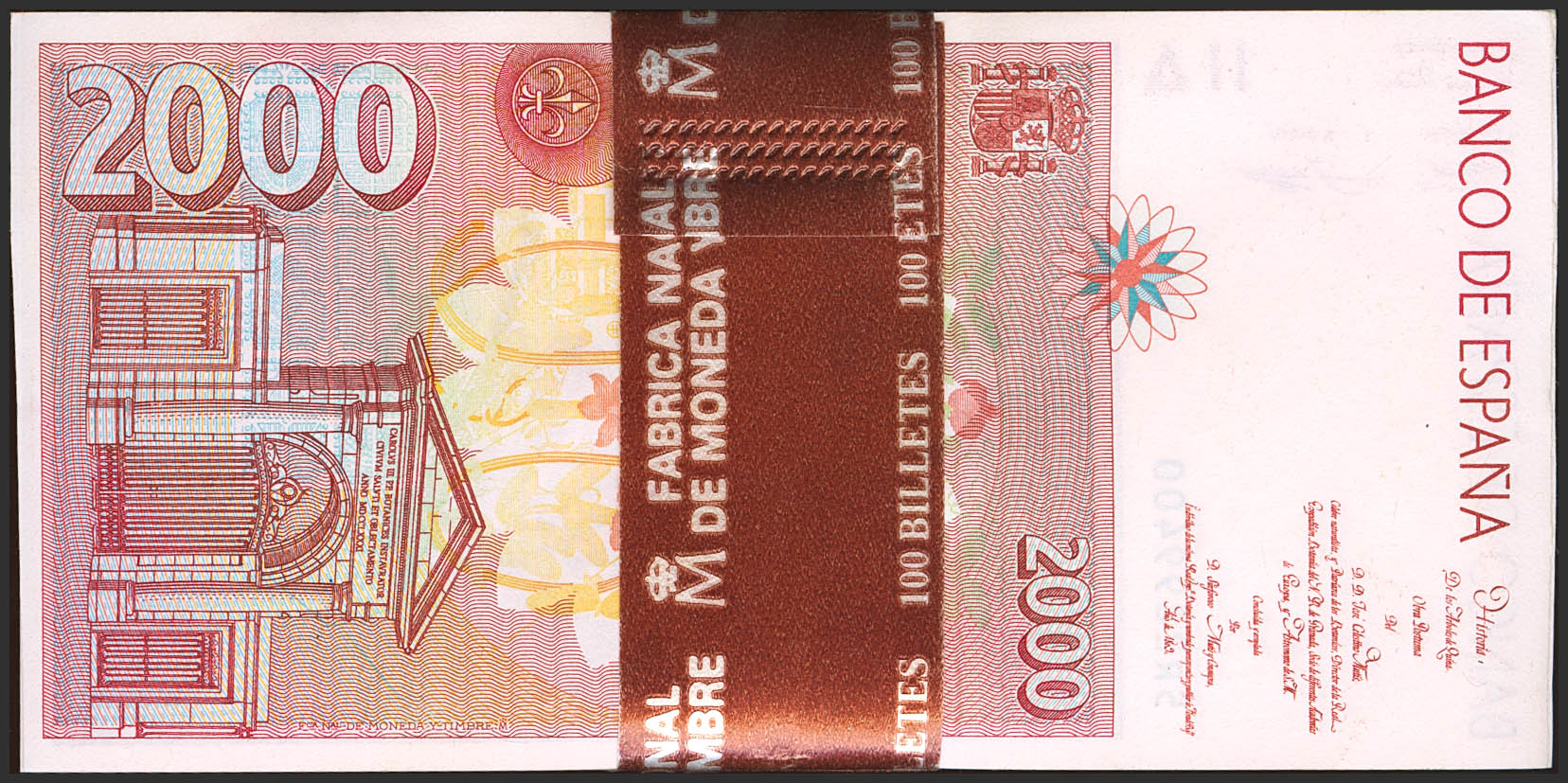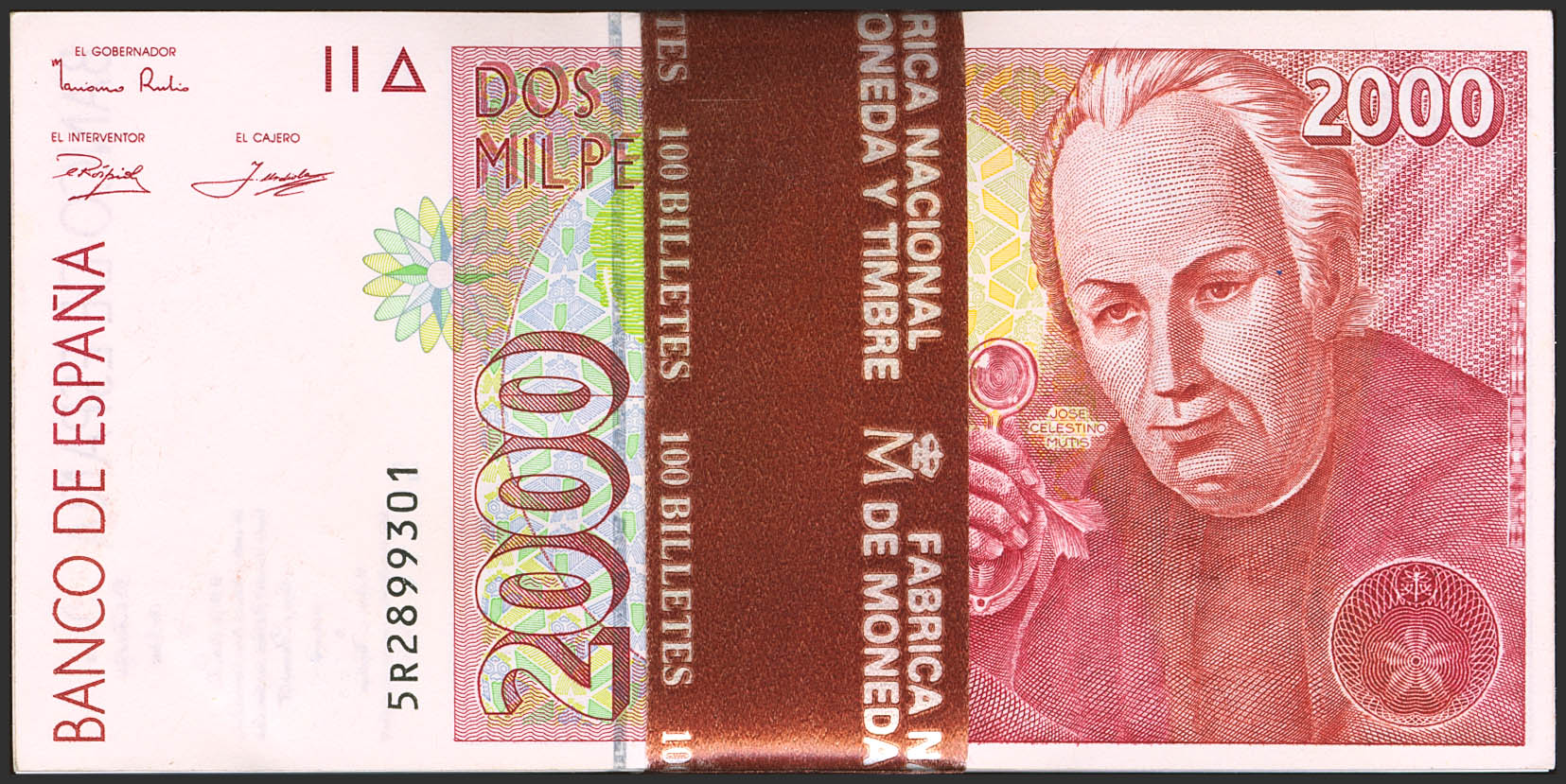 Set of 100 consecutive 2000 Pesetas banknotes issued on April 24, 1992 (design modified in 1995) and with the 5R series, in a "bundle" and with its original seal. (Edifil 2023: 482Aa). Uncirculated/Uncirculated-.