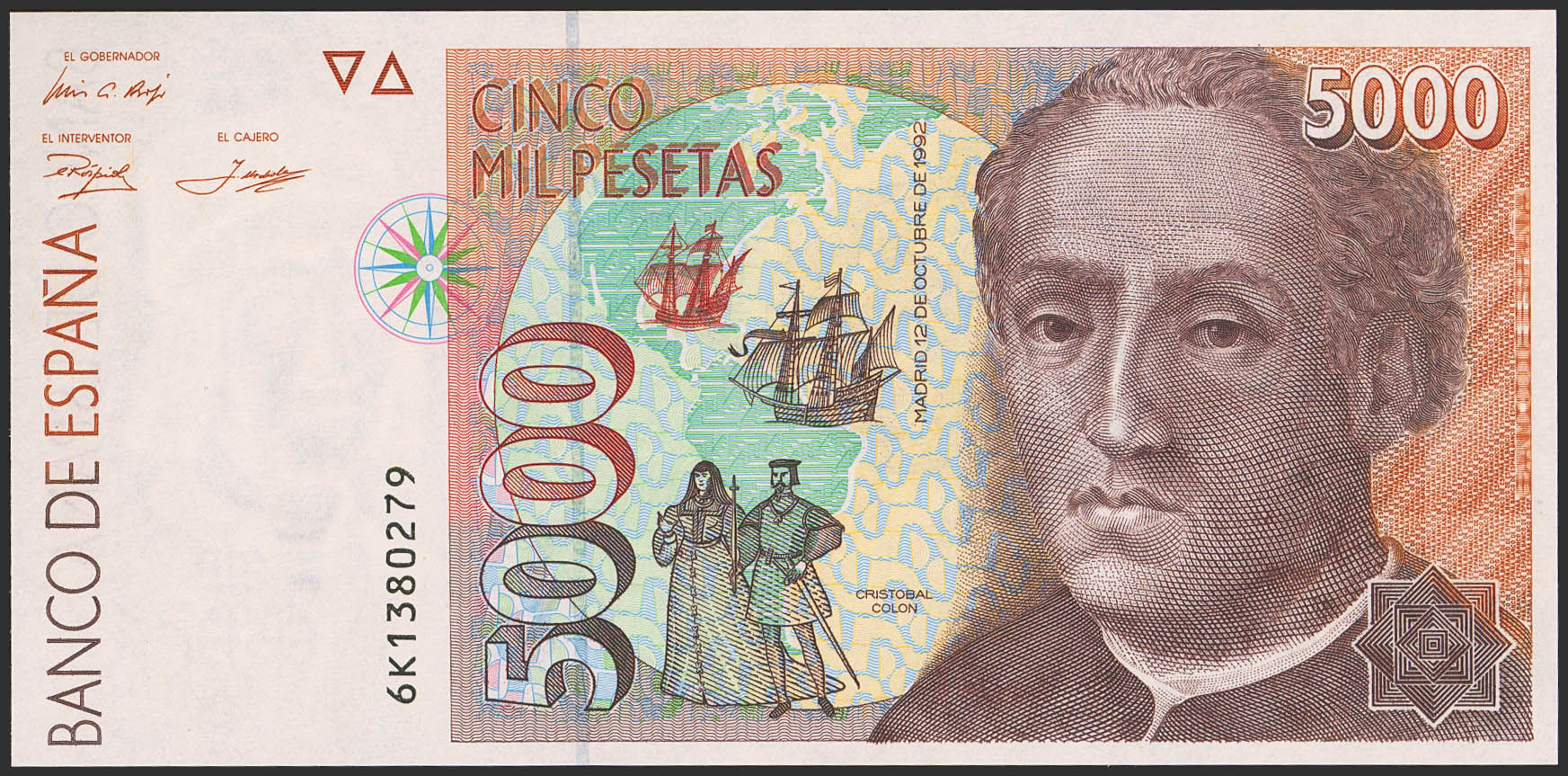 5000 Pesetas. October 12, 1992. Series 6K, last series issued. (Edifil 2023: 484aa, Pick: 165). Very rare series. Uncirculated.