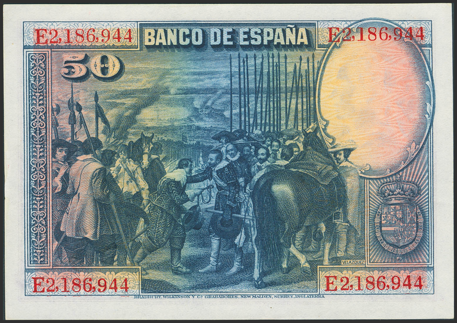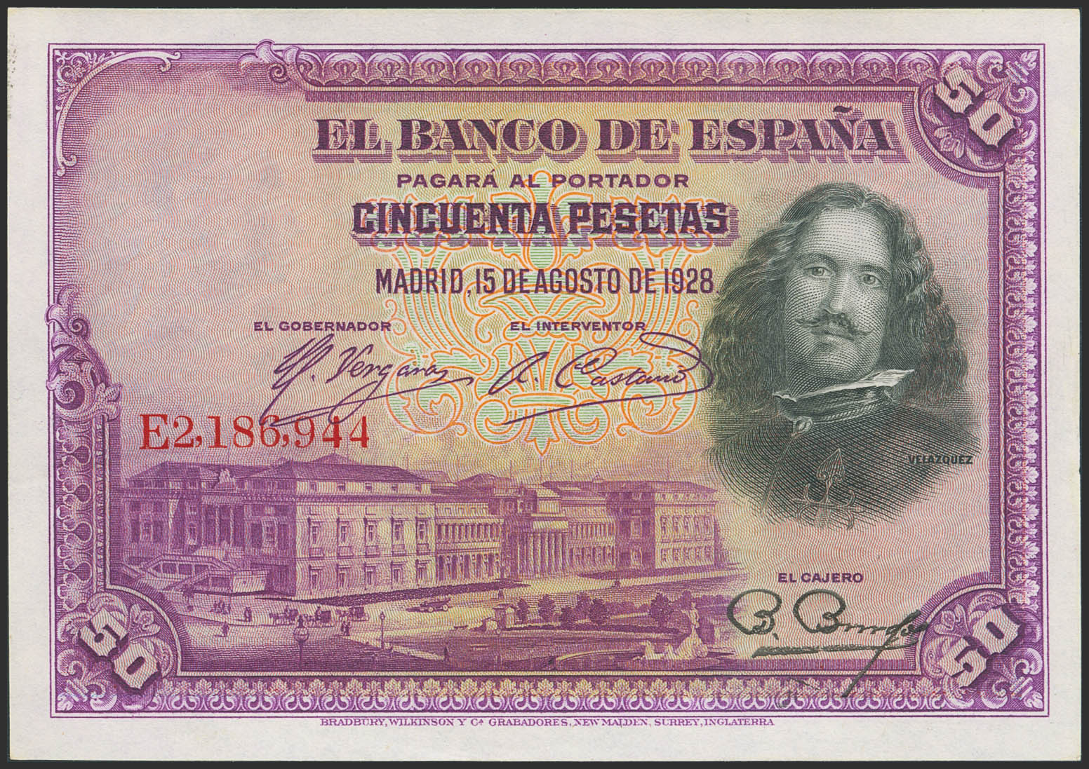 50 Pesetas. August 15, 1928. Series E. (Edifil 2021: 354). Original marking. Uncirculated-.