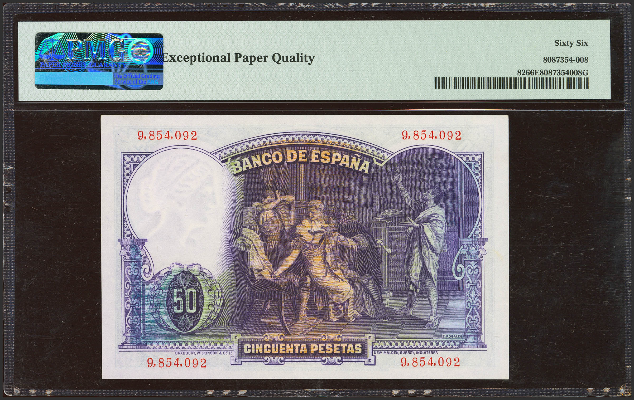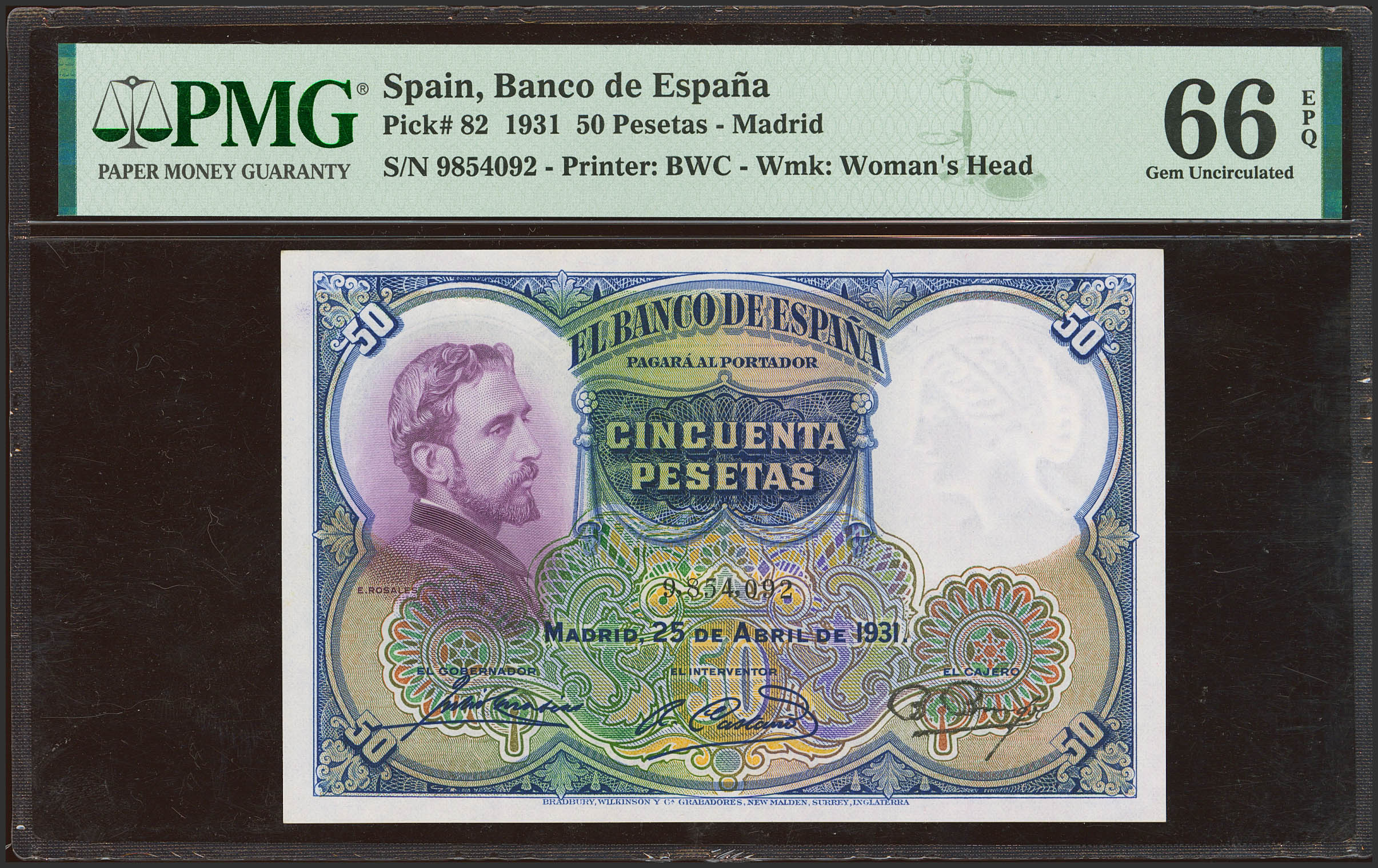 50 Pesetas. April 25, 1931. No series. (Edifil 2023: 359, Pick: 82). Rare in this exceptional quality, original finish. Uncirculated. Encapsulated PMG66EPQ.