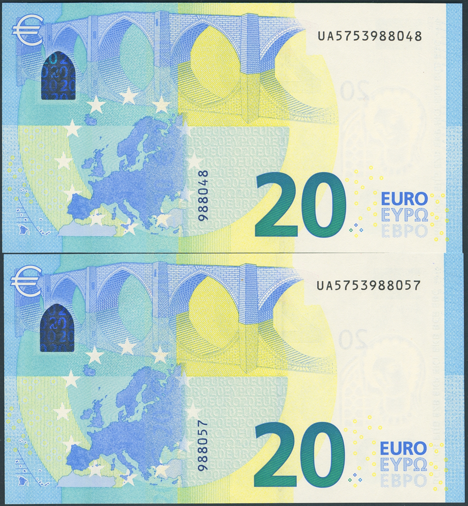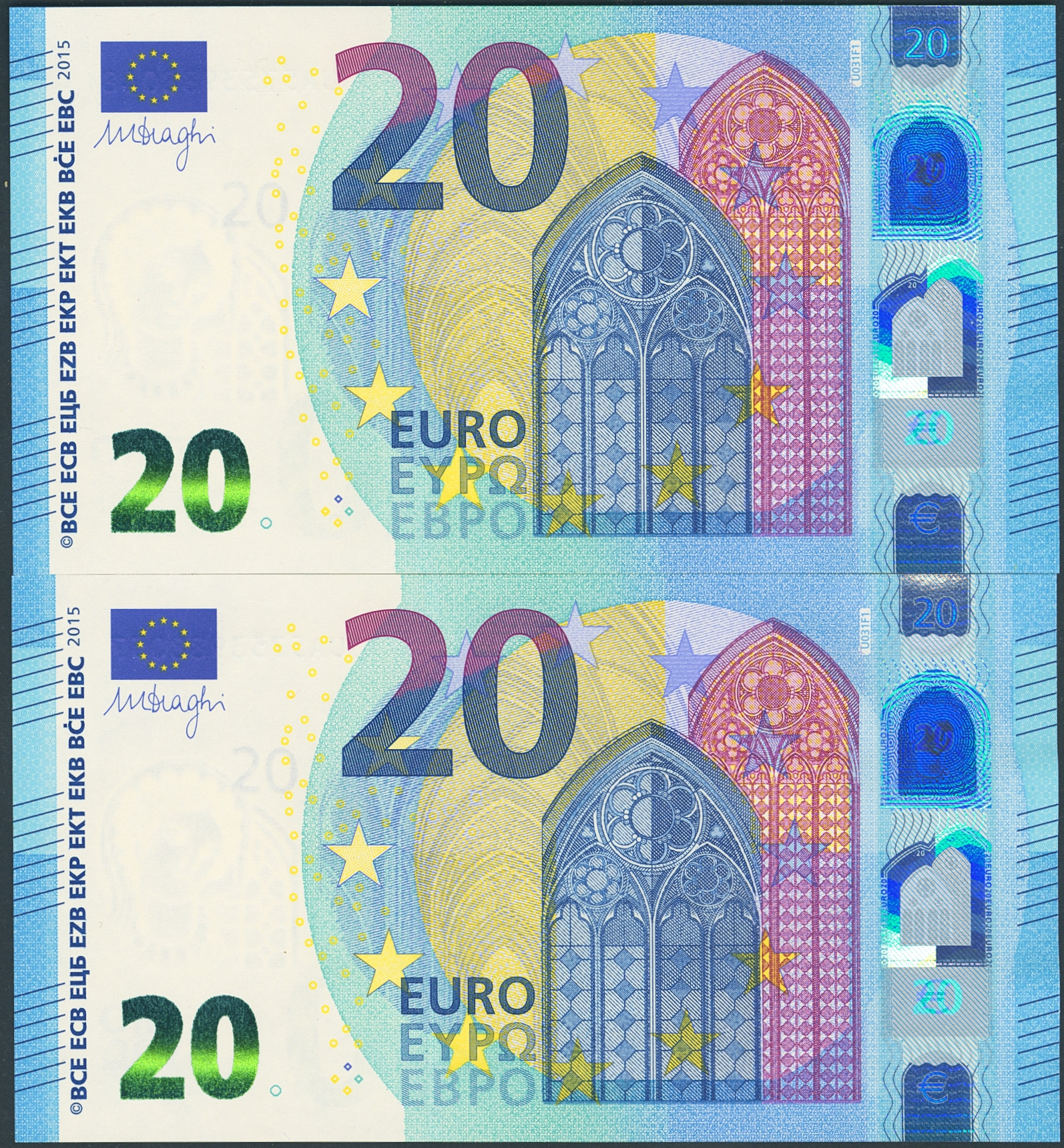 FRANCE. 20 Euros. Correlative pair (it should be recalled that the last digit of the numbering of all euro banknotes is for the internal control of the European Central Bank, the penultimate digit being the one that marks the correlation of the banknotes). 2015. Signature Draghi. Serial U (France). (Pick: 22). Uncirculated.