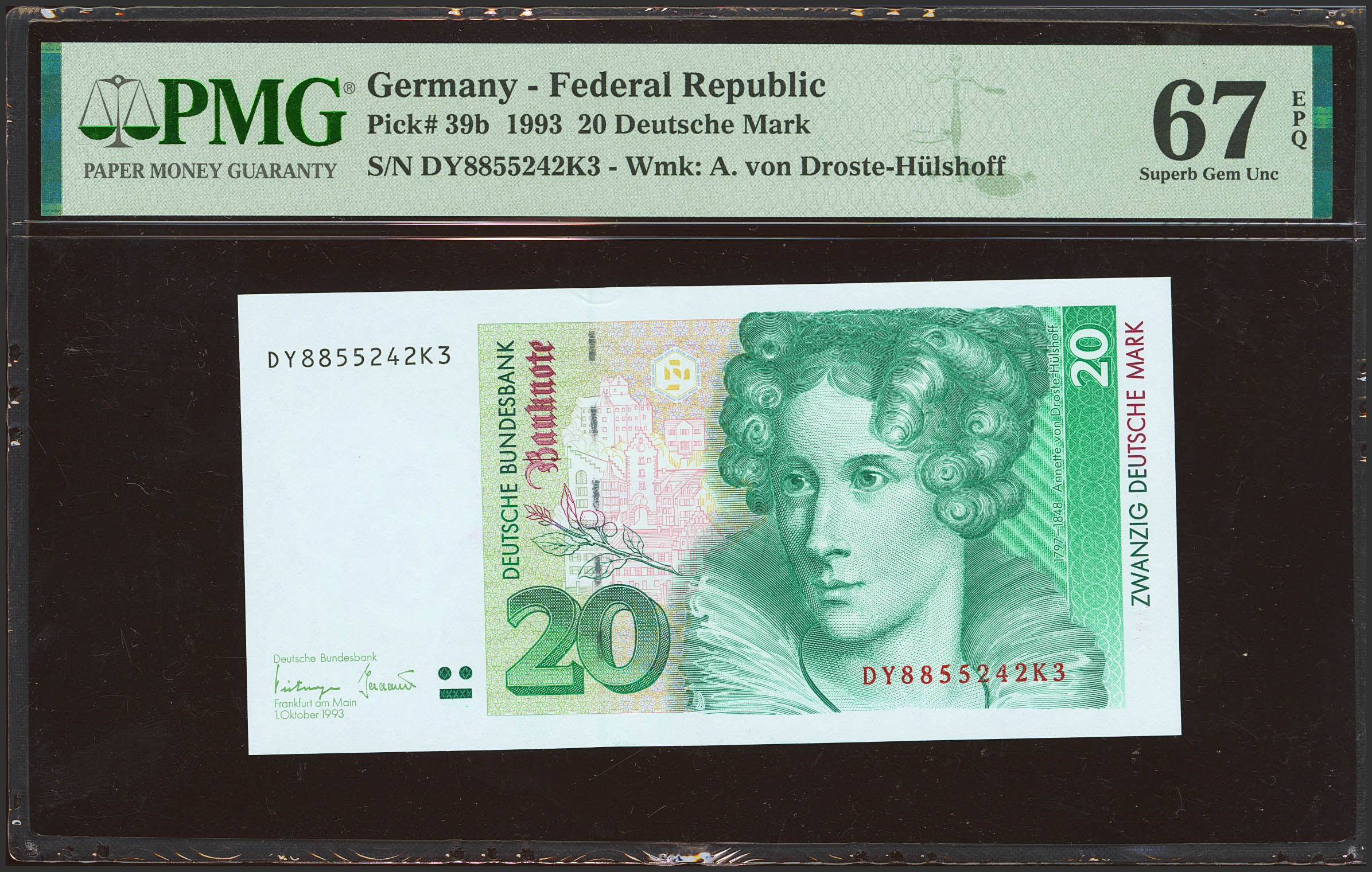 English GERMANY. 20 Marks. 1993. (Pick: 39b). PMG67EPQ.