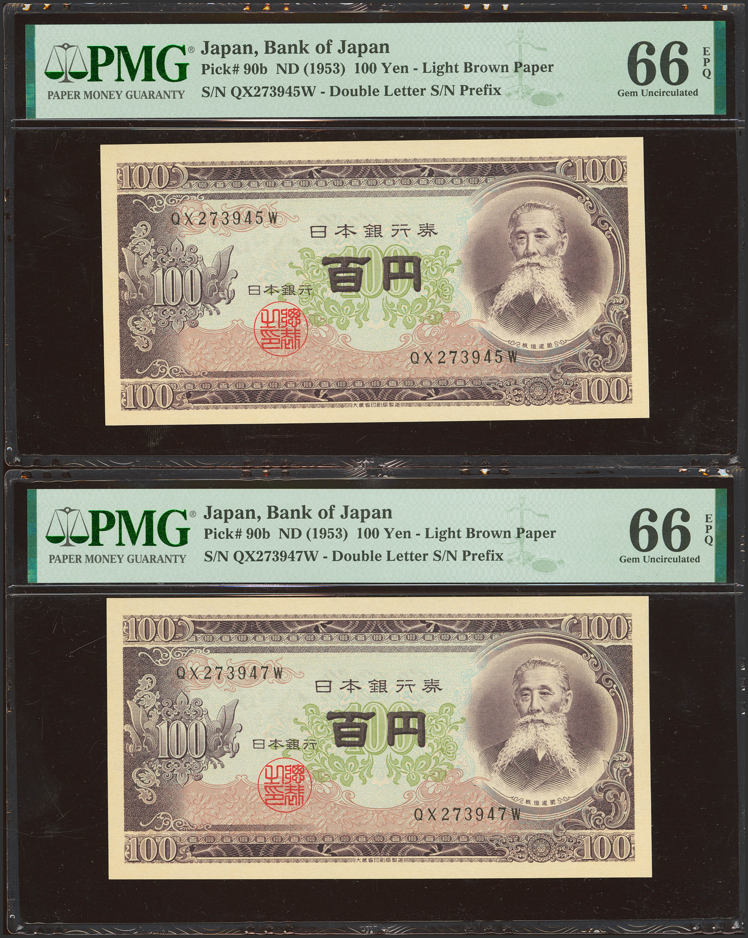 JAPAN. 100 Yen. Almost correlative. (1953ca). (Pick: 90b). PMG66EPQ, both.