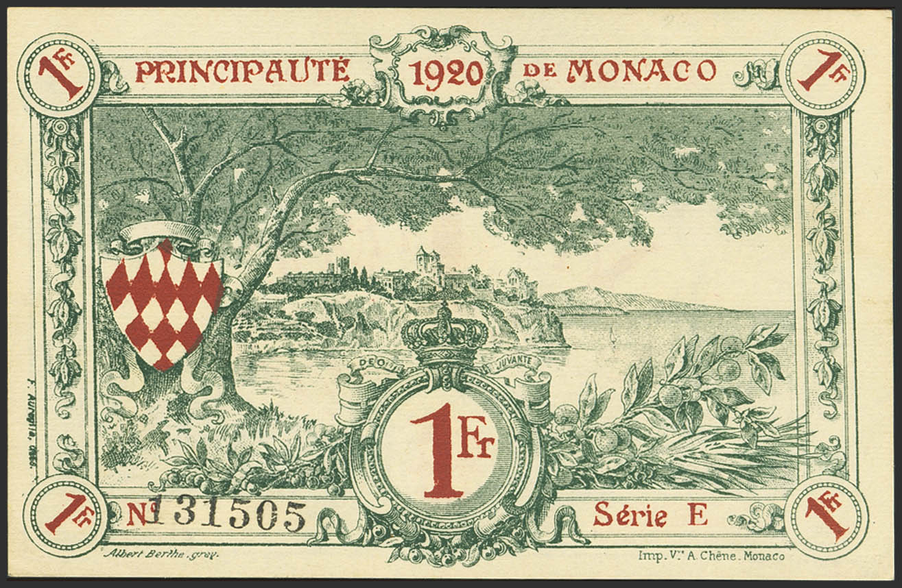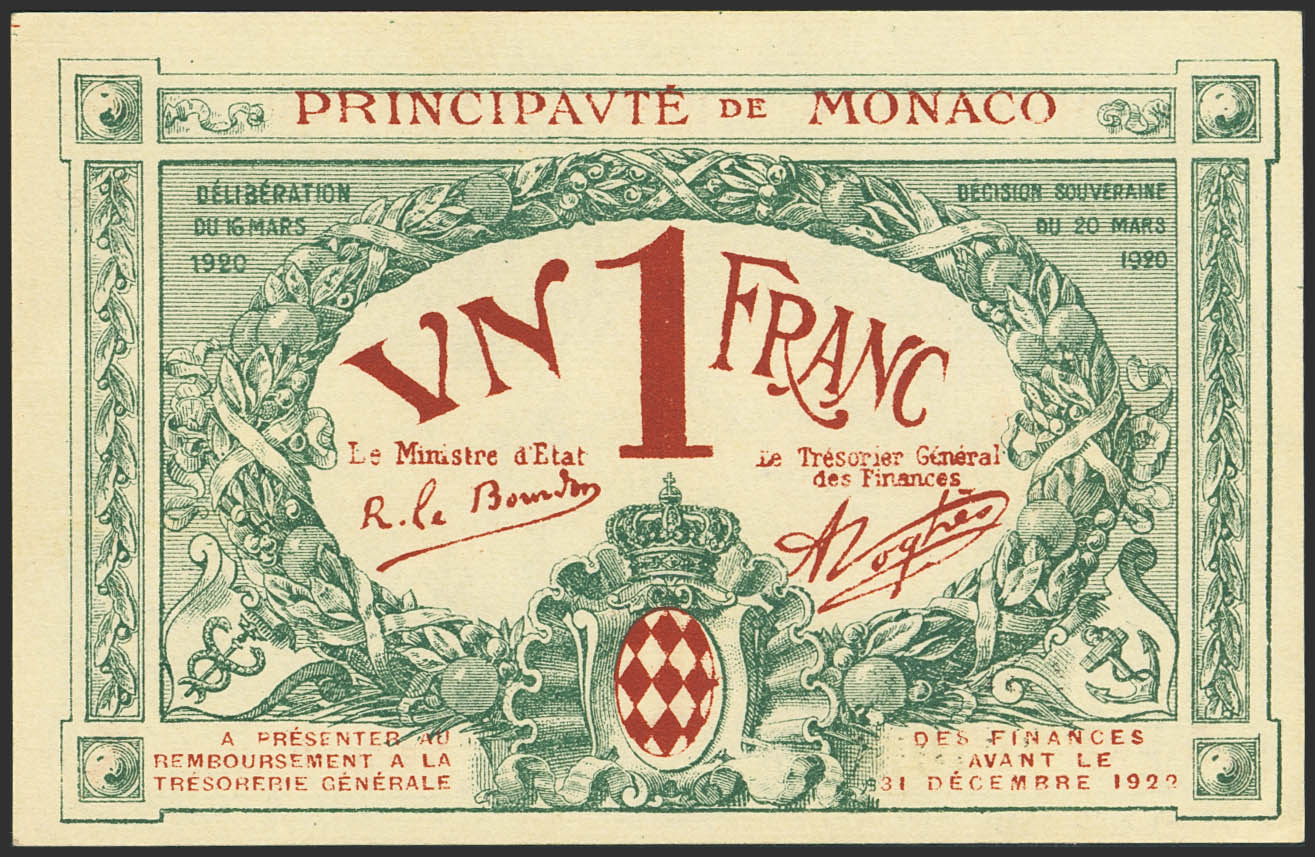 MONACO. 1 Franc. 1920. (Pick: 5a). Less than Uncirculated.