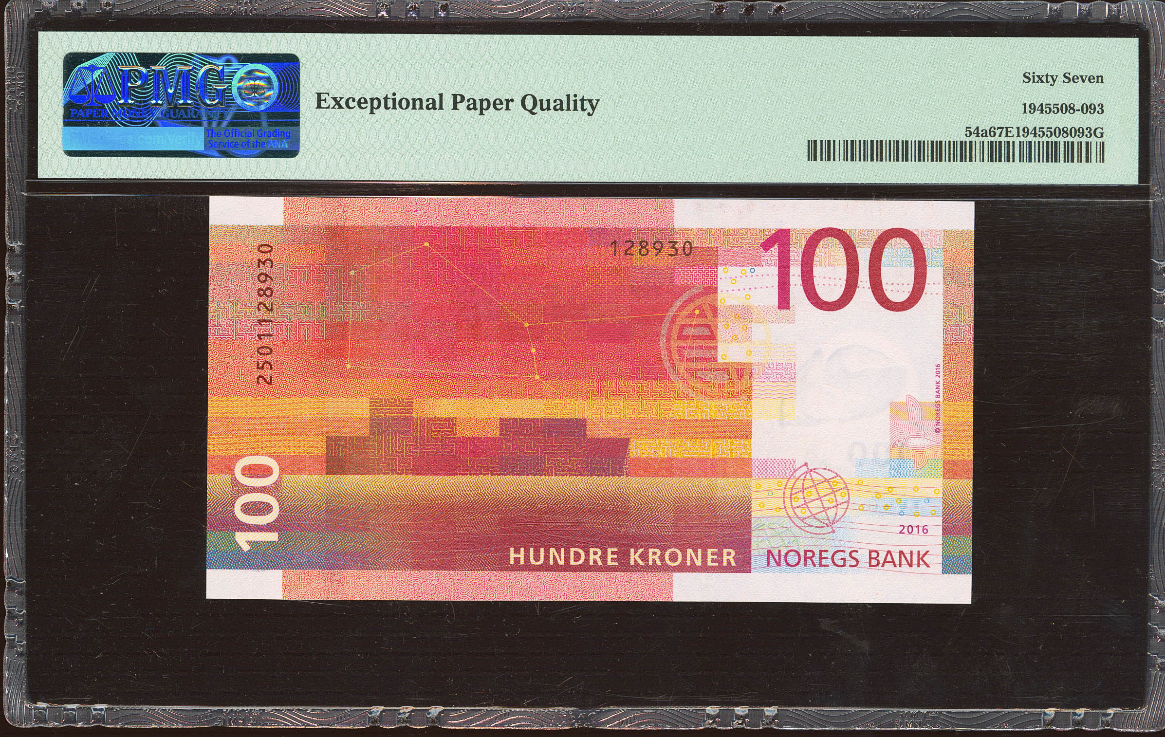 English NORWAY. 100 Kroner. 2016. (Pick: 24a). PMG67EPQ.
