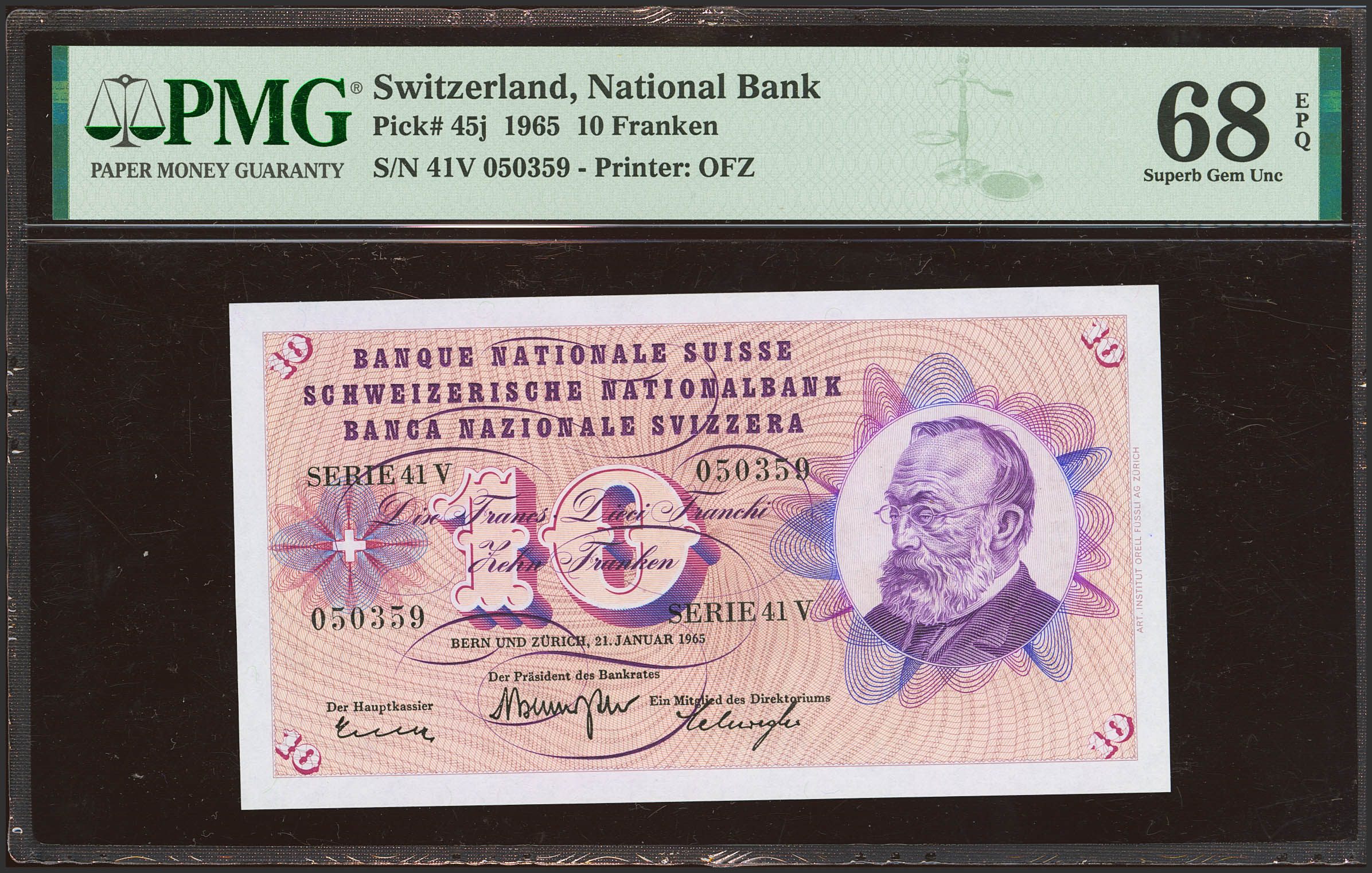 SWITZERLAND. 10 Franken. January 21, 1965. (Pick: 45j). PMG68EPQ.