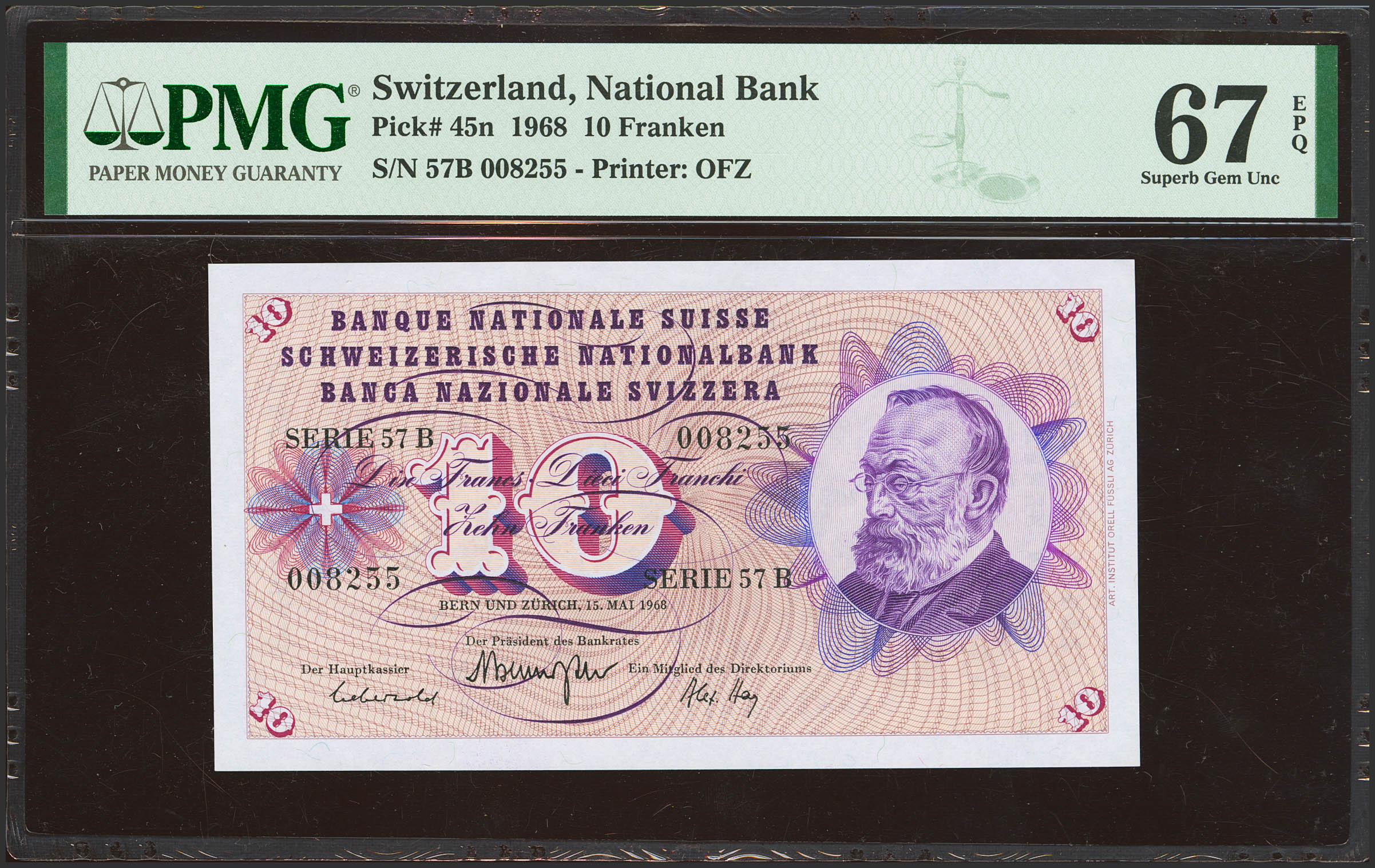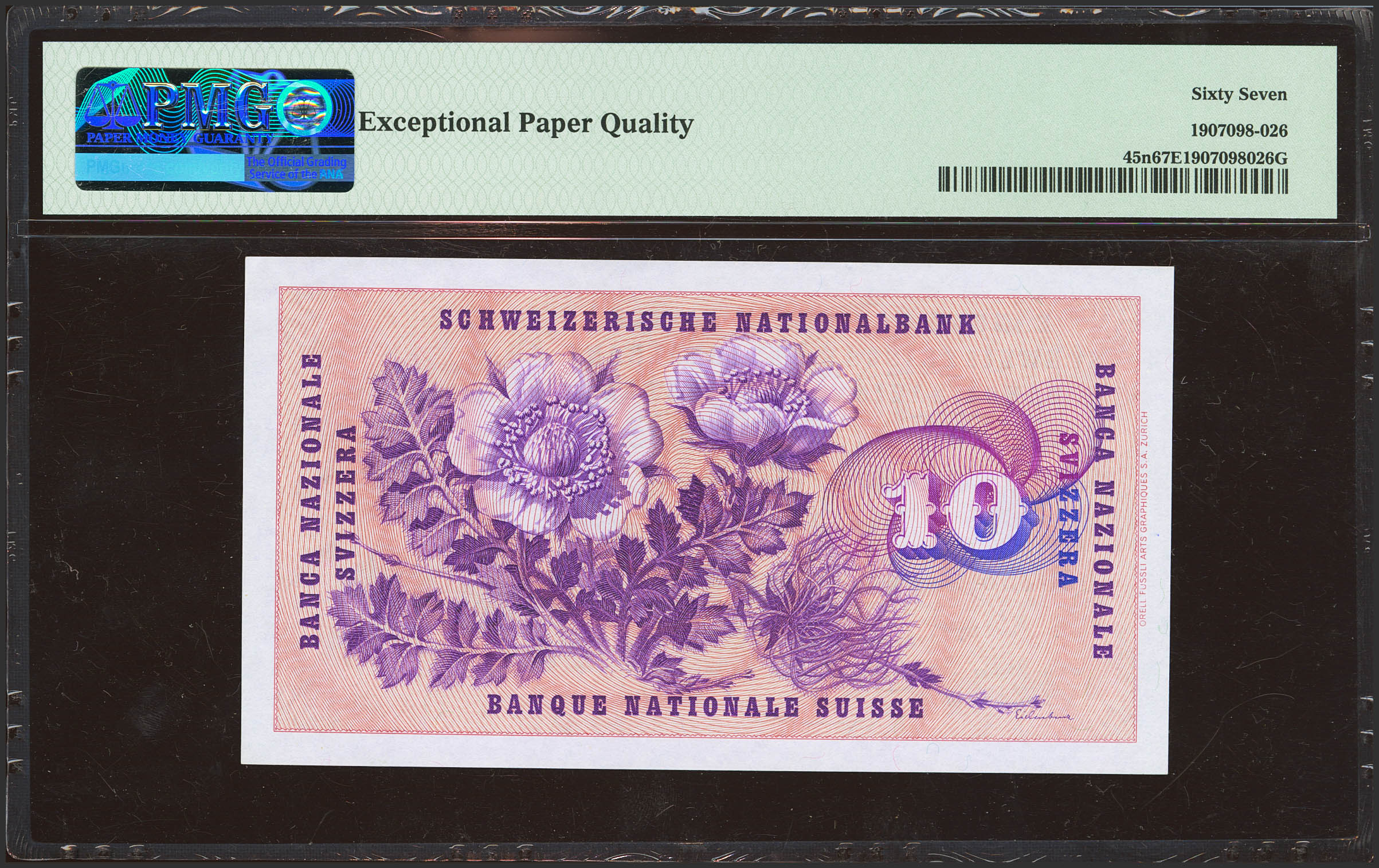 English SWITZERLAND. 10 Franken. May 15, 1968. (Pick: 45n). PMG67EPQ.