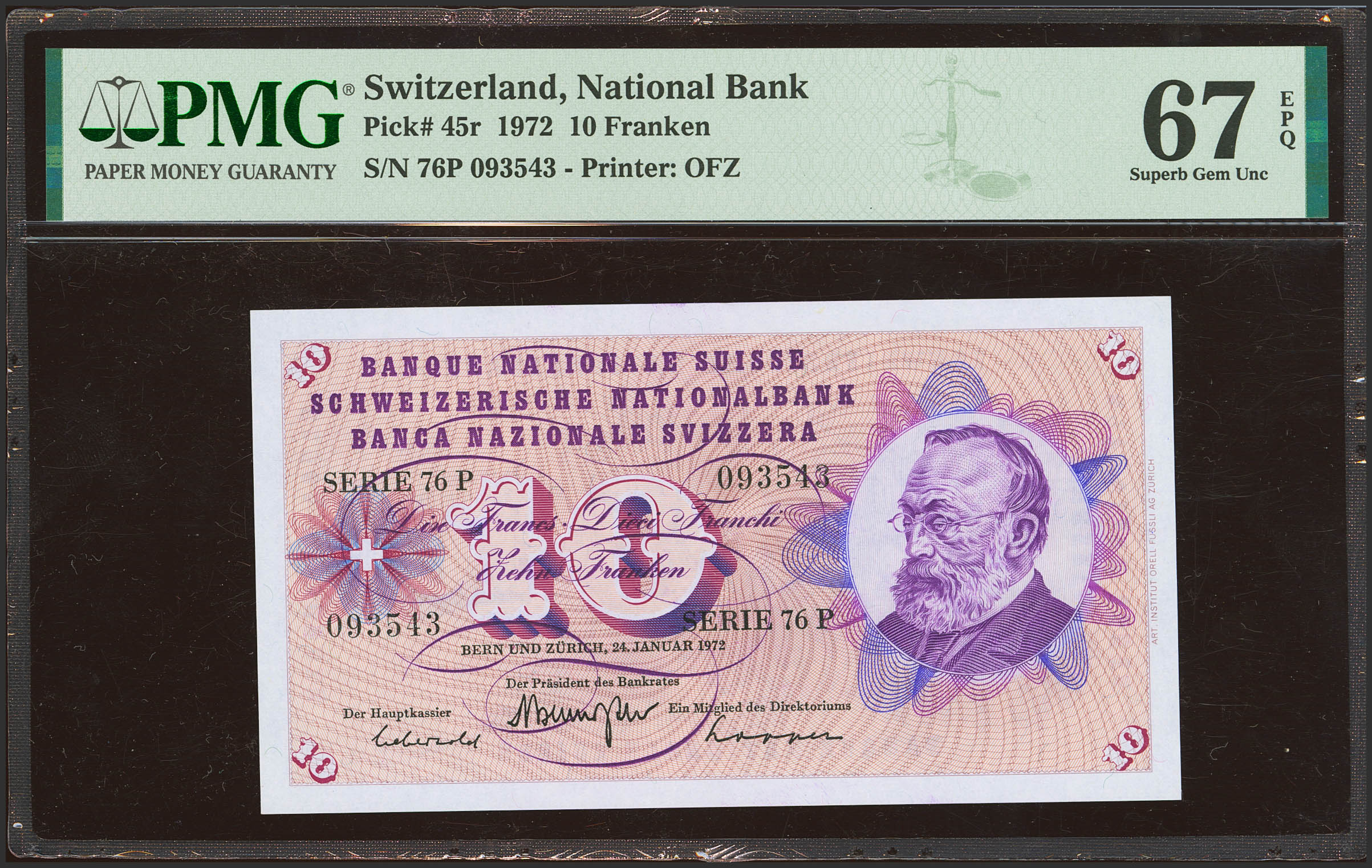 SWITZERLAND. 10 Franken. January 24, 1972. (Pick: 45r). PMG67EPQ.