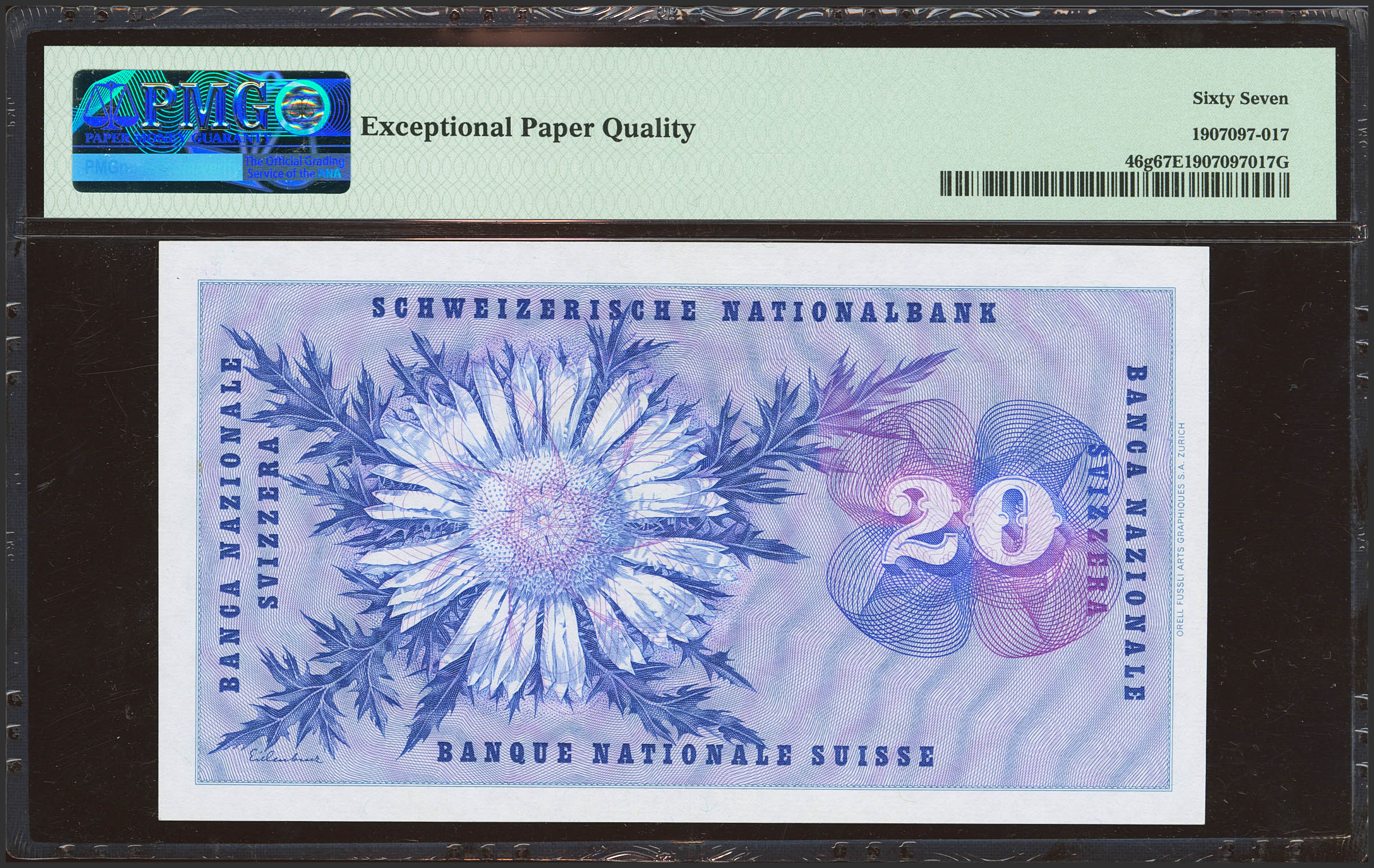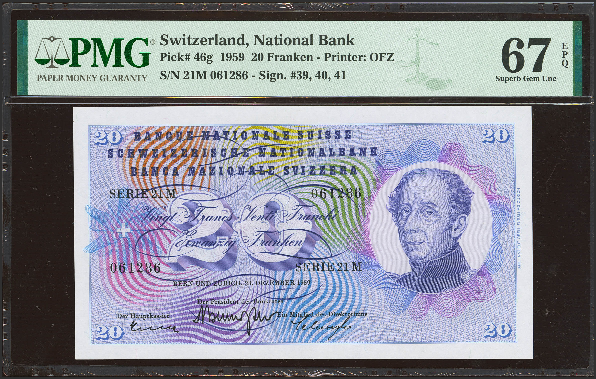 English SWITZERLAND. 20 Franken. December 23, 1959. (Pick: 46g). PMG67EPQ.
