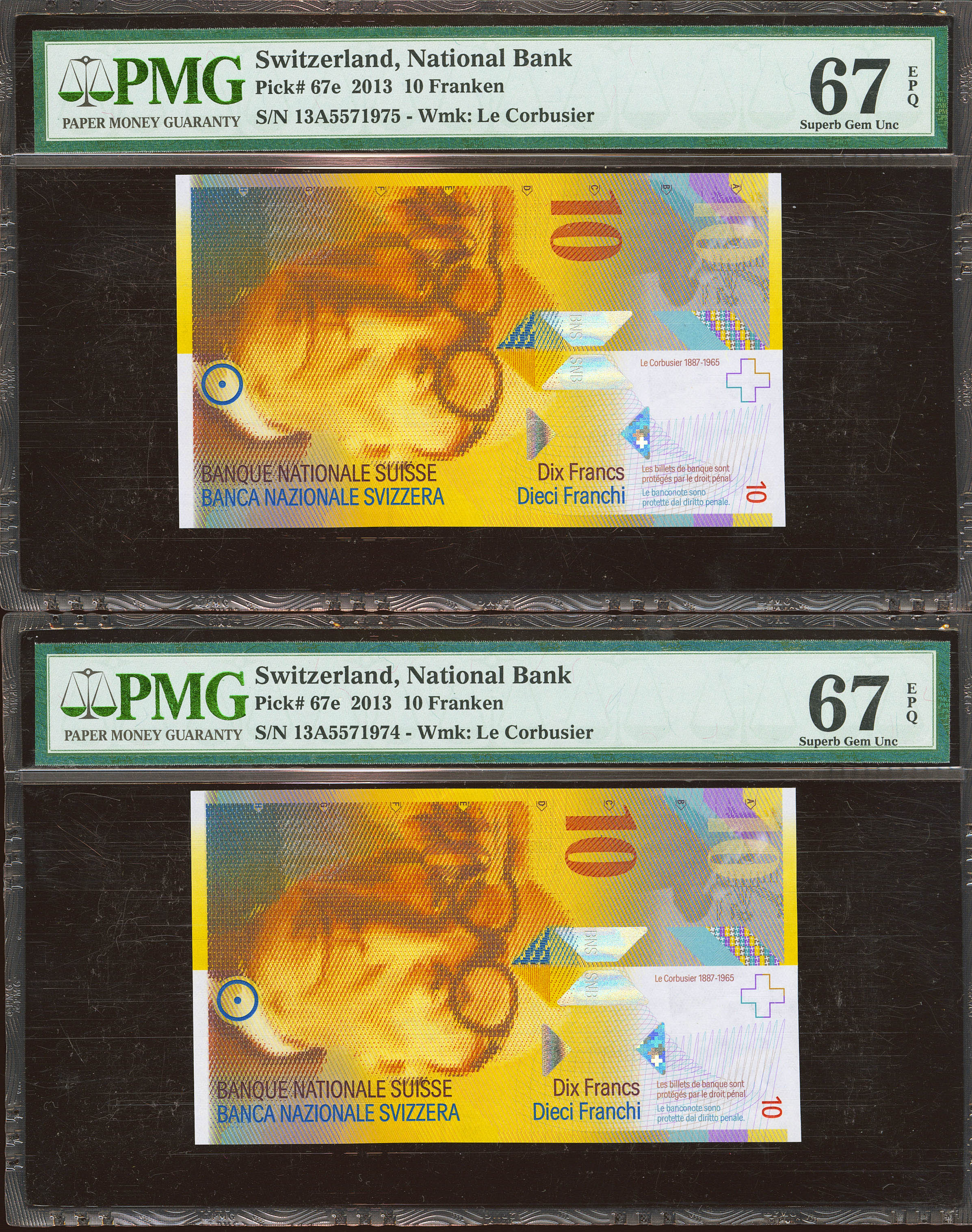SWITZERLAND. 10 Franken. Correlative pair. 2013. (Pick: 67e). PMG67EPQ, both.