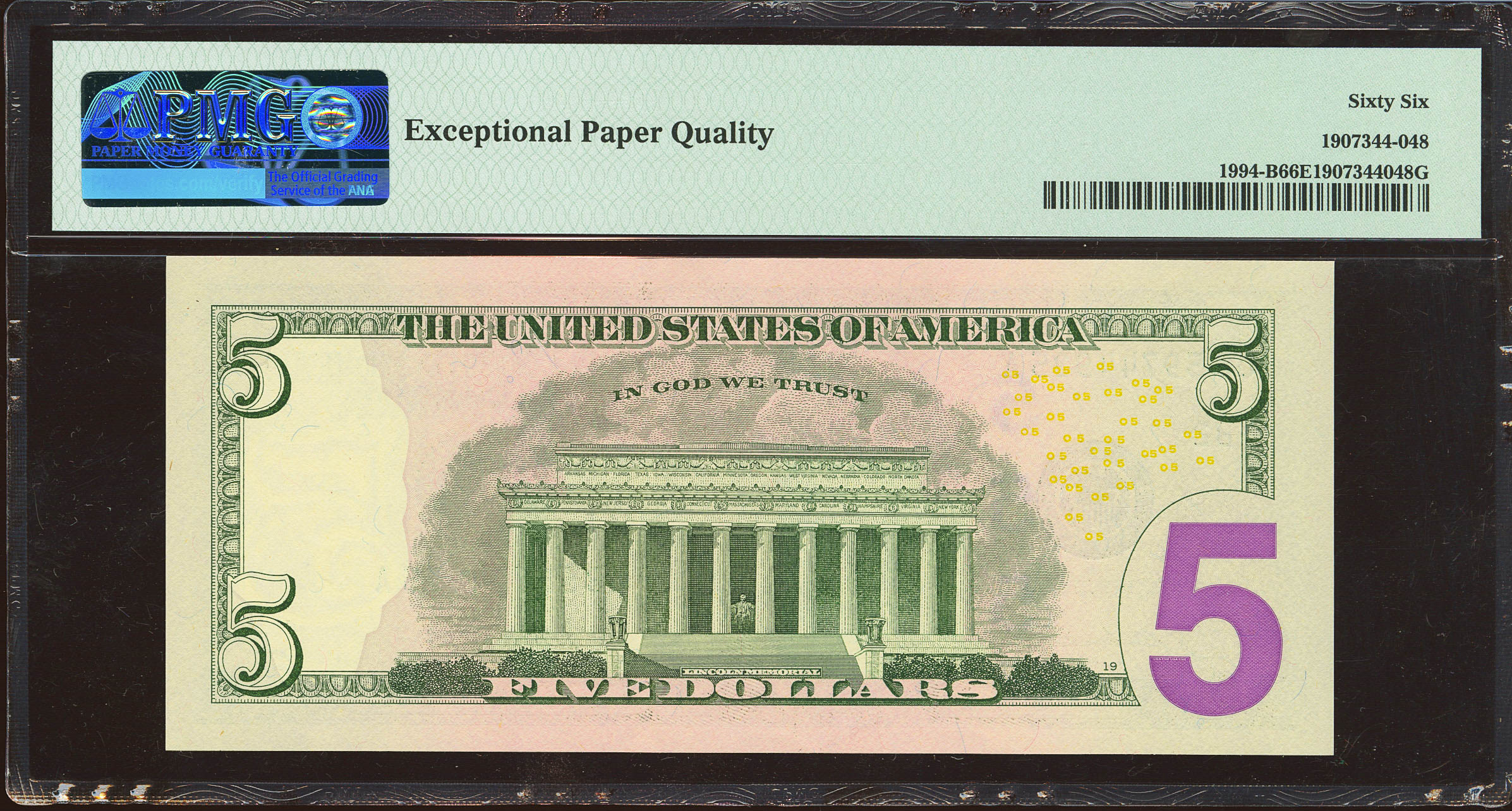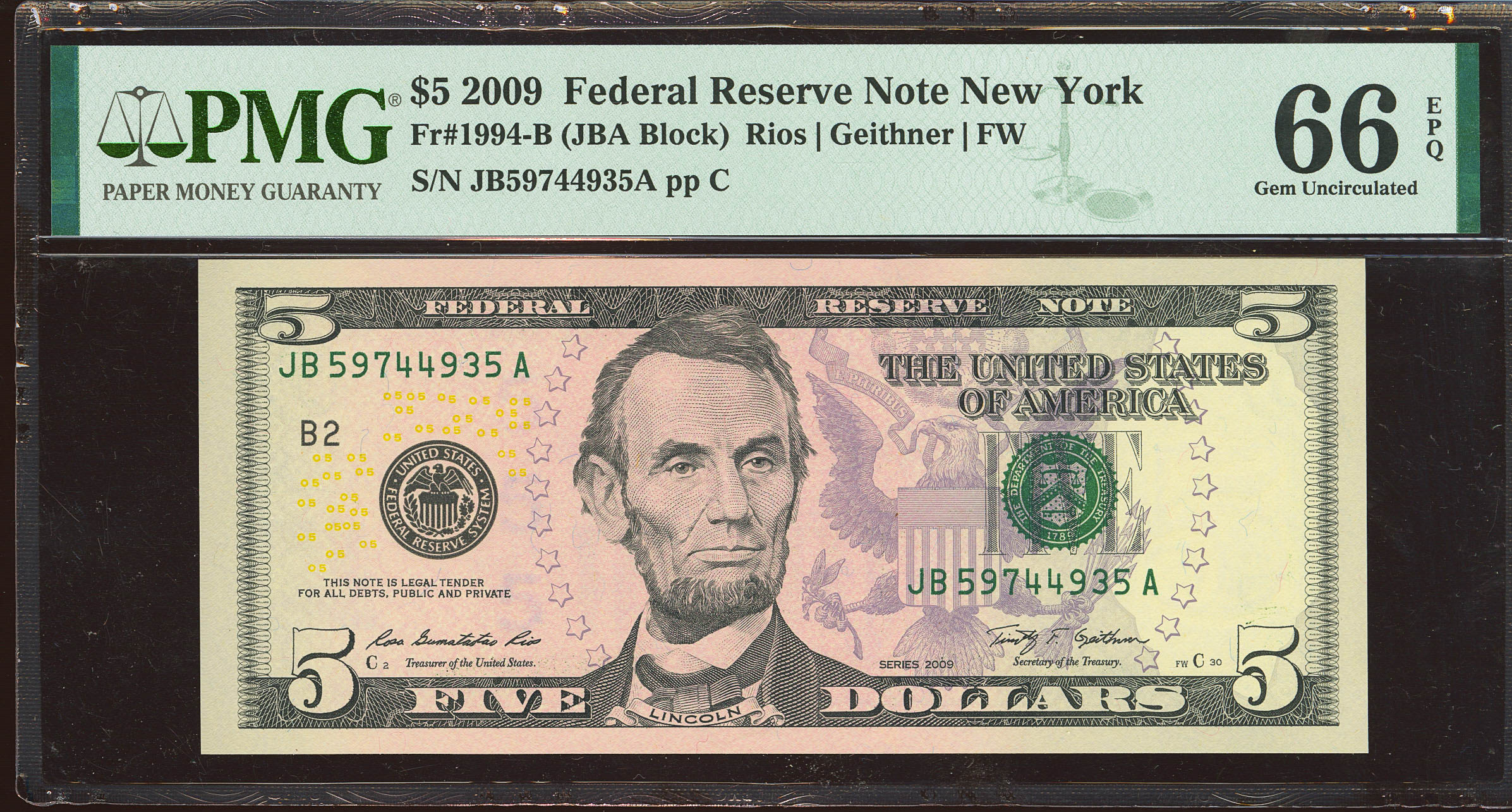 English UNITED STATES. 5 Dollars. 2009. (FR: 1994-B). PMG66EPQ.