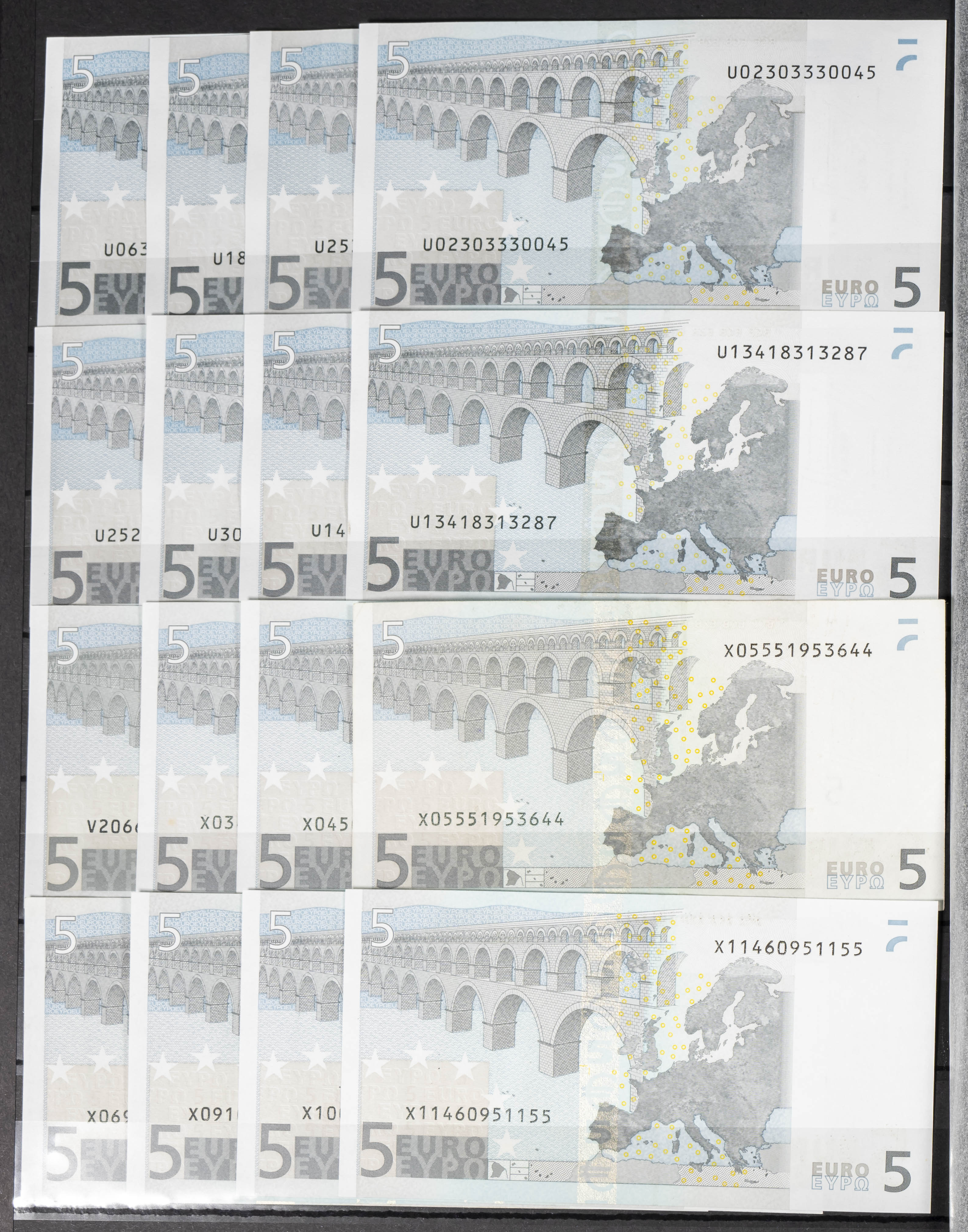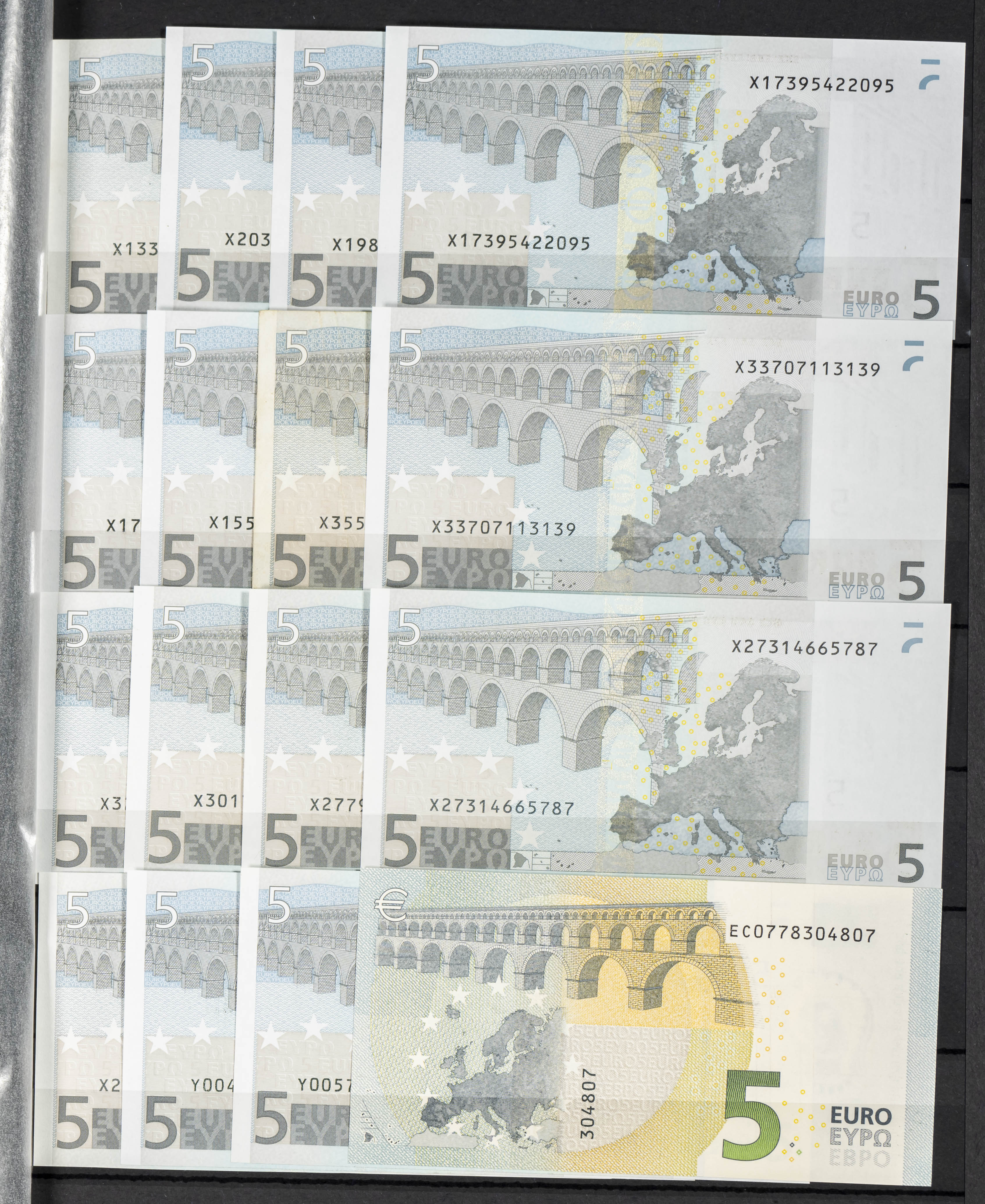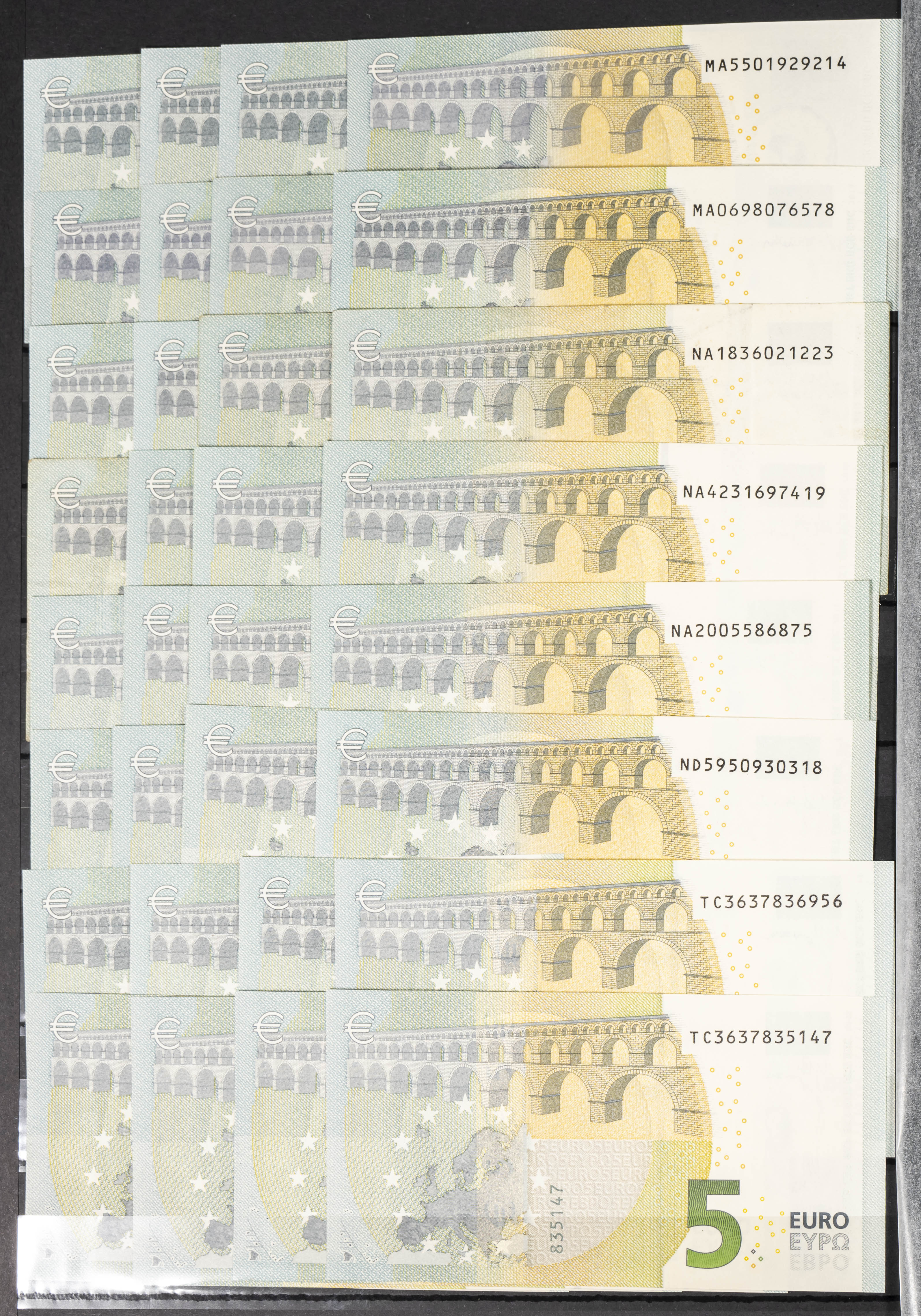 English Spectacular lot of 134 banknotes of 5 euro from the 2002 issue and the 2013-2019 issue. With different letters-contries, signatures and plates. TO EXAMINE AND PRECIOUS SET FOR THE STUDY OF EURO BANKNOTES (most of them uncirculated / less than uncirculated).