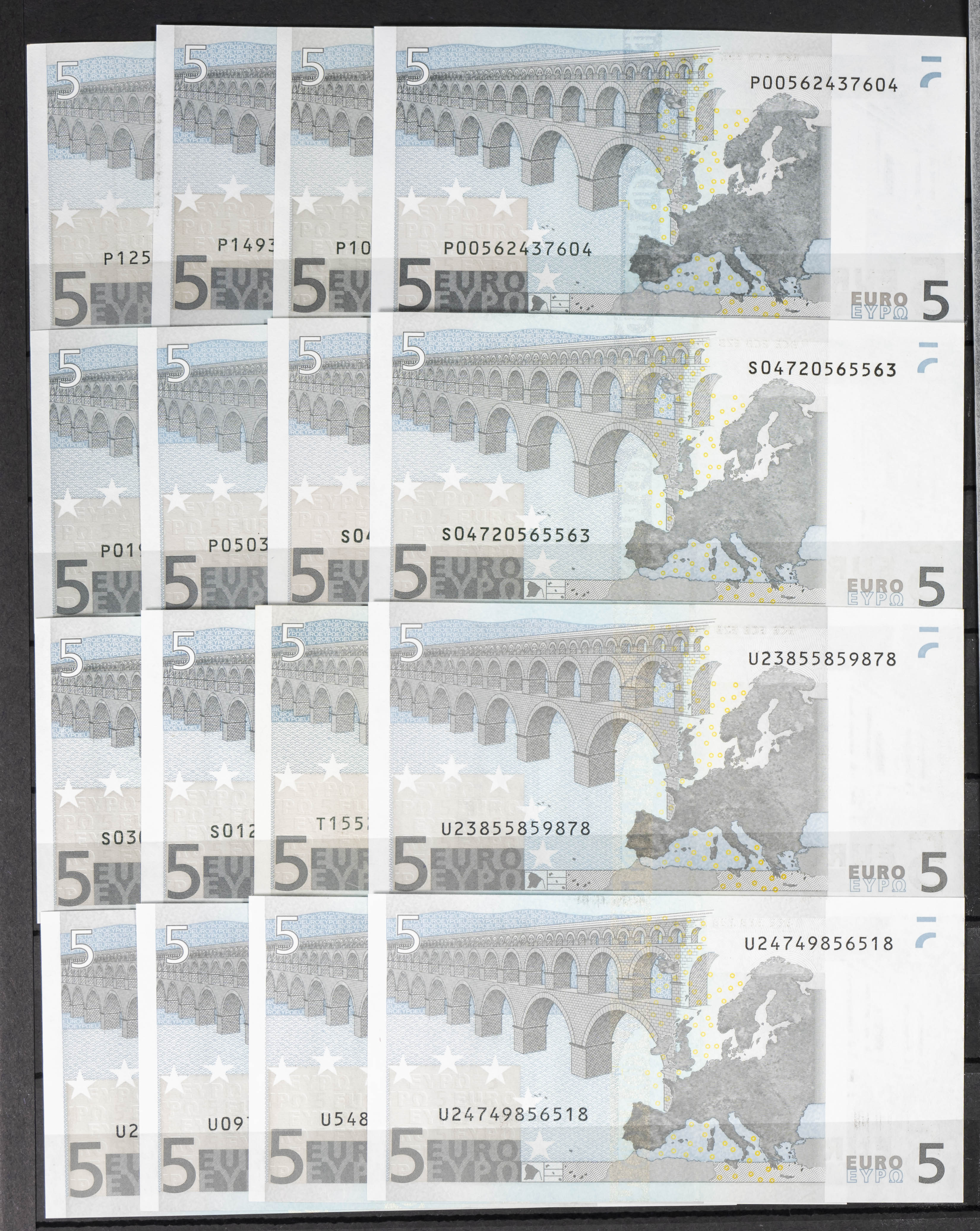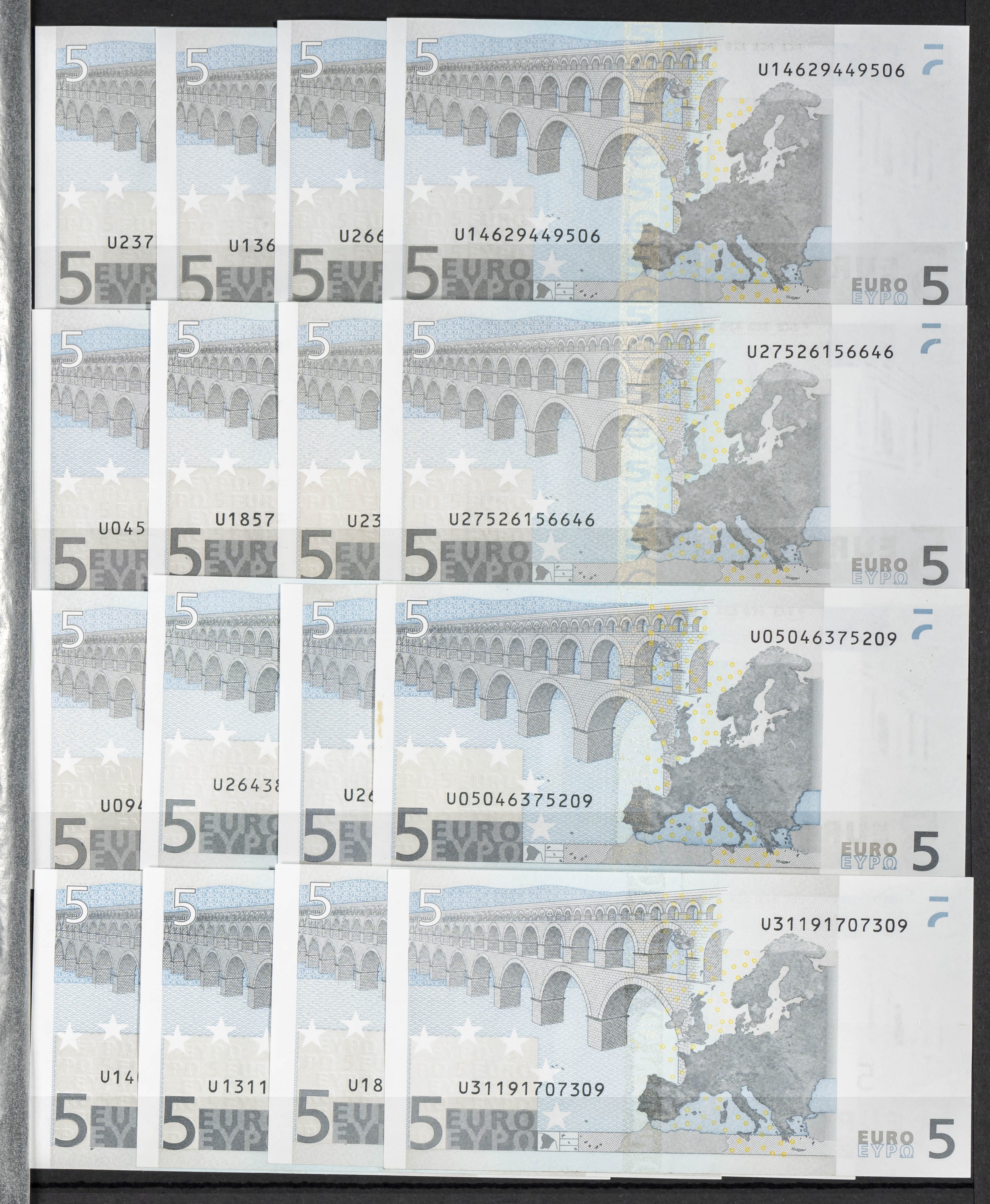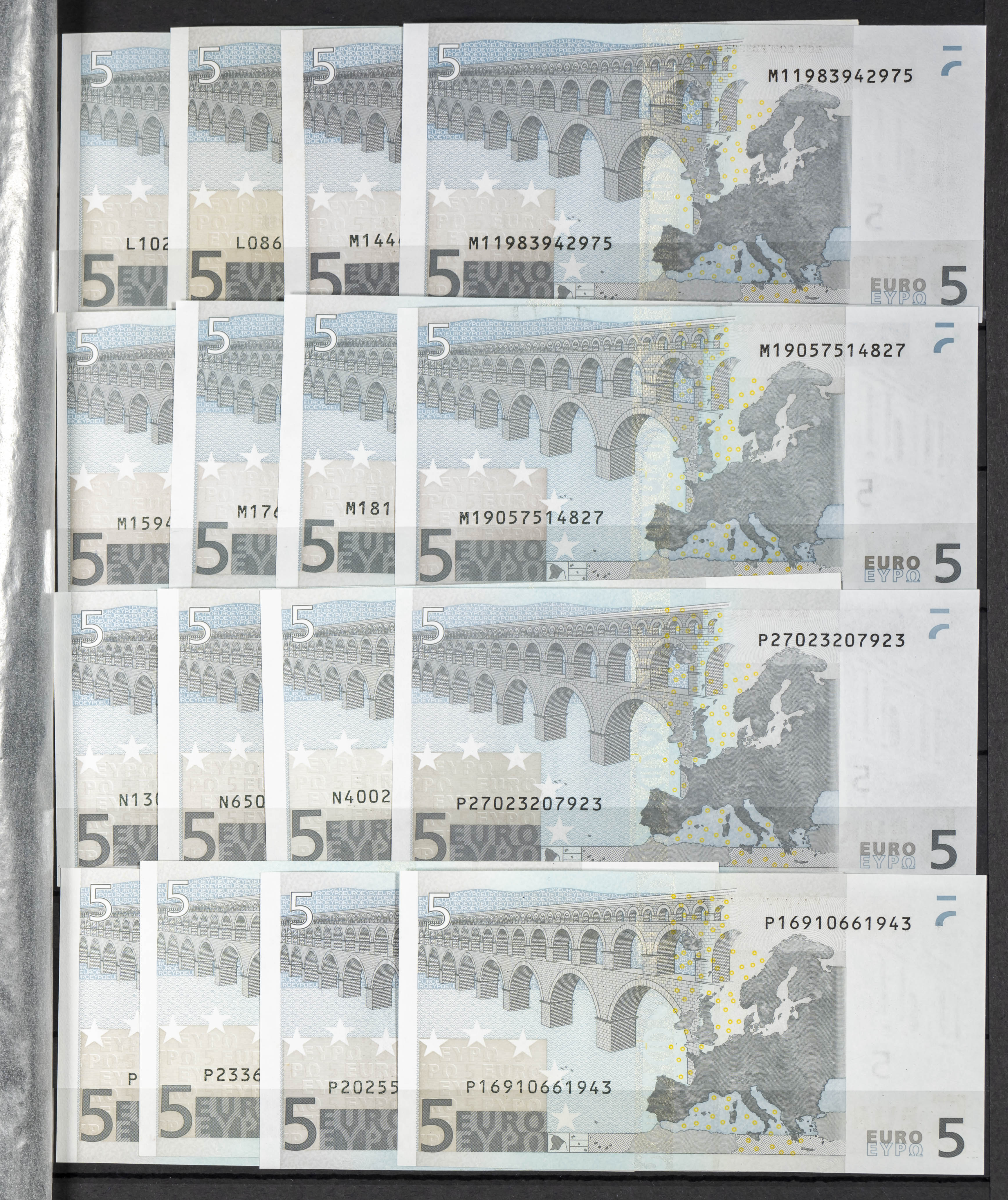 English Spectacular lot of 134 banknotes of 5 euro from the 2002 issue and the 2013-2019 issue. With different letters-contries, signatures and plates. TO EXAMINE AND PRECIOUS SET FOR THE STUDY OF EURO BANKNOTES (most of them uncirculated / less than uncirculated).