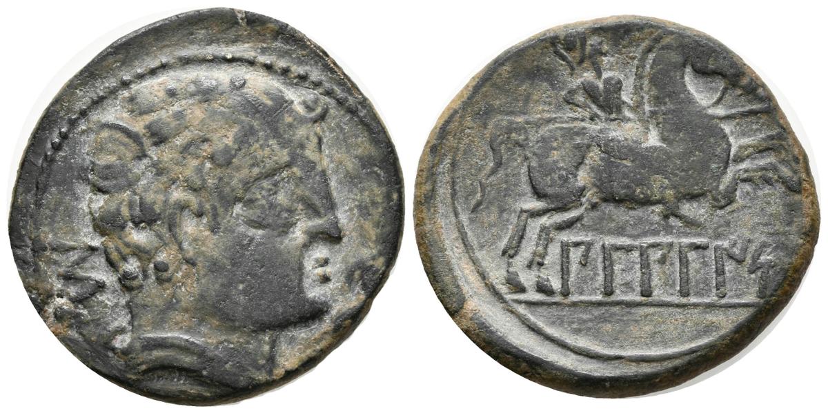 BILBILIS. As. 120-30 a.C. Calatayud (Zaragoza). A/ Cabeza masculina con manto y torques a derecha, delante delfín, detrás signo ibérico S. R/ Jinete con lanza a derecha sobre exergo leyenda ibérica BiLBiLIS. FAB-254. Ae. 11,94g. MBC+.