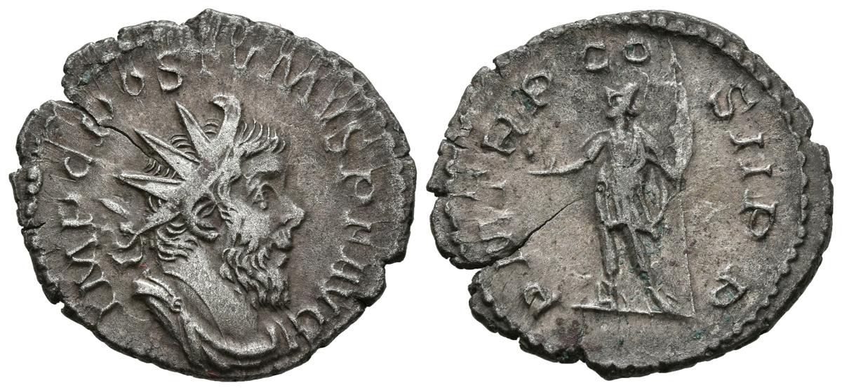 POSTUMO. Antoniniano. 261 d.C. Treveri. A/ Busto radiado y drapeado con coraza a derecha. IMP C POSTVMVS P F AVG. R/ Póstumo con atuendo militar sosteniendo lanza y globo. P M TR P COS III P P. RIC 55; Cohen 261. Ar. 3,13g. MBC+.