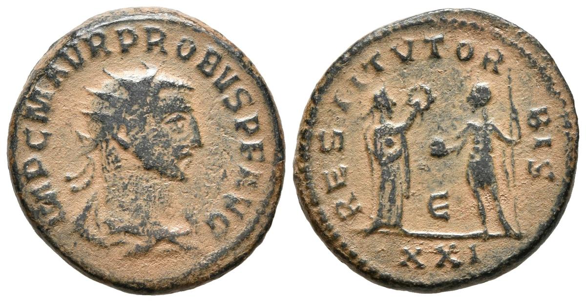 PROBO. Antoniniano. 276-282 d.C. Antioquía. A/ Busto radiado y drapeado con coraza a derecha. IMP C M AVR PROBVS P F AVG. R/ Emperador en pie a derecha portando lanza, frente a él figura femenina entregándole una corona, entre ellos E. RESTITVT ORBIS, en exergo XXI. RIC 925. Ae. 4,95g. MBC.