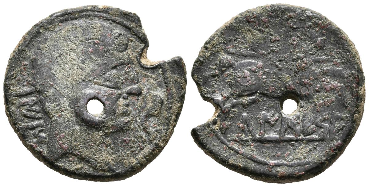 CAISESA. As. 120-80 a.C. Zona de Soria-Guadalajara. A/ Cabeza masculina barbada a derecha, delante delfín, detrás leyenda BalS. R/ Jinete con lanza a derecha, debajo CaISESA. FAB-401. Ae. 8,40g. Perforación central. MBC-/BC+. Rara.