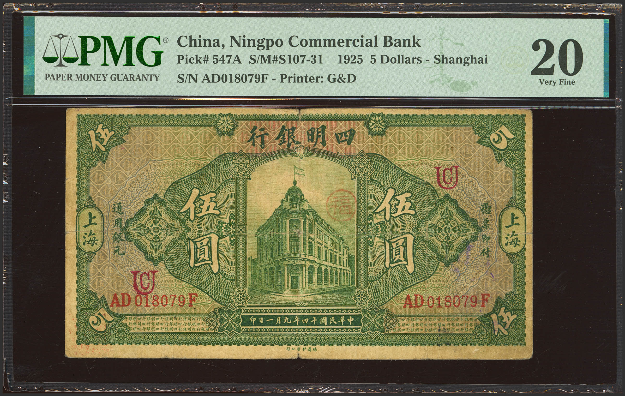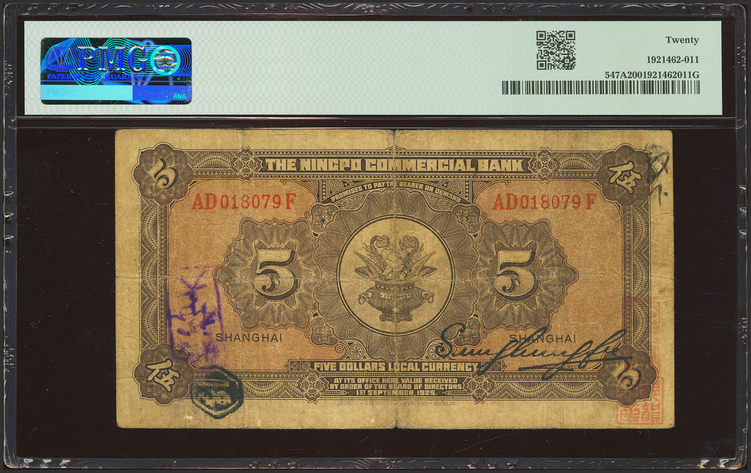 English CHINA. 5 Dollars. 1 September 1925. Ningpo Commercial Bank. (Pick: 547A, SM: S107-31). PMG20.
