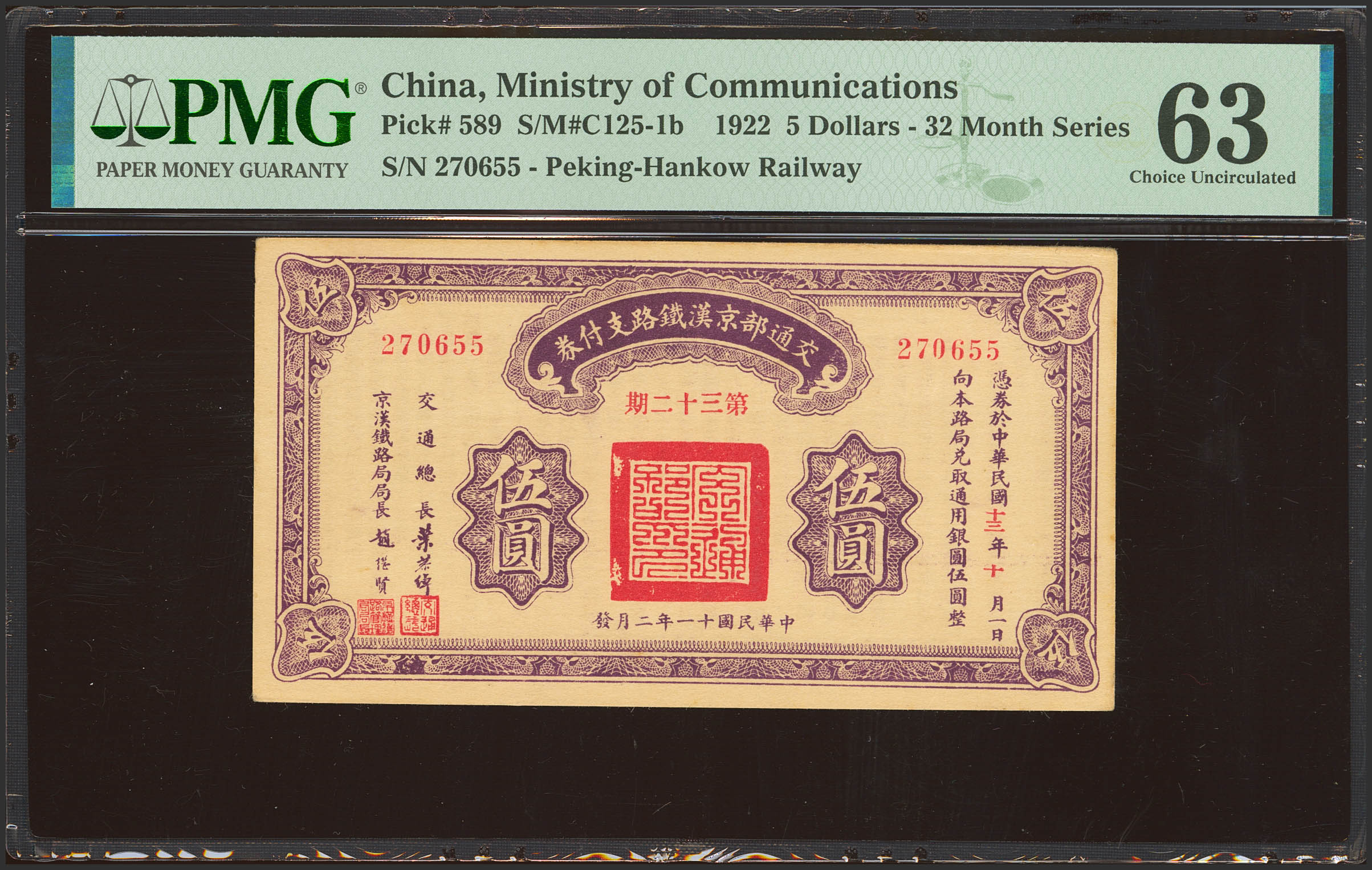 English CHINA. 5 Dollars. 1922. Ministry of Communications. 32 Month series. (Pick: 589, SM: C125-1b). PMG63 (minor paper pull).