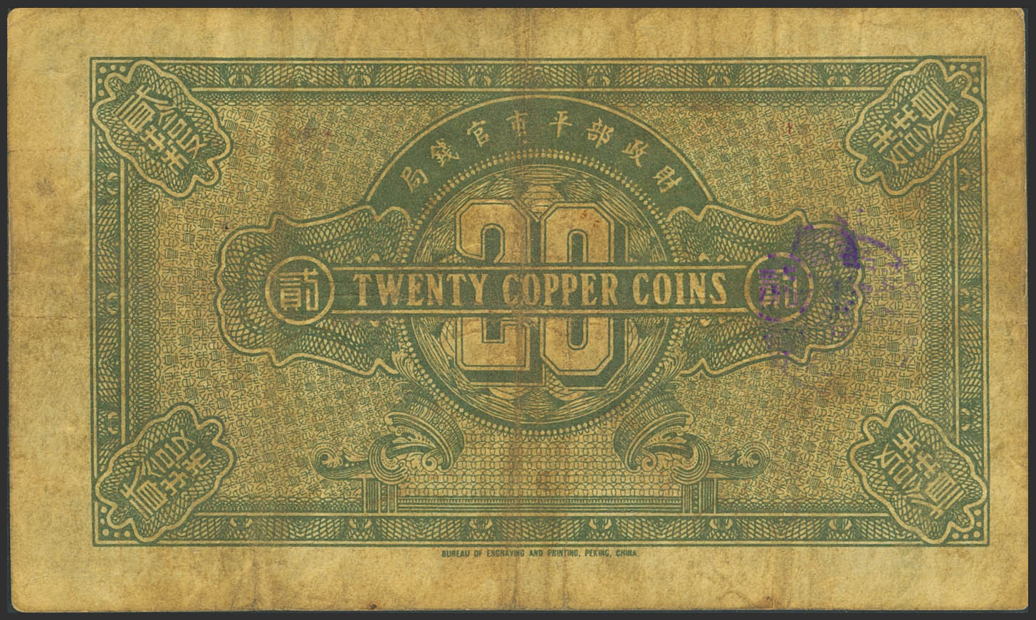 English CHINA. 20 Coppers. 1922. Market Stabilization Currency Bureau. Ching Chao. (Pick: 610a). More than Fine.