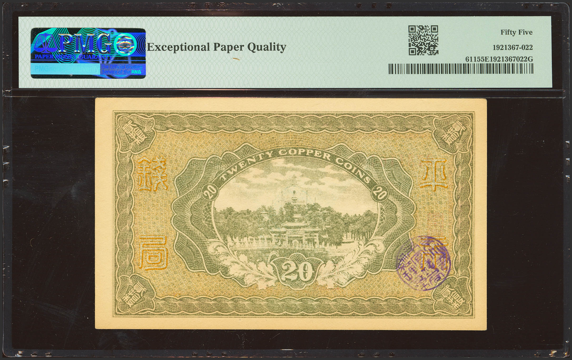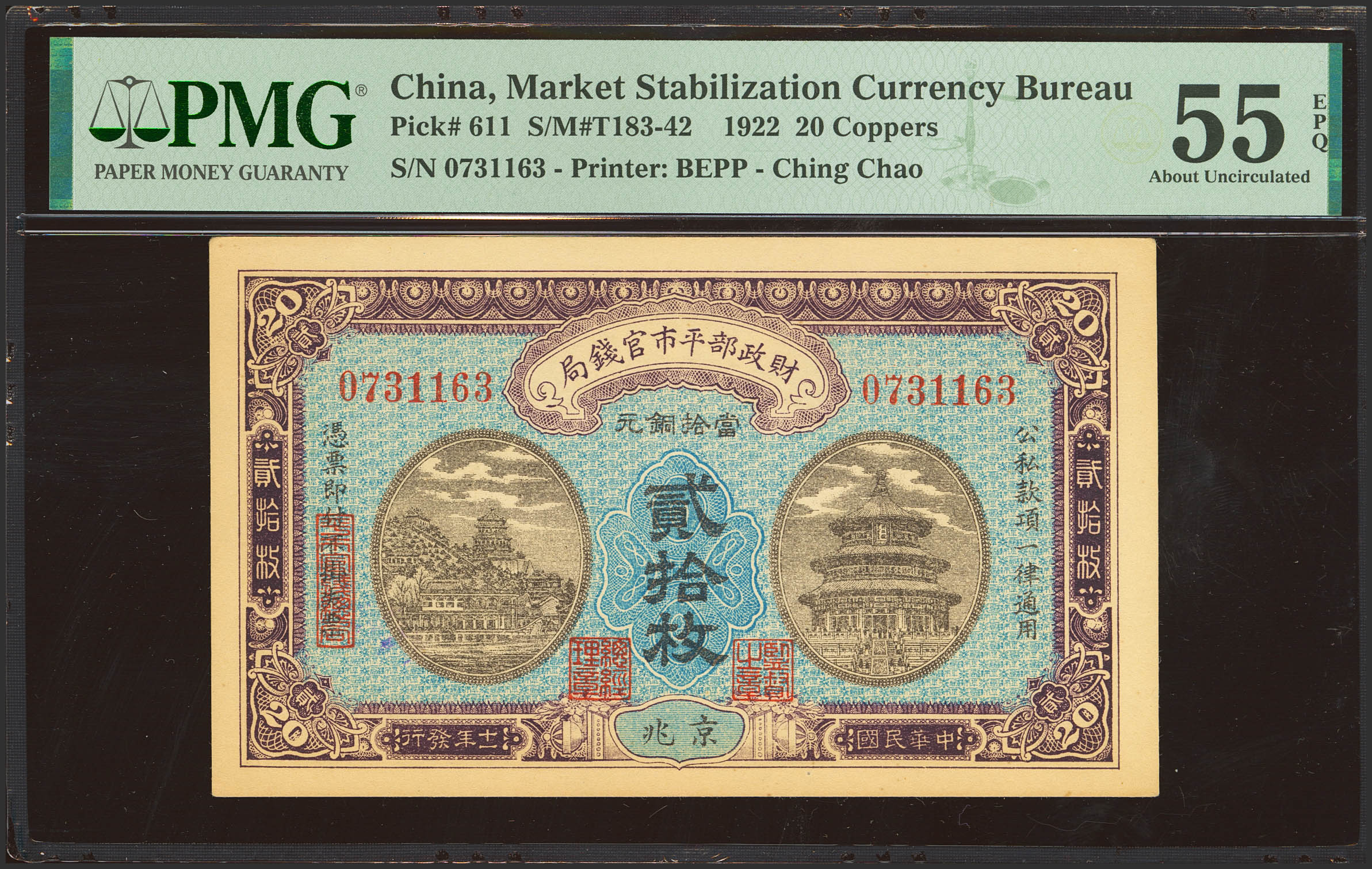 English CHINA. 20 Coppers. 1922. Market Stabilization Currency Bureau. Ching Chao. (Pick: 611, SM: T183-42). PMG55EPQ.
