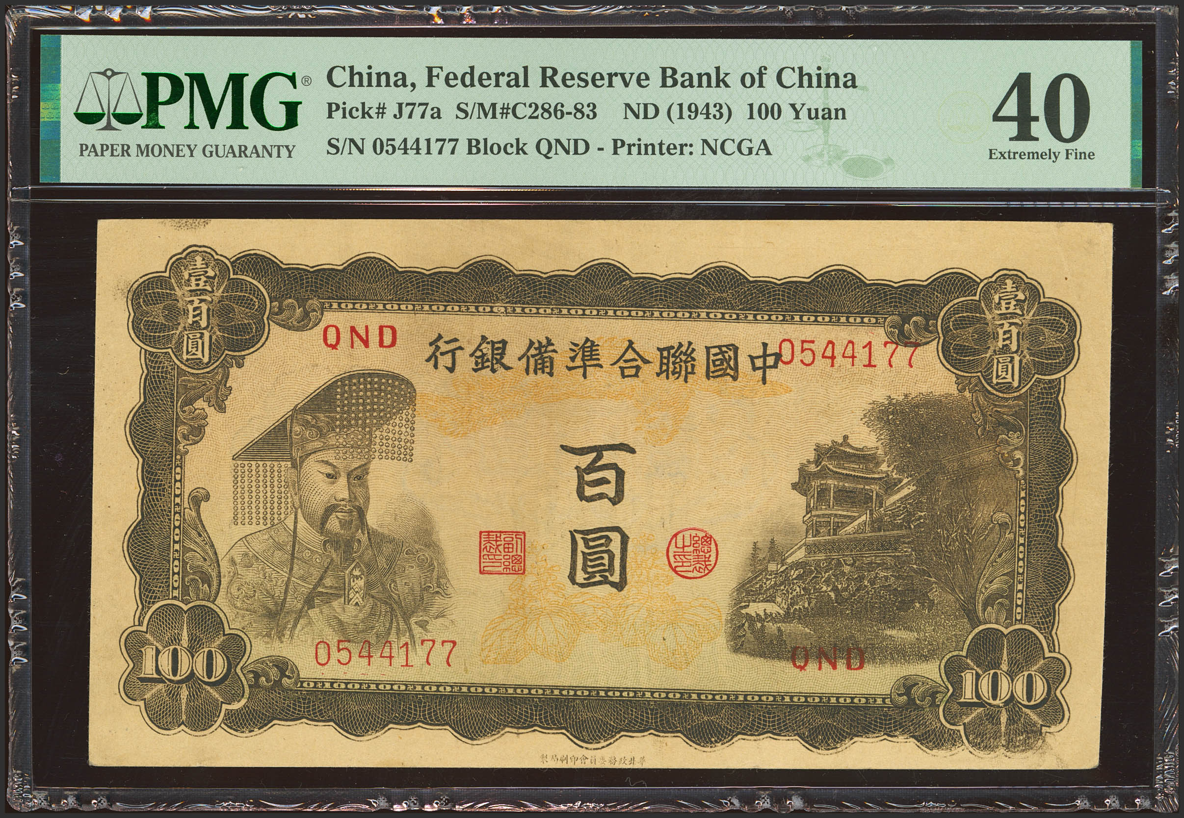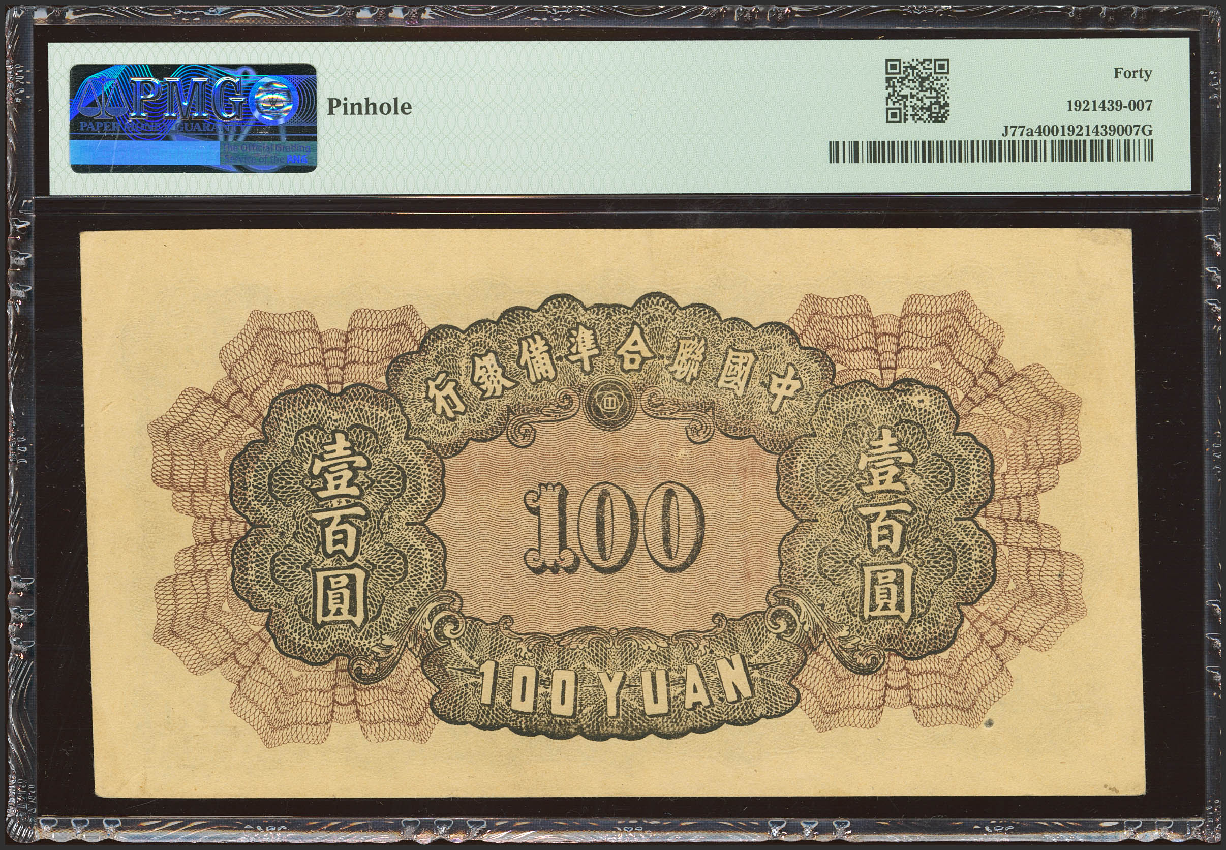 CHINA-PUPPET BANKS. 100 Yuan. (1943ca). Federal Reserve Bank. (Pick: J77a, SM: C286-86). PMG40 (pinhole).