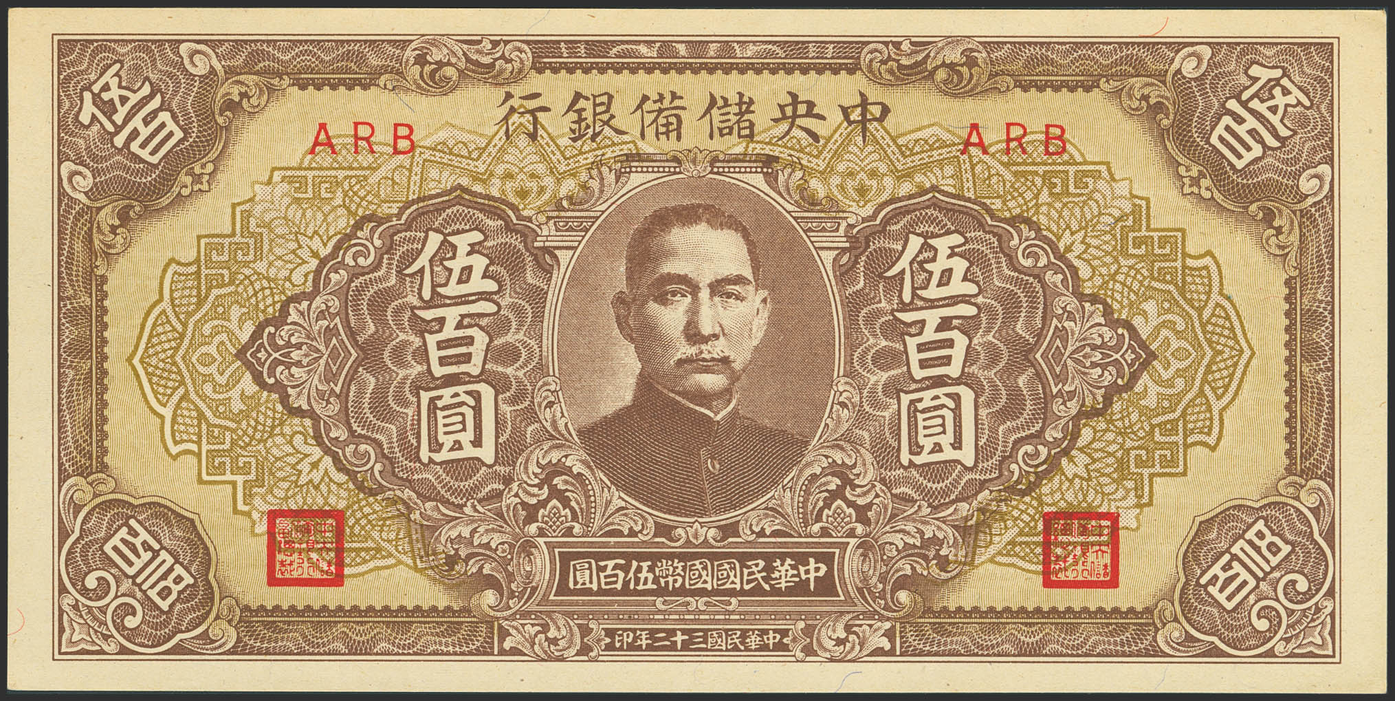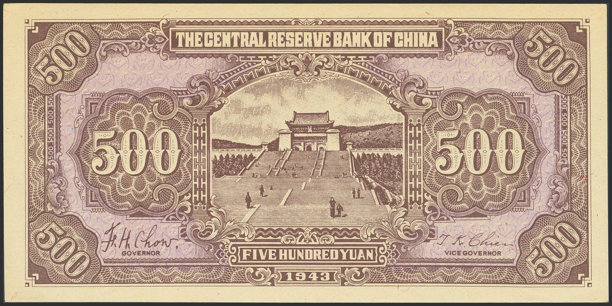 CHINA-PUPPET BANKS. 500 Yuan. 1943. Central Reserve Bank. (Pick: J27a). Almost Uncirculated.