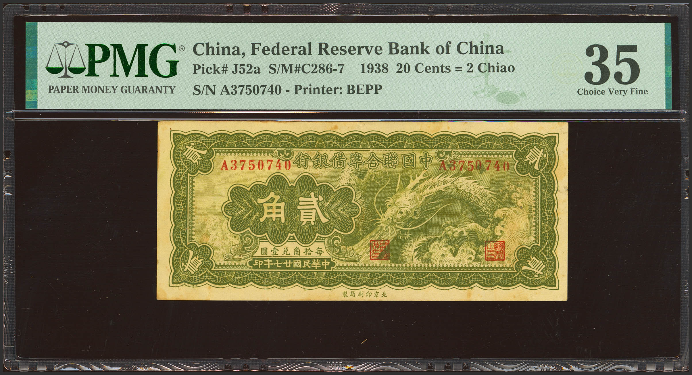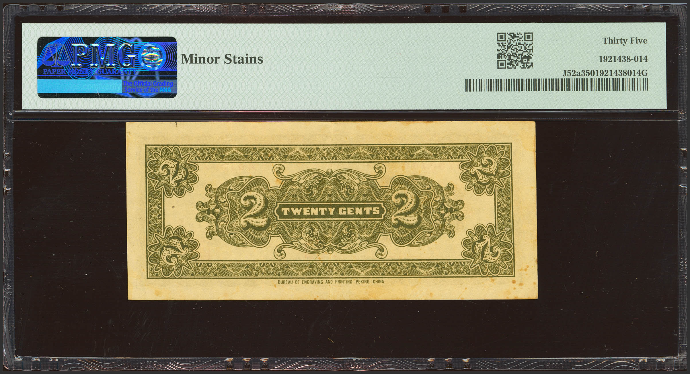 English CHINA-PUPPET BANKS. 20 Cents. 1938. Federal Reserve Bank. (Pick: J52a, SM: C286-7). PMG35 (minor stain).