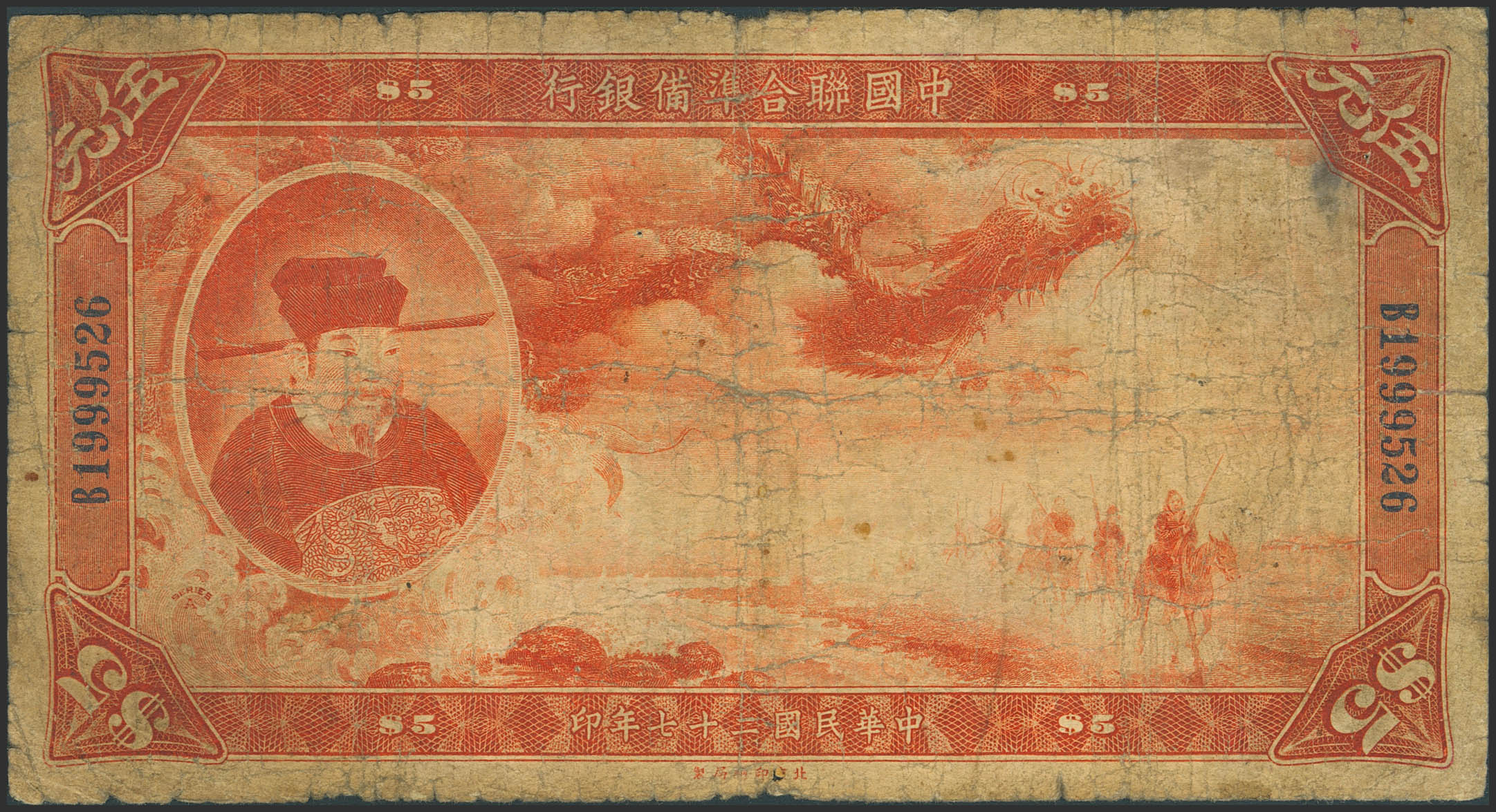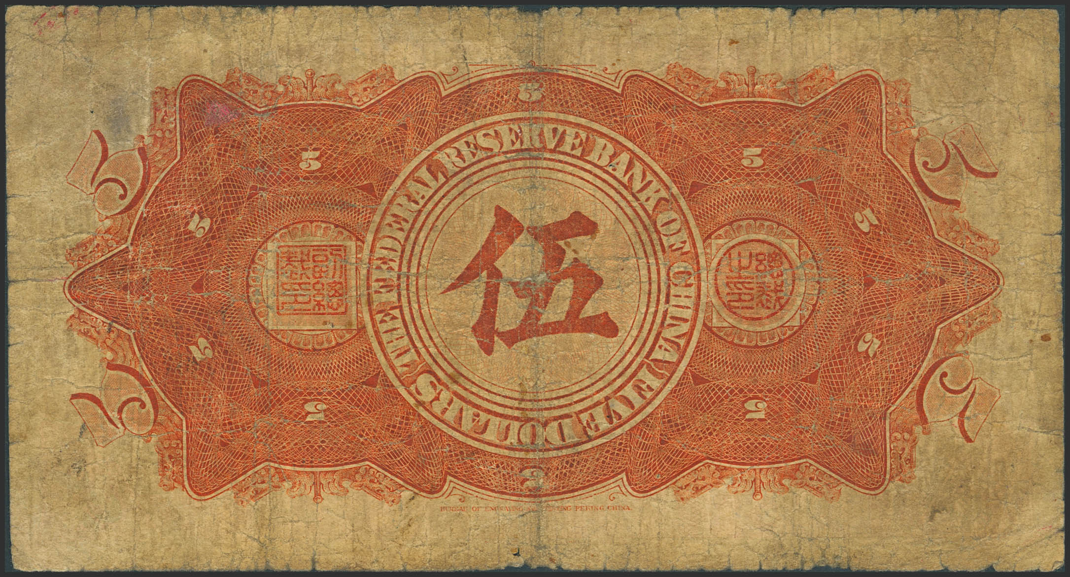 English CHINA-PUPPET BANKS. 5 Dollars. 1938. Federal Reserve Bank. (Pick: J56a). Pinholes and tears. Fine.