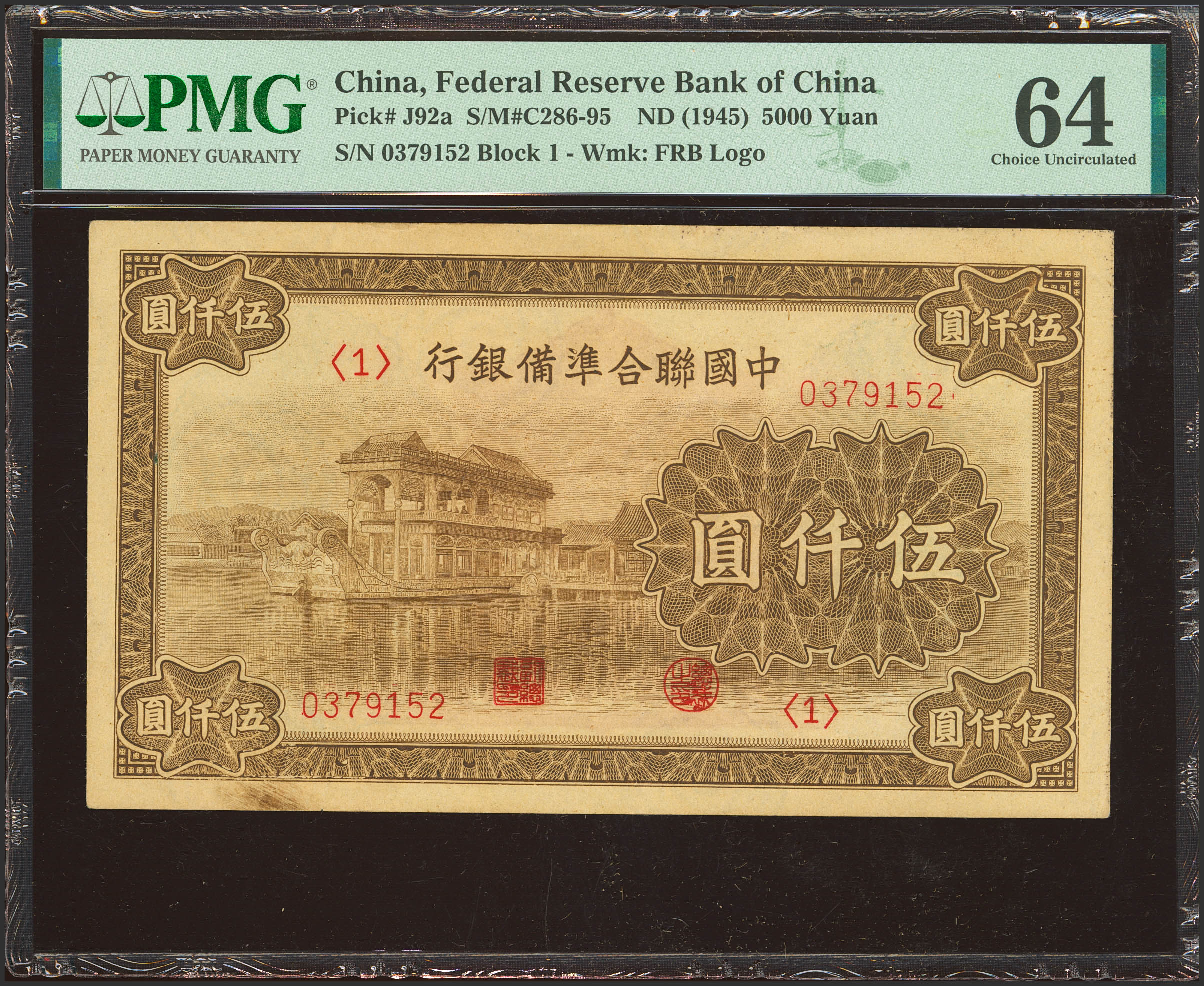 CHINA-PUPPET BANKS. 5000 Yuan. (1945ca). Federal Reserve Bank. (Pick: J92a, SM: C286-95). PMG64.