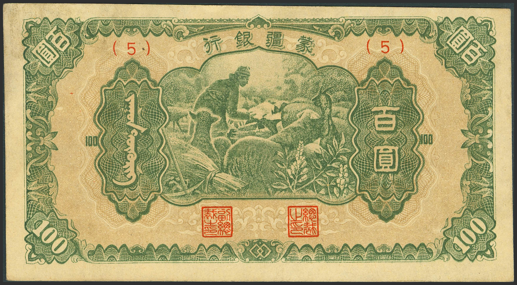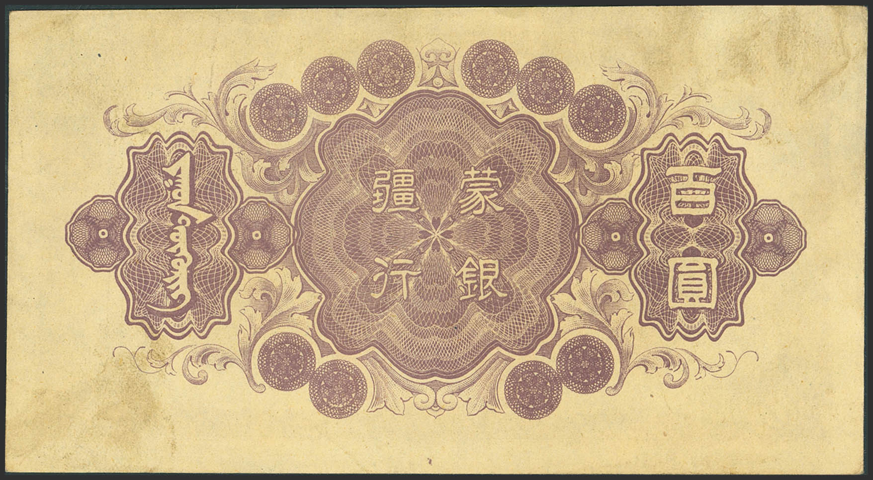 English CHINA-PUPPET BANKS. 100 Yuan. (1945ca). Mengchiang Bank. (Pick: J110a). More than Extremely Fine.