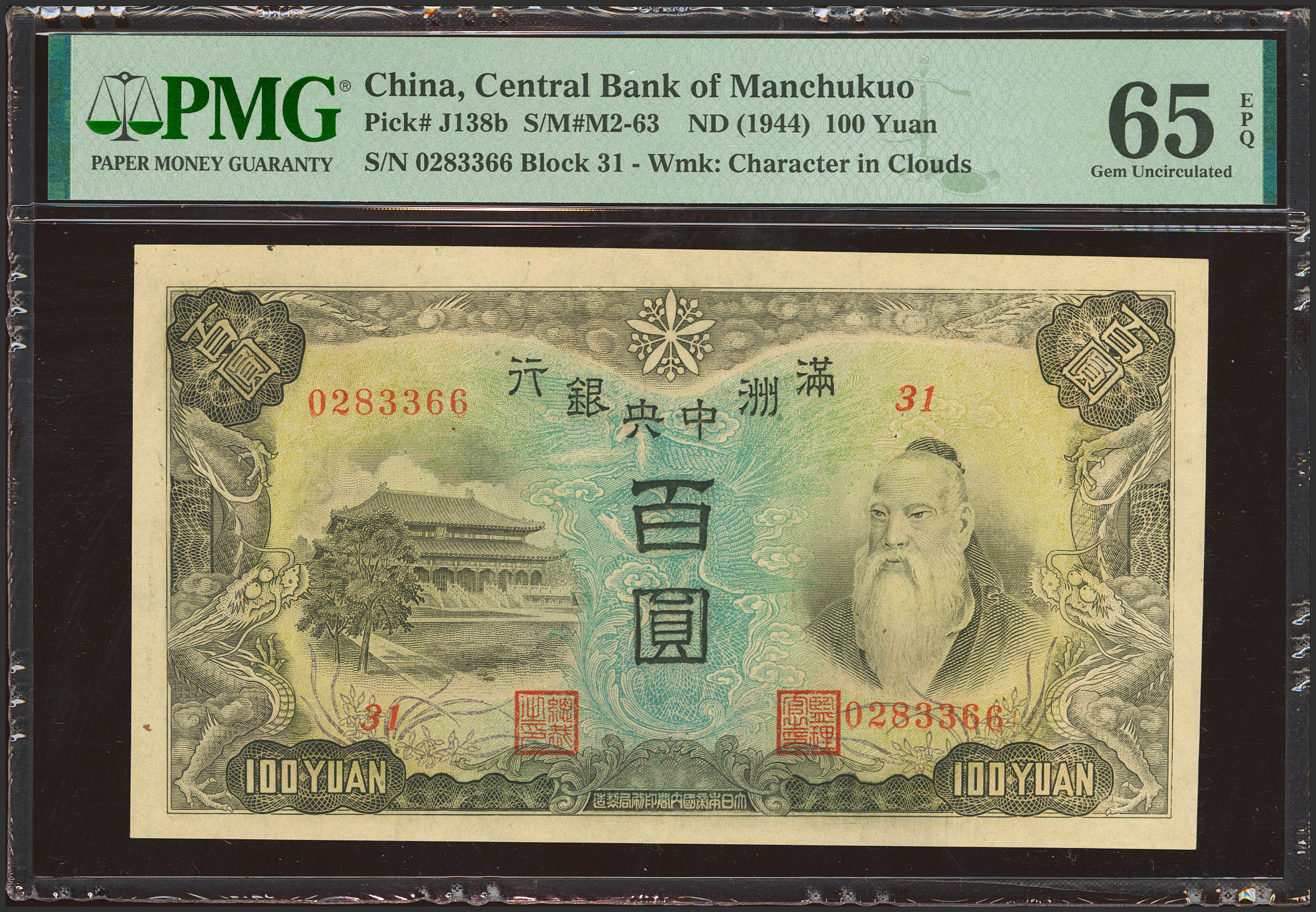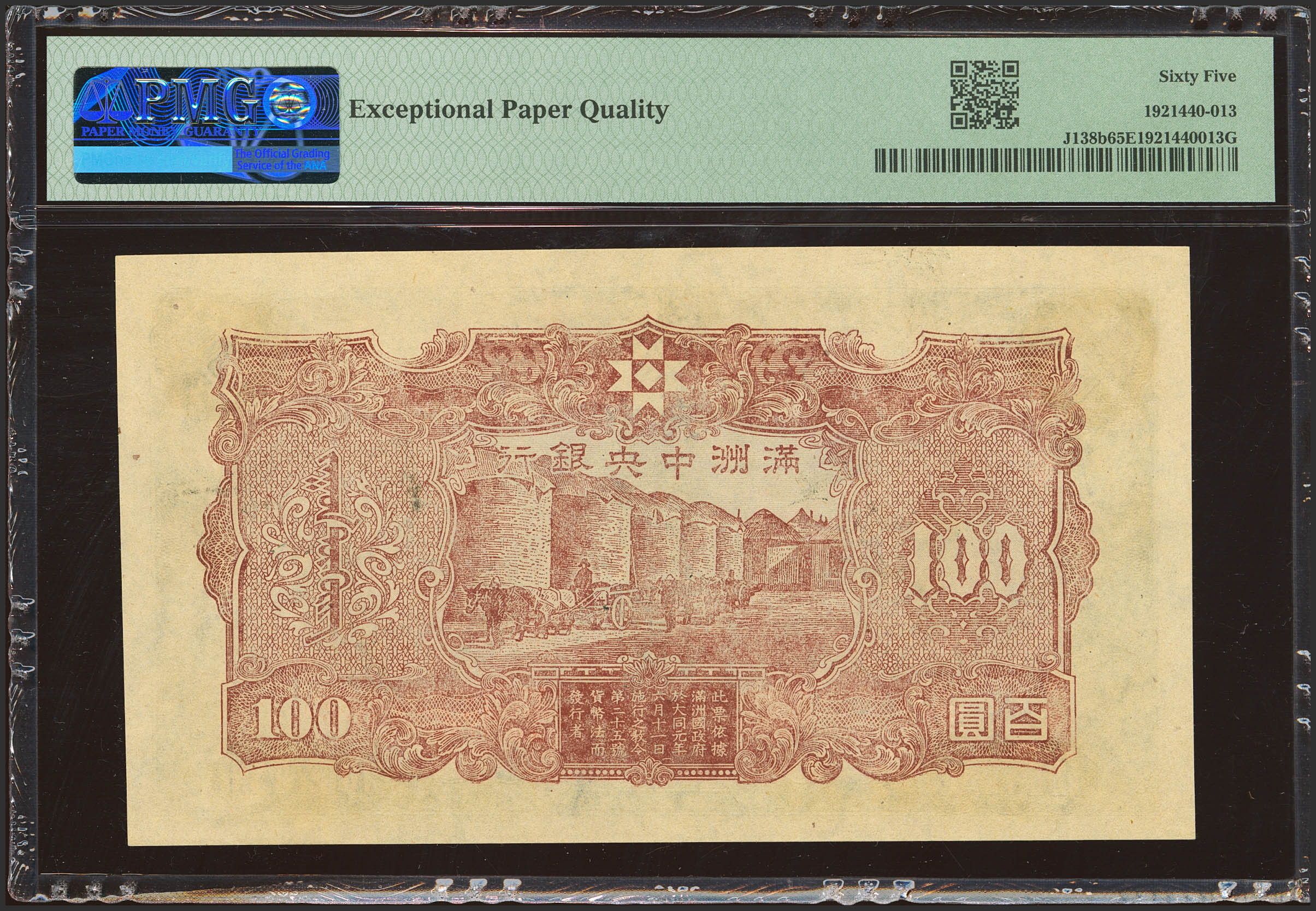 CHINA-MANCHUKUO. 100 Yuan. (1944ca). Central Bank of Manchukuo. (Pick: J138a, SM: M2-63). PMG65EPQ.