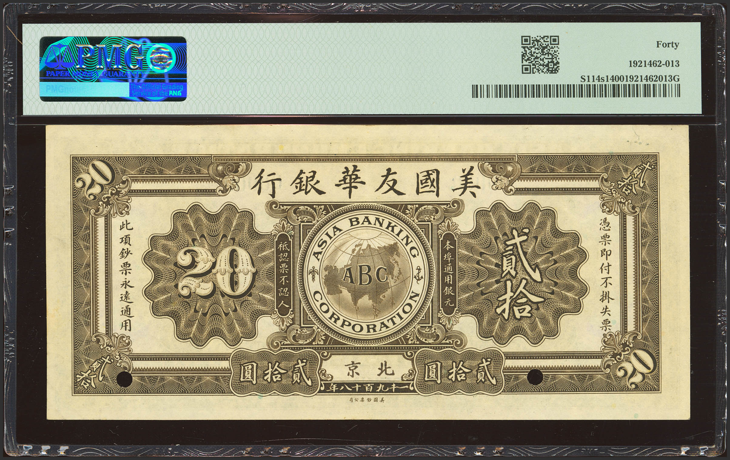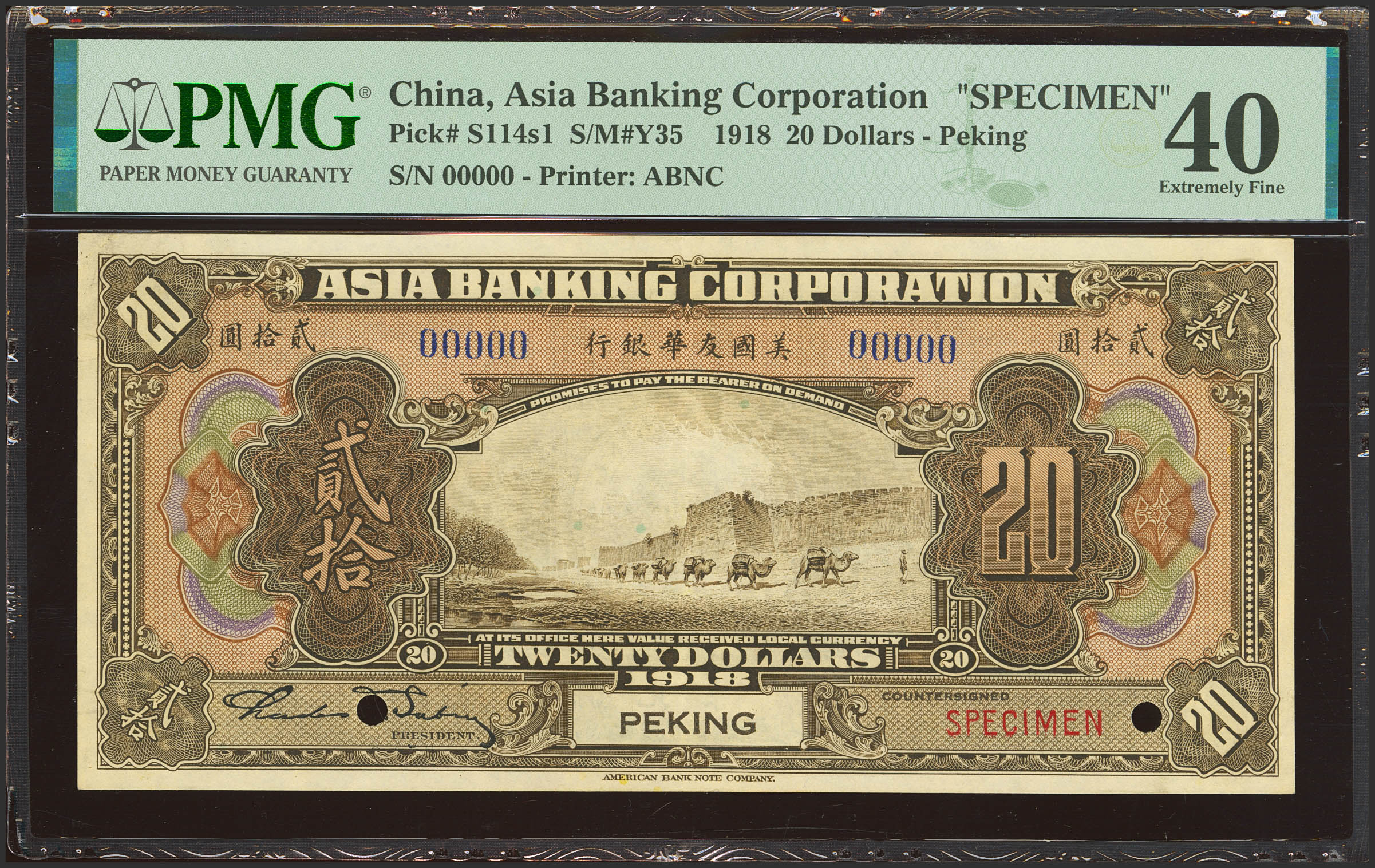 English CHINA. 20 Dollars. 1918. Asia Banking Corporation. Beijing. Specimen. (Pick: S114s1, SM: Y35). PMG40.