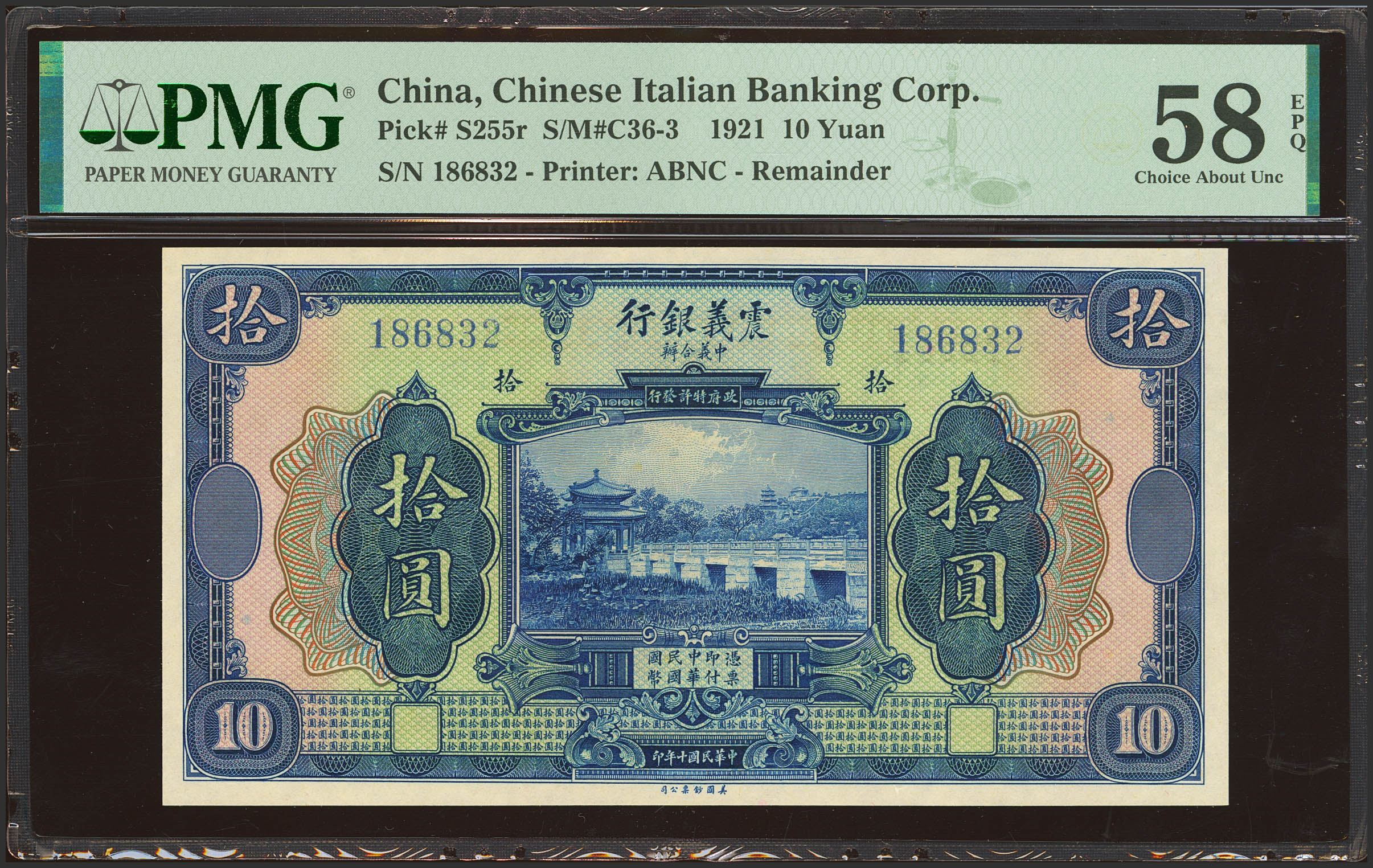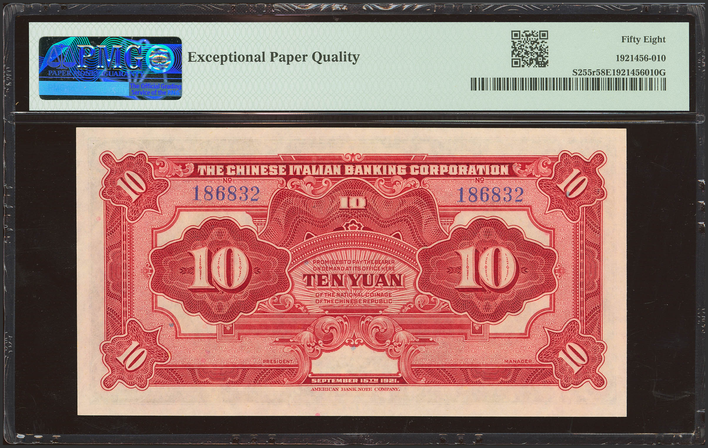 English CHINA. 10 Yuan. 15 September 1921. Chinese Italian Banking Corporation. (Pick: S255, SM: C36-3). PMG58EPQ.