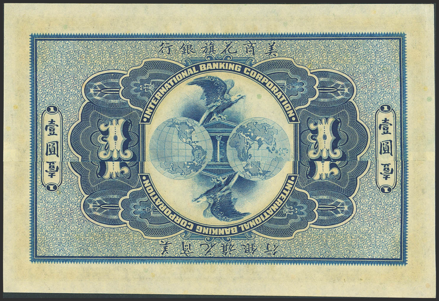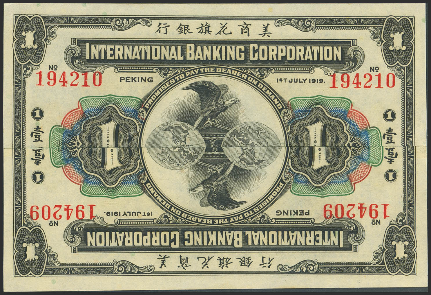 English CHINA. 1 Dollar. 1 July 1919. International Banking Corporation. Beijing. (Pick: S417). Two half banknotes, both showing the upper portion, glued together at the middle. Uncirculated.