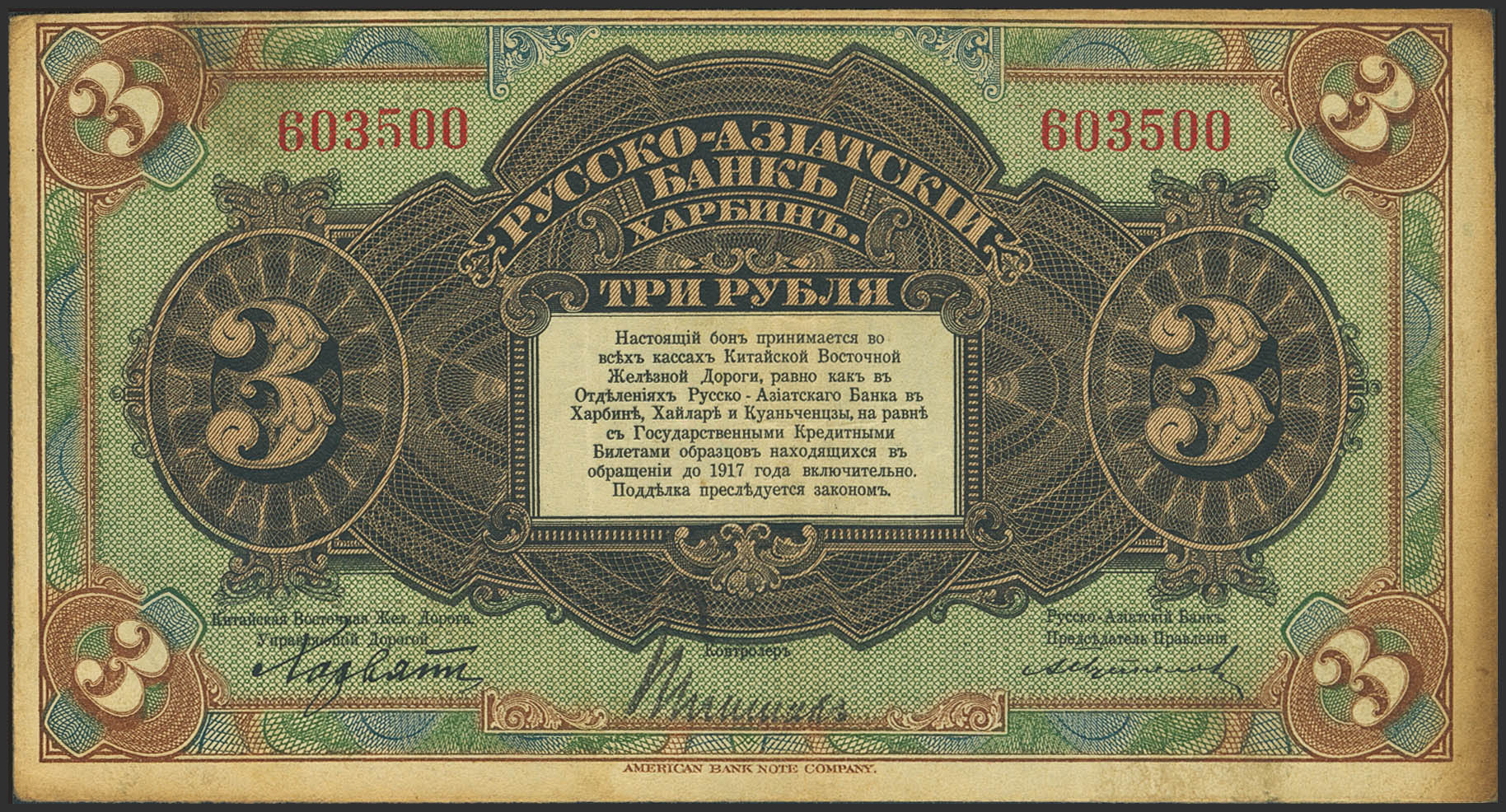 CHINA. 3 Rubles. (1917ca). Russo Asiatic Bank. Harbin. (Pick: S475a). More than Very Fine.