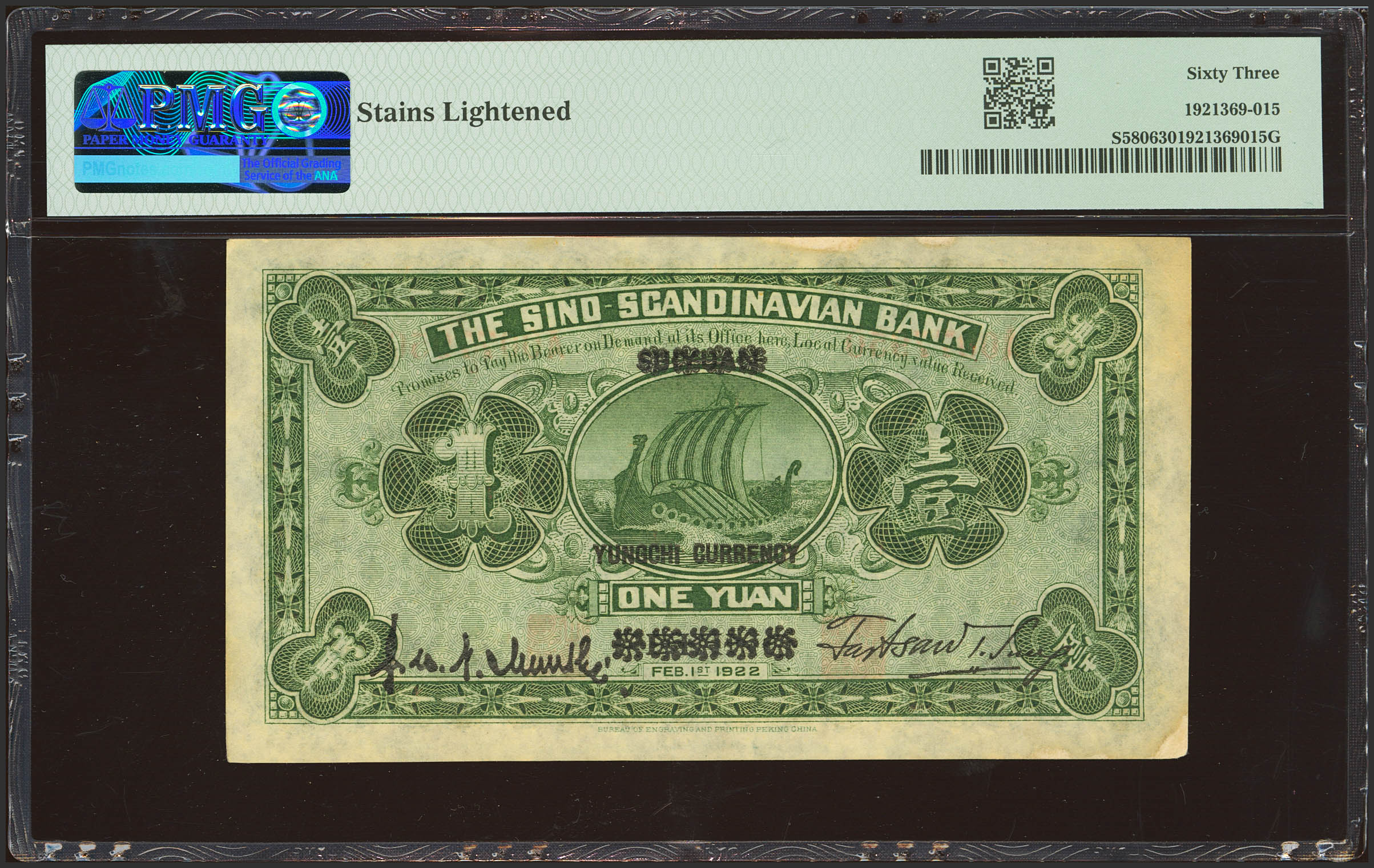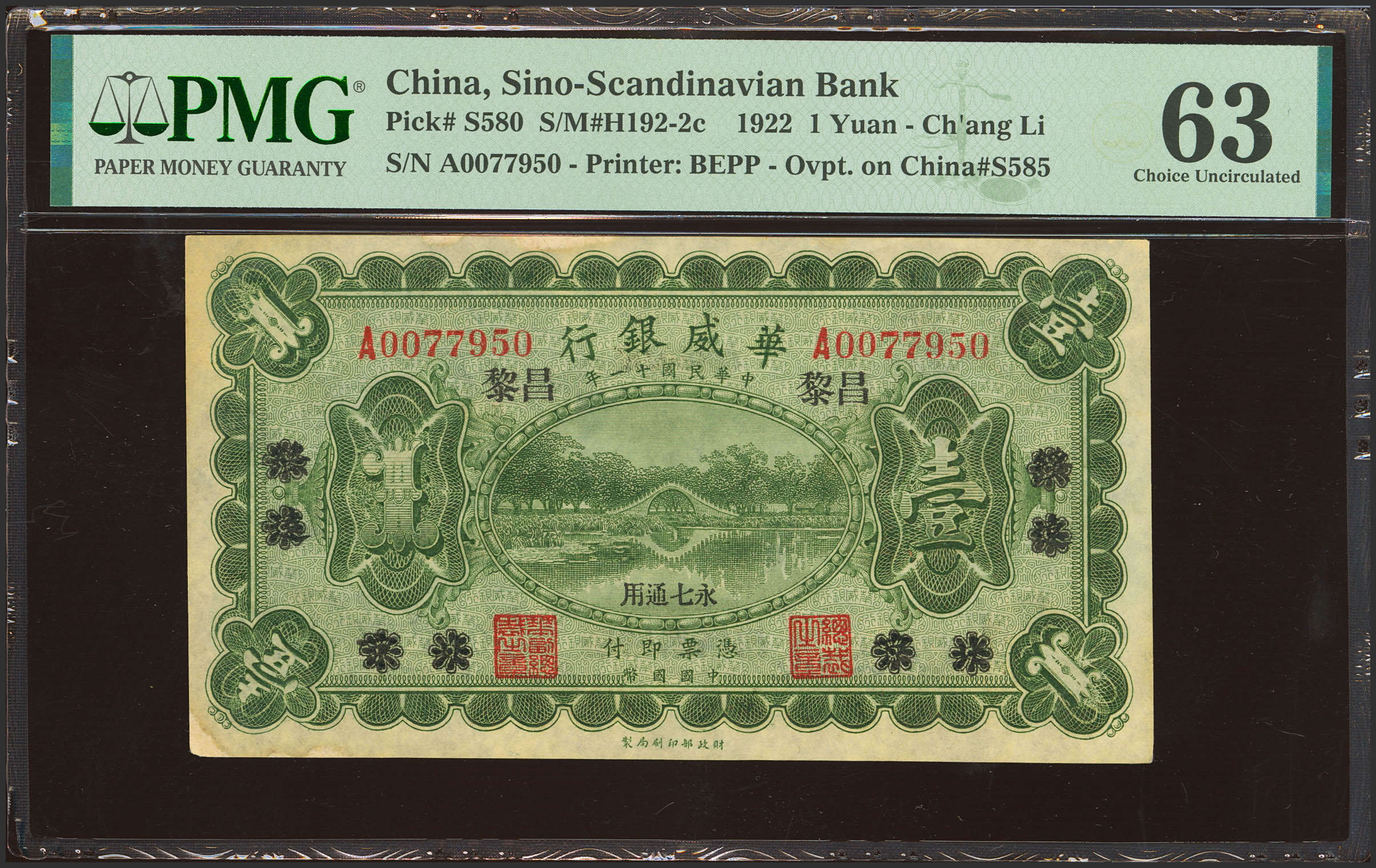 CHINA. 1 Yuan. 1 February 1922. Sino-Scandinavian Bank. Ch'ang Li. (Pick: S580, SM: H192-2c). PMG63 (lightened stains).