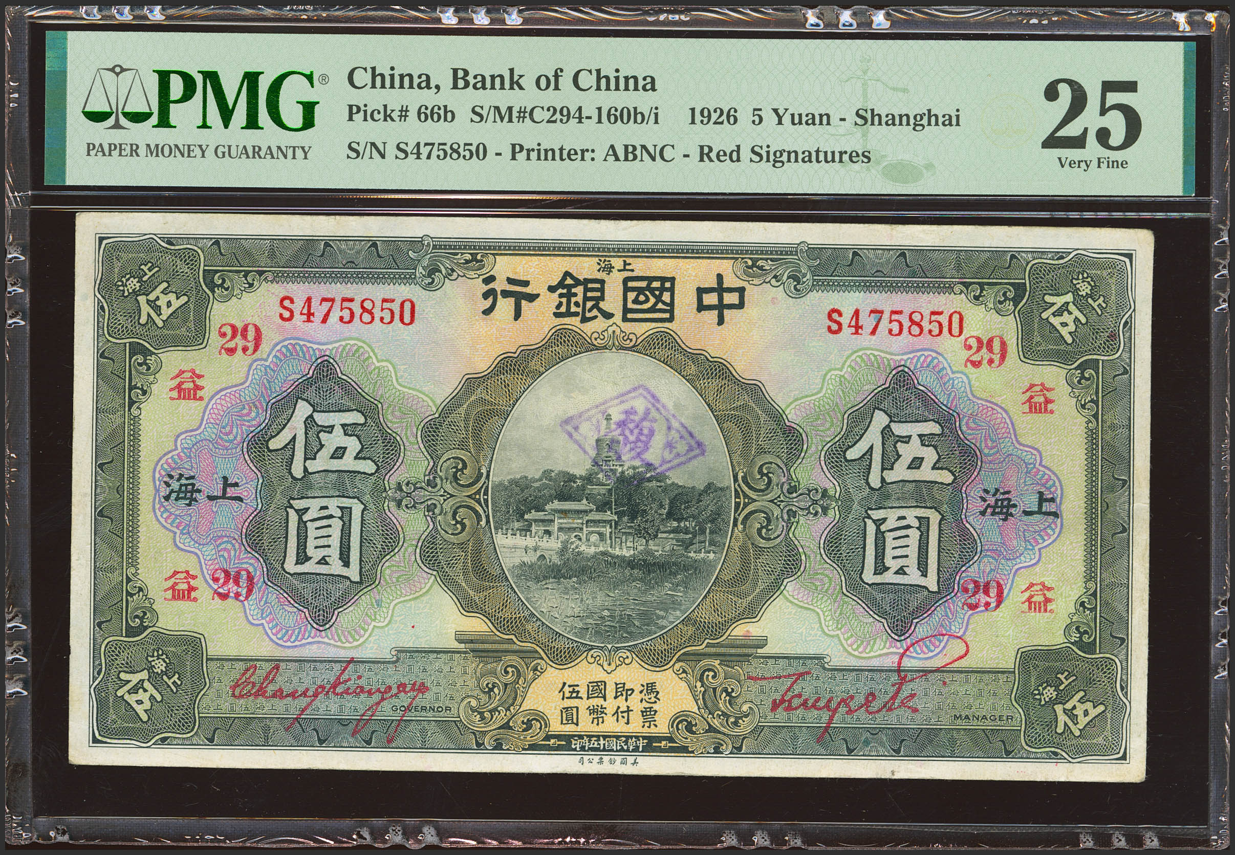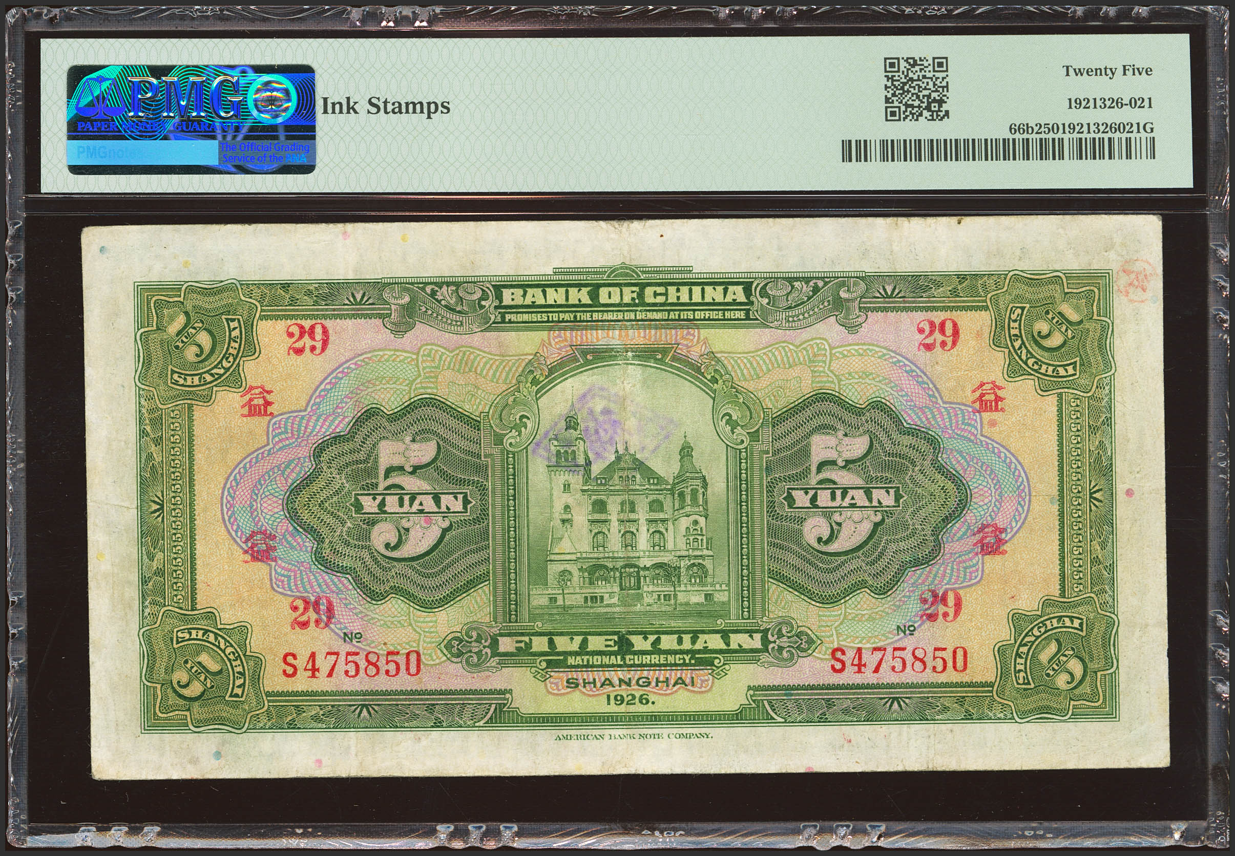 English CHINA. 5 Yuan. 1926. Bank of China. Shanghai. Zhang Jia'ao / Bei Zuyi. (Pick: 66b, SM: C294-160b/i). PMG25 (ink stamp).